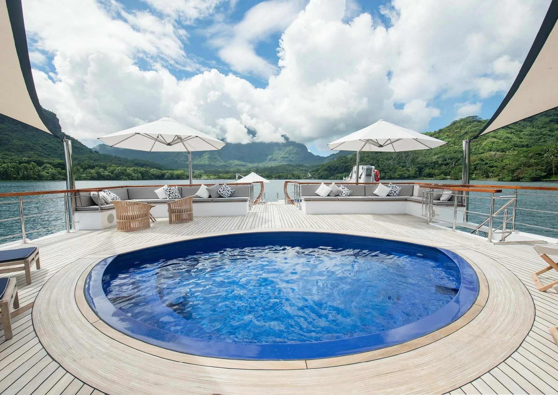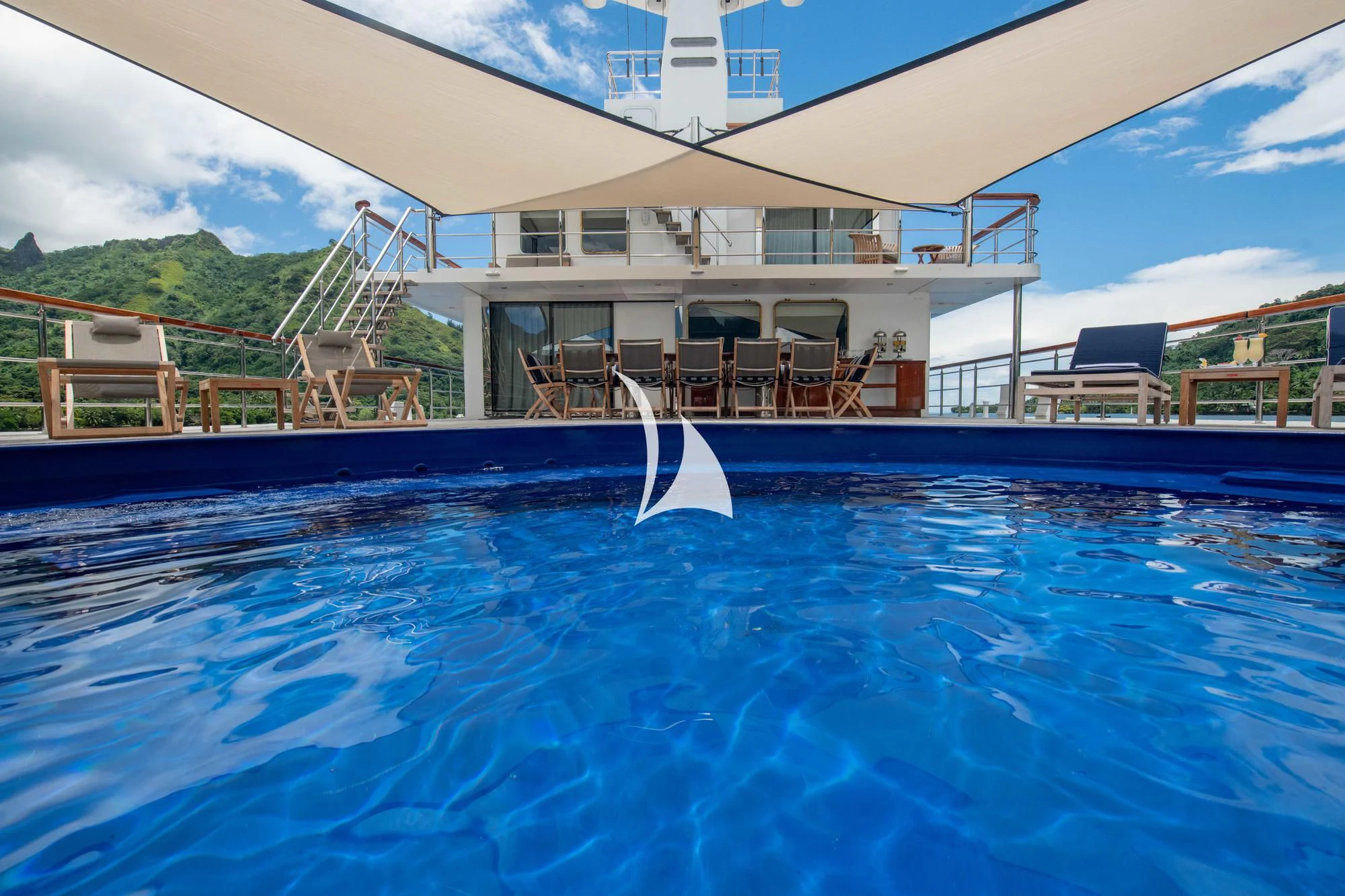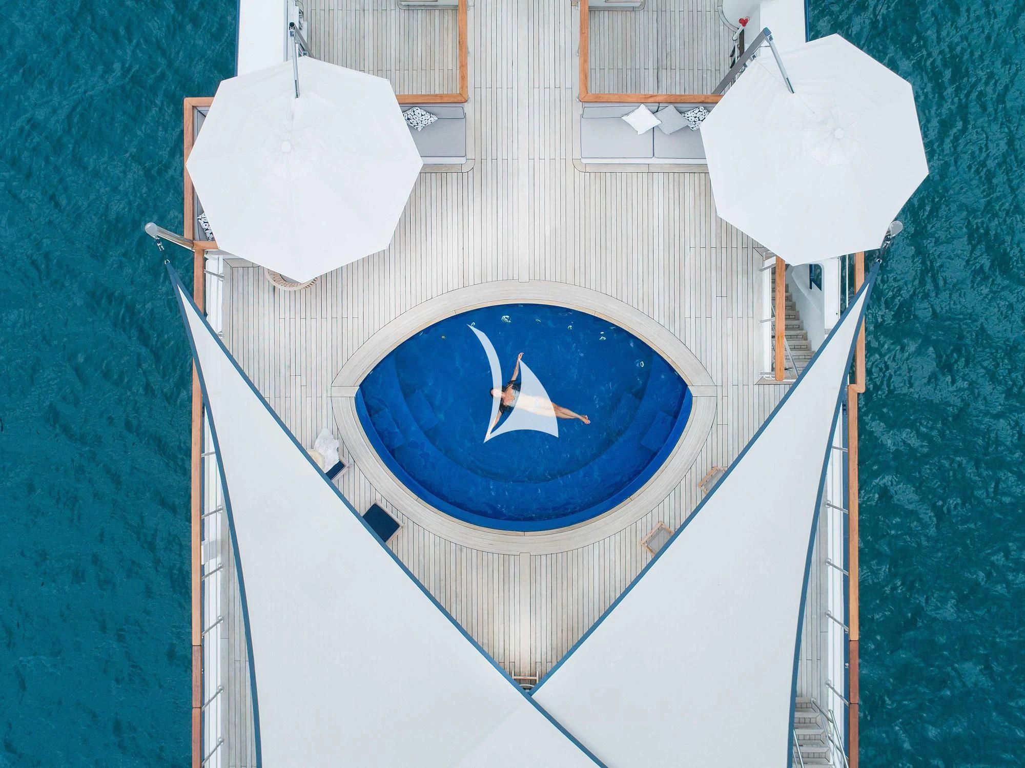 Furthermore, if you fancy cooling off during hot summer days or simply enjoy swimming under starlit skies - dive into our onboard swimming pool; it adds another layer of luxury experience aboard LATITUDE.