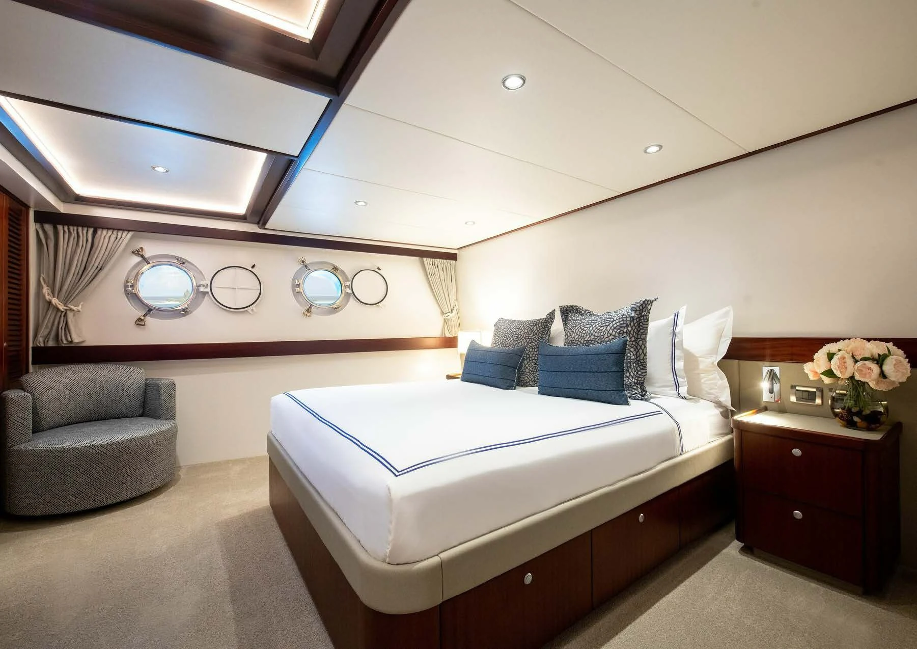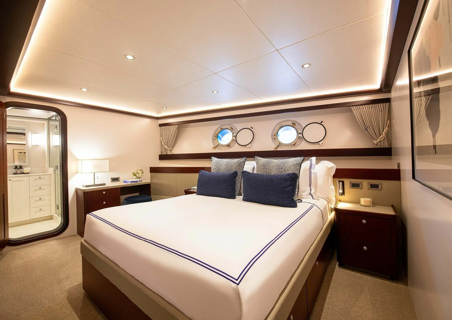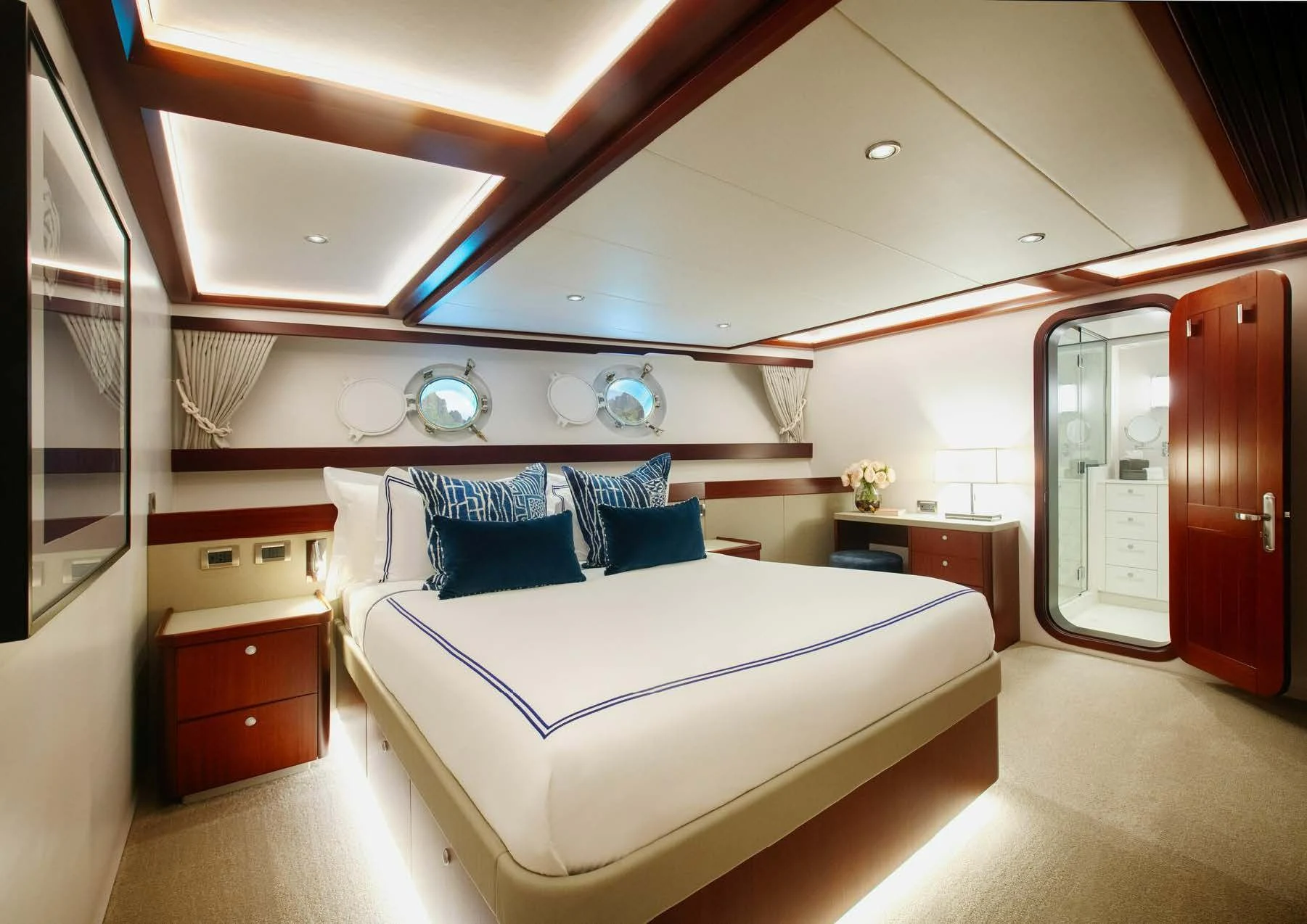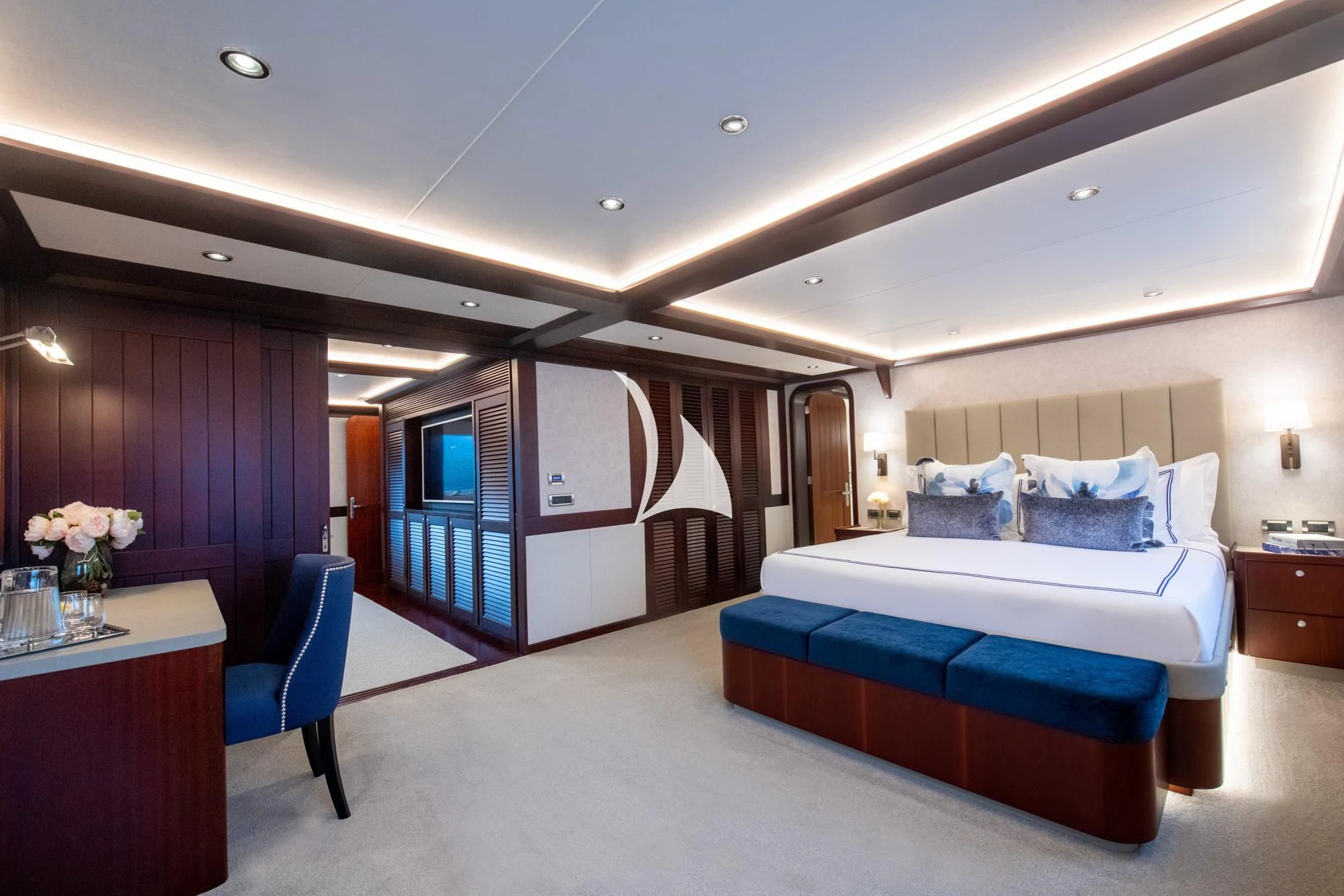 Step inside LATITUDE and be welcomed by an atmosphere radiating sophistication and comfort. The interior design seamlessly blends modern aesthetics with classic elegance, creating spaces that are both inviting and stylishly appointed. Accommodating up to twelve guests across six luxurious cabins ensures privacy and tranquillity during your voyage. The master stateroom is nothing short of spectacular, offering plush interiors marked by high-quality materials and exquisite craftsmanship.