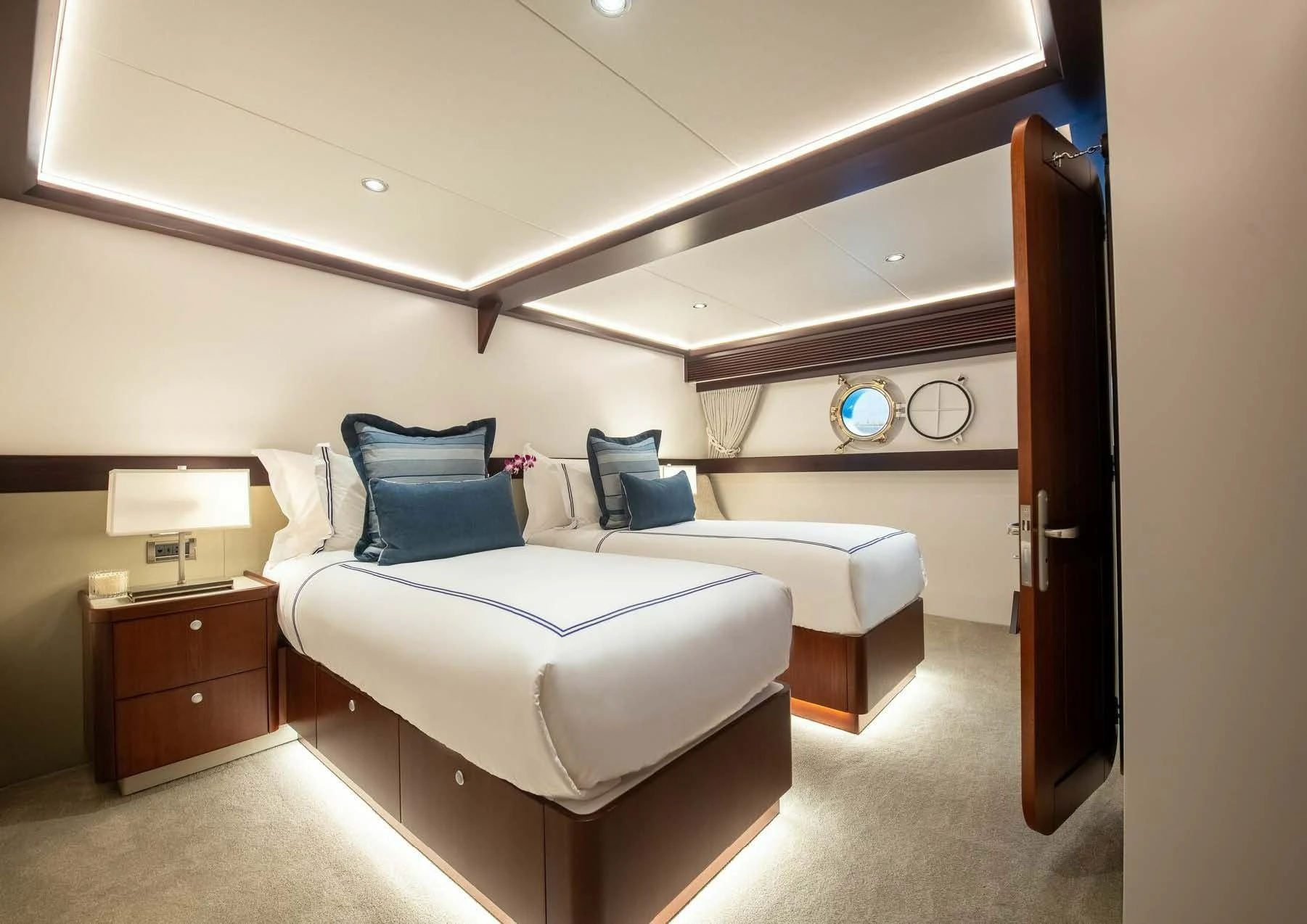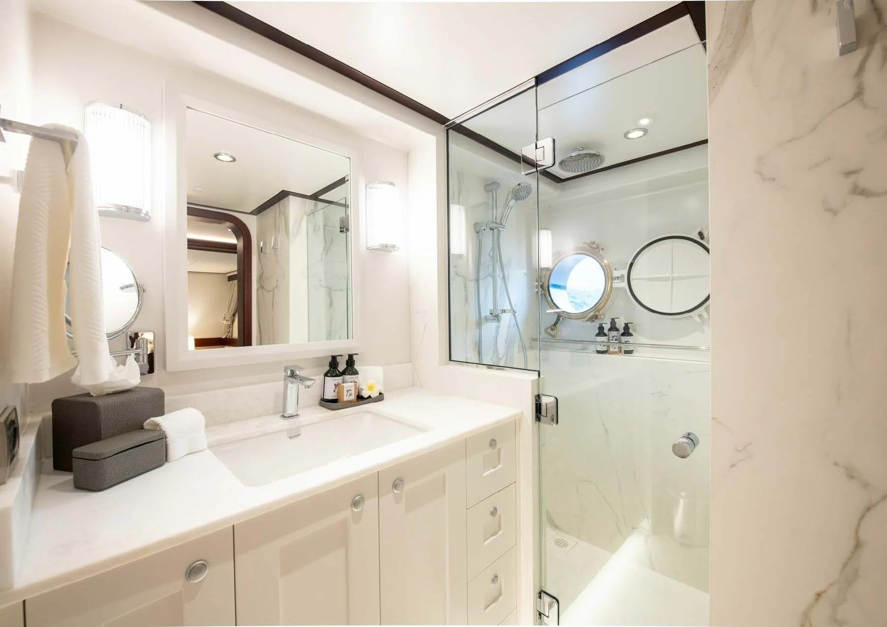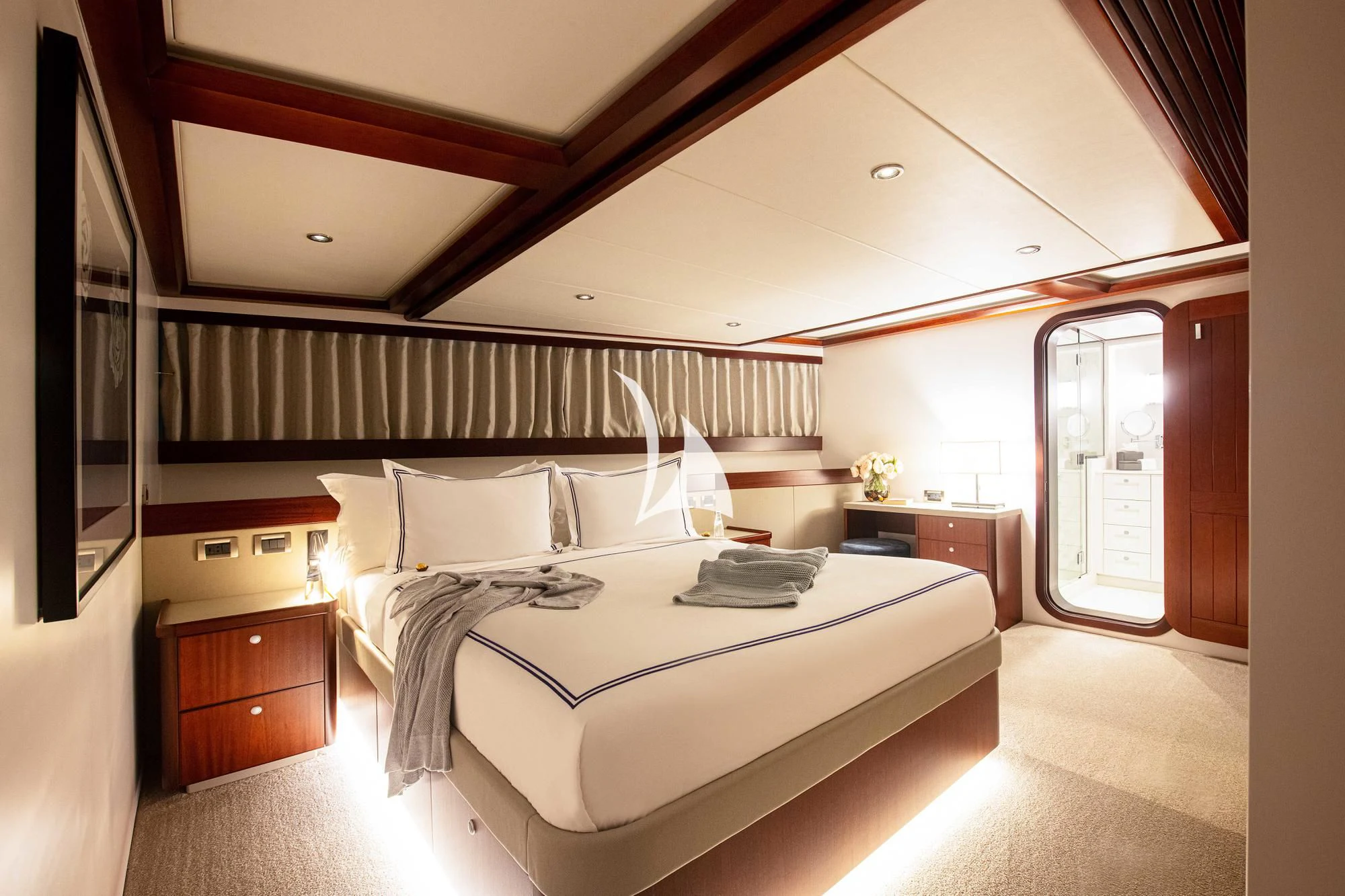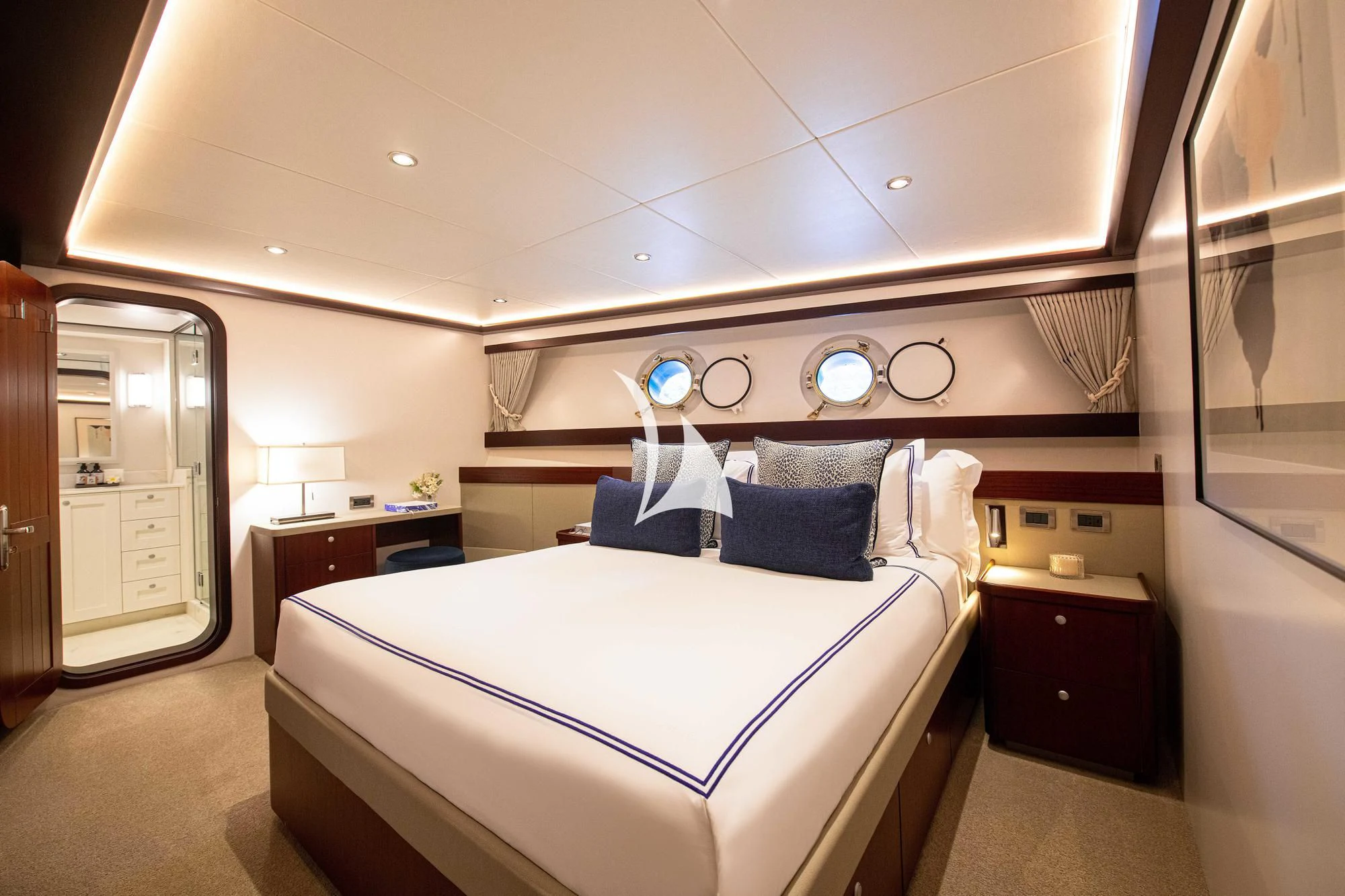 Step inside LATITUDE and be welcomed by an atmosphere radiating sophistication and comfort. The interior design seamlessly blends modern aesthetics with classic elegance, creating spaces that are both inviting and stylishly appointed. Accommodating up to twelve guests across six luxurious cabins ensures privacy and tranquillity during your voyage. The master stateroom is nothing short of spectacular, offering plush interiors marked by high-quality materials and exquisite craftsmanship.