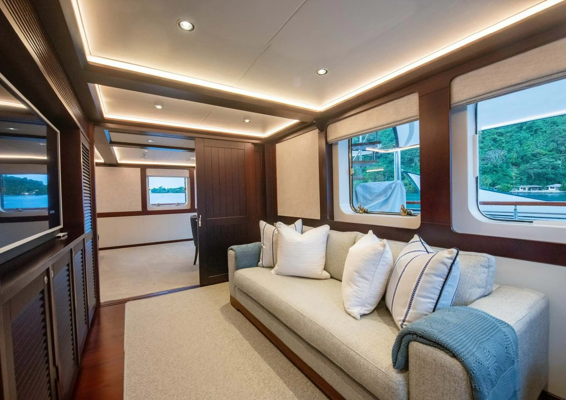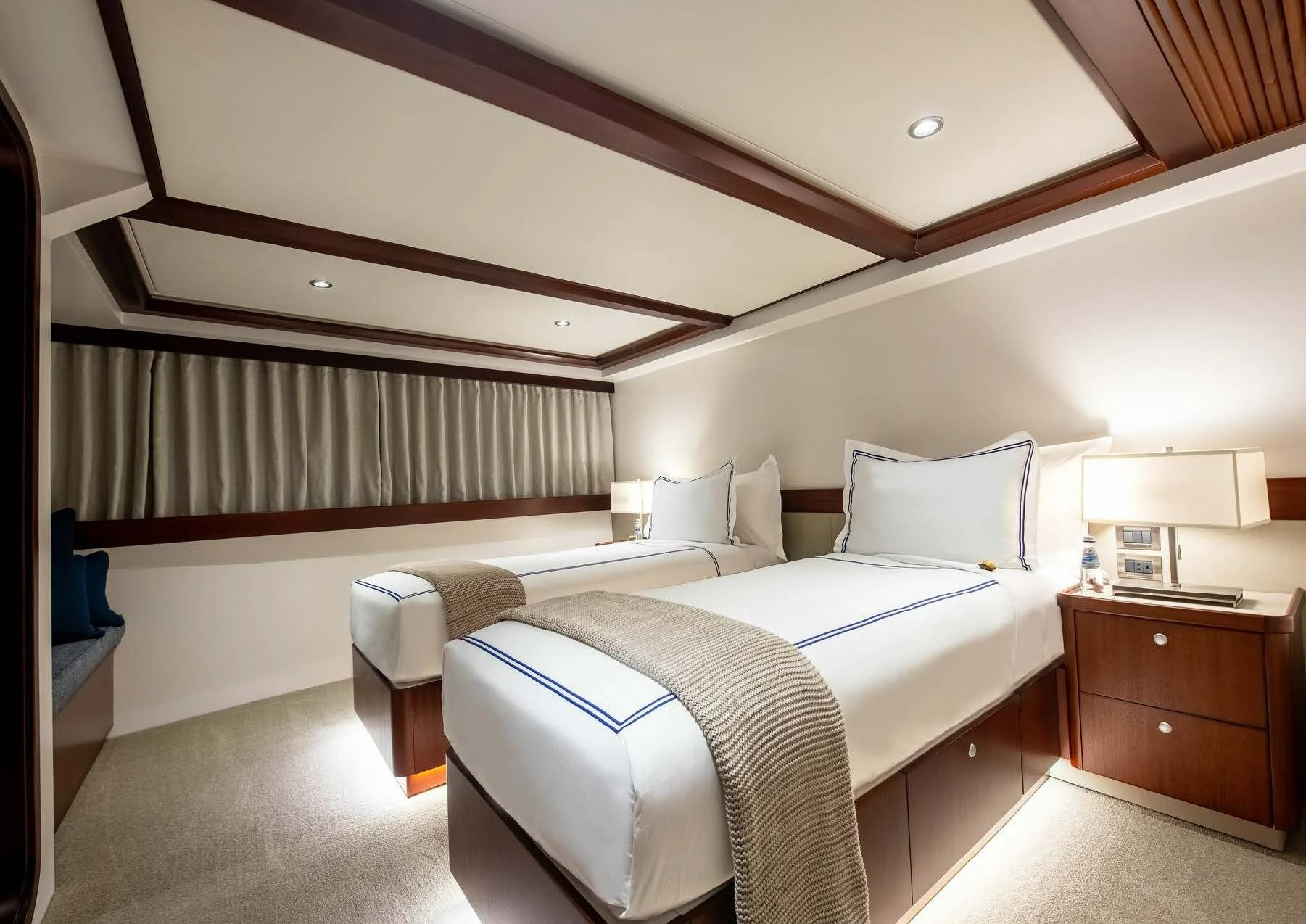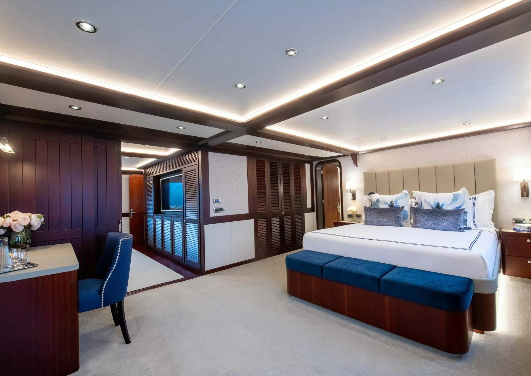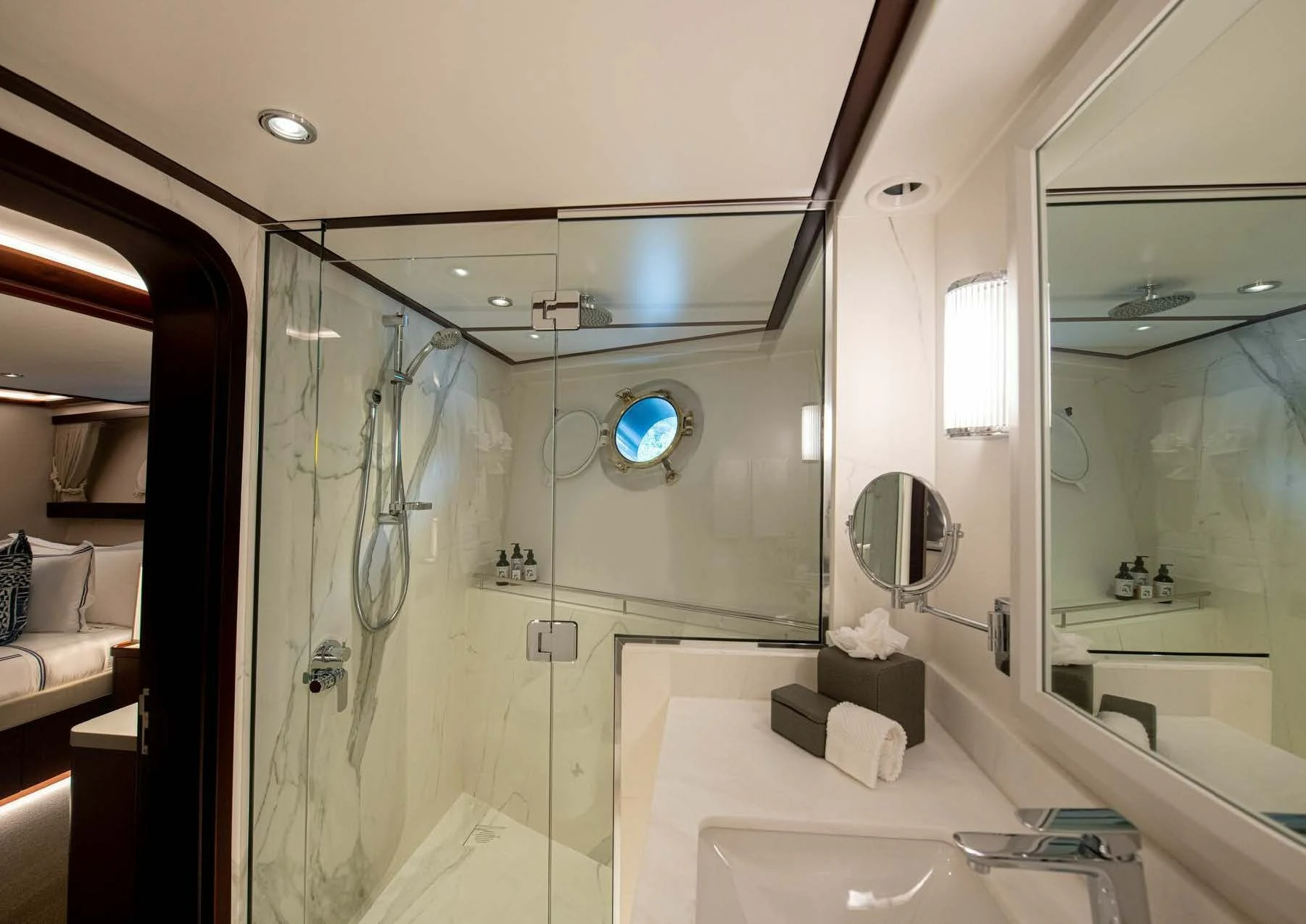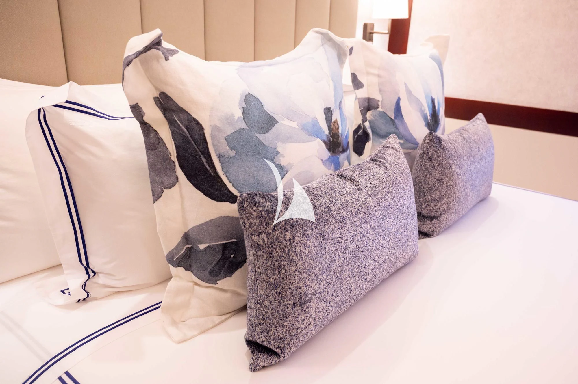 Step inside LATITUDE and be welcomed by an atmosphere radiating sophistication and comfort. The interior design seamlessly blends modern aesthetics with classic elegance, creating spaces that are both inviting and stylishly appointed. Accommodating up to twelve guests across six luxurious cabins ensures privacy and tranquillity during your voyage. The master stateroom is nothing short of spectacular, offering plush interiors marked by high-quality materials and exquisite craftsmanship.