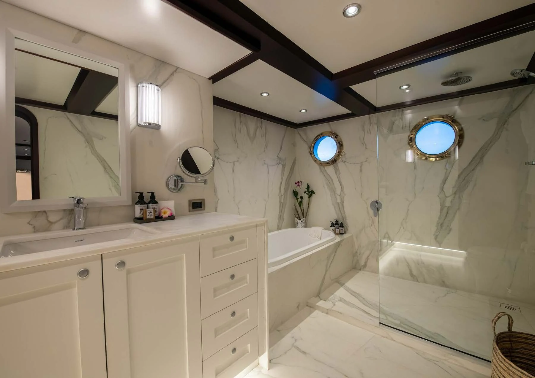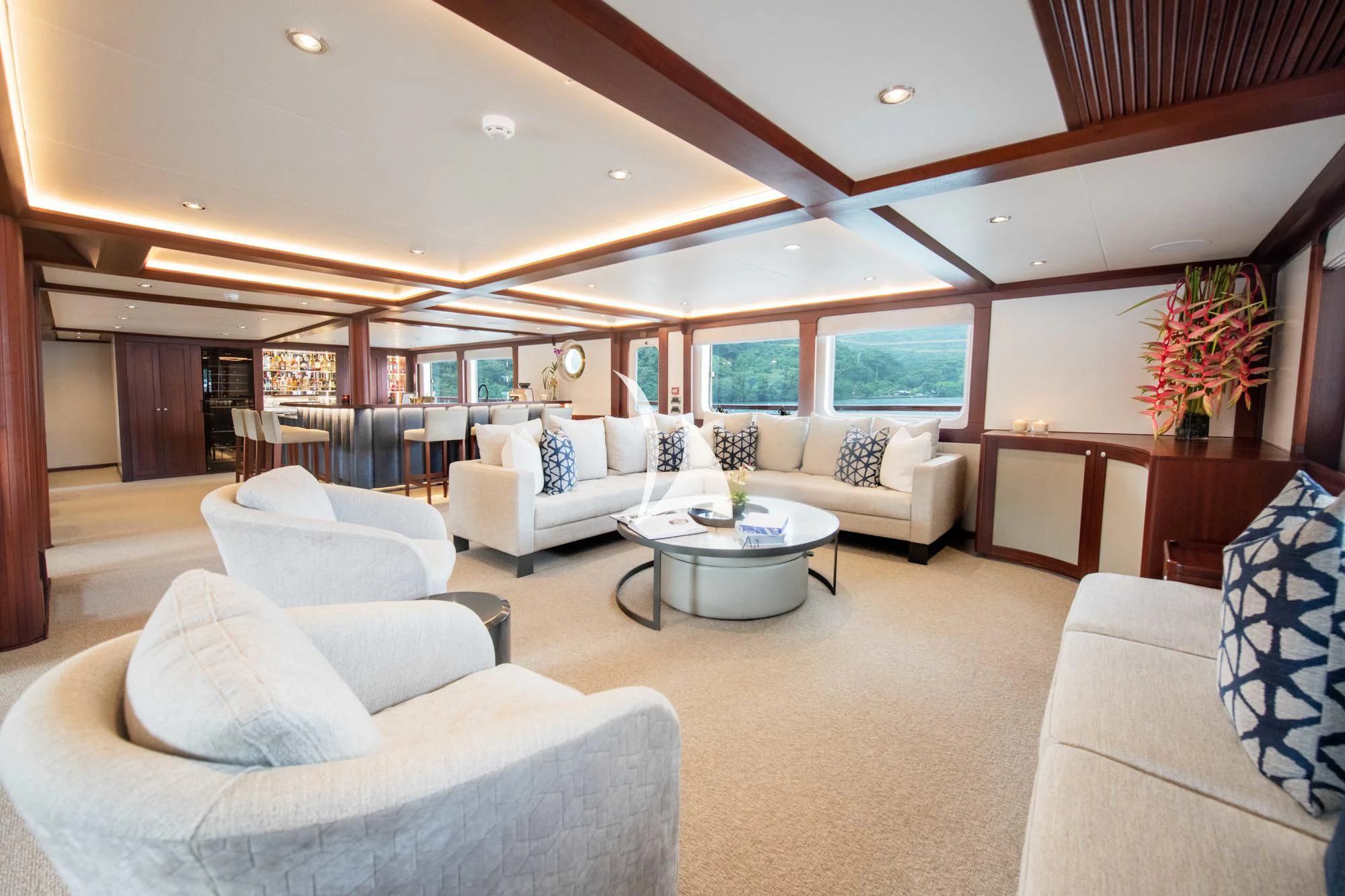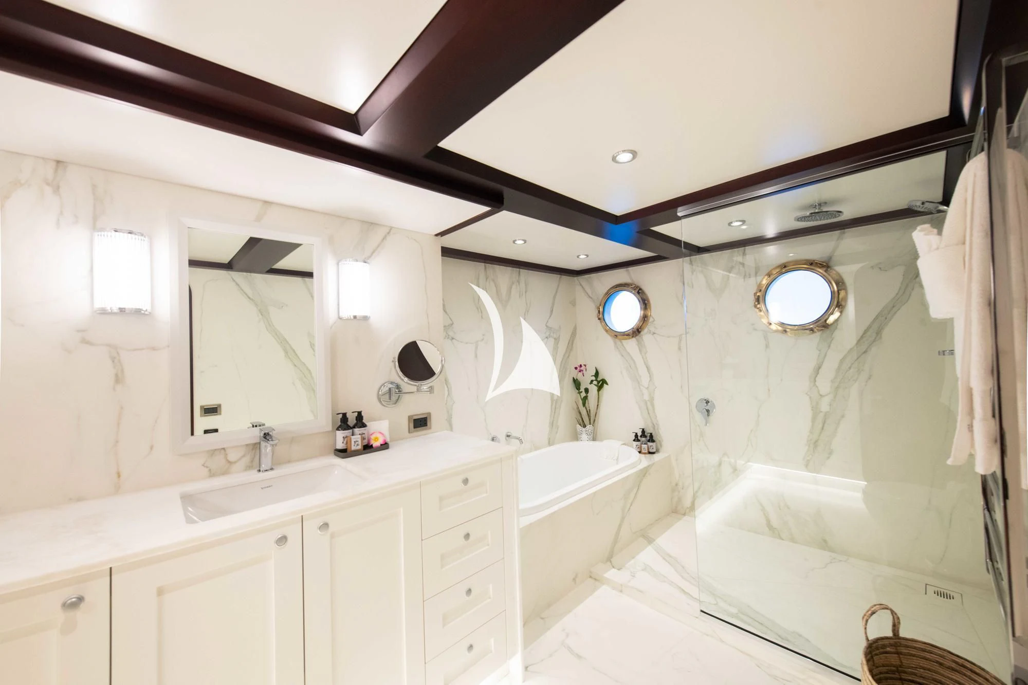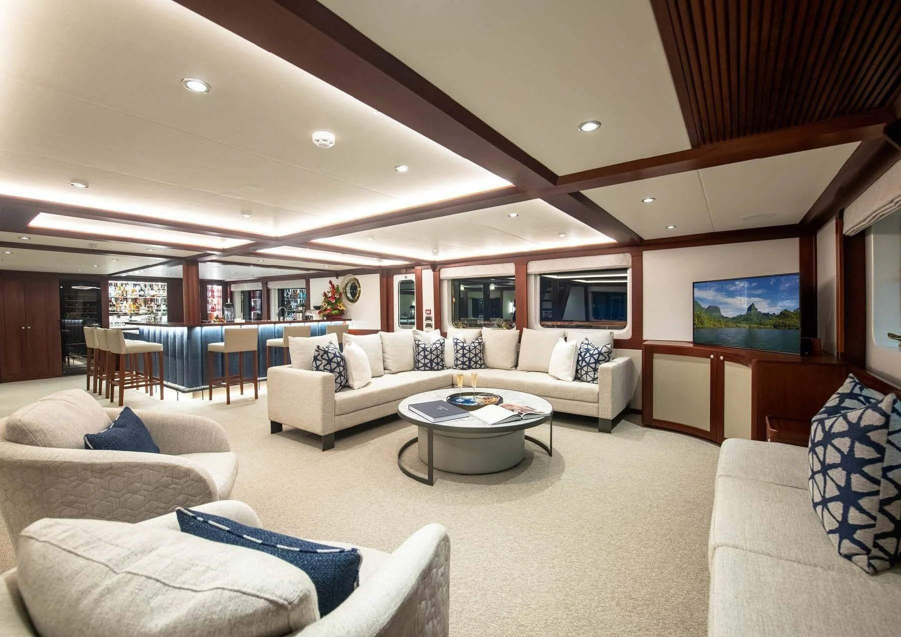 Step inside LATITUDE and be welcomed by an atmosphere radiating sophistication and comfort. The interior design seamlessly blends modern aesthetics with classic elegance, creating spaces that are both inviting and stylishly appointed. Accommodating up to twelve guests across six luxurious cabins ensures privacy and tranquillity during your voyage. The master stateroom is nothing short of spectacular, offering plush interiors marked by high-quality materials and exquisite craftsmanship.