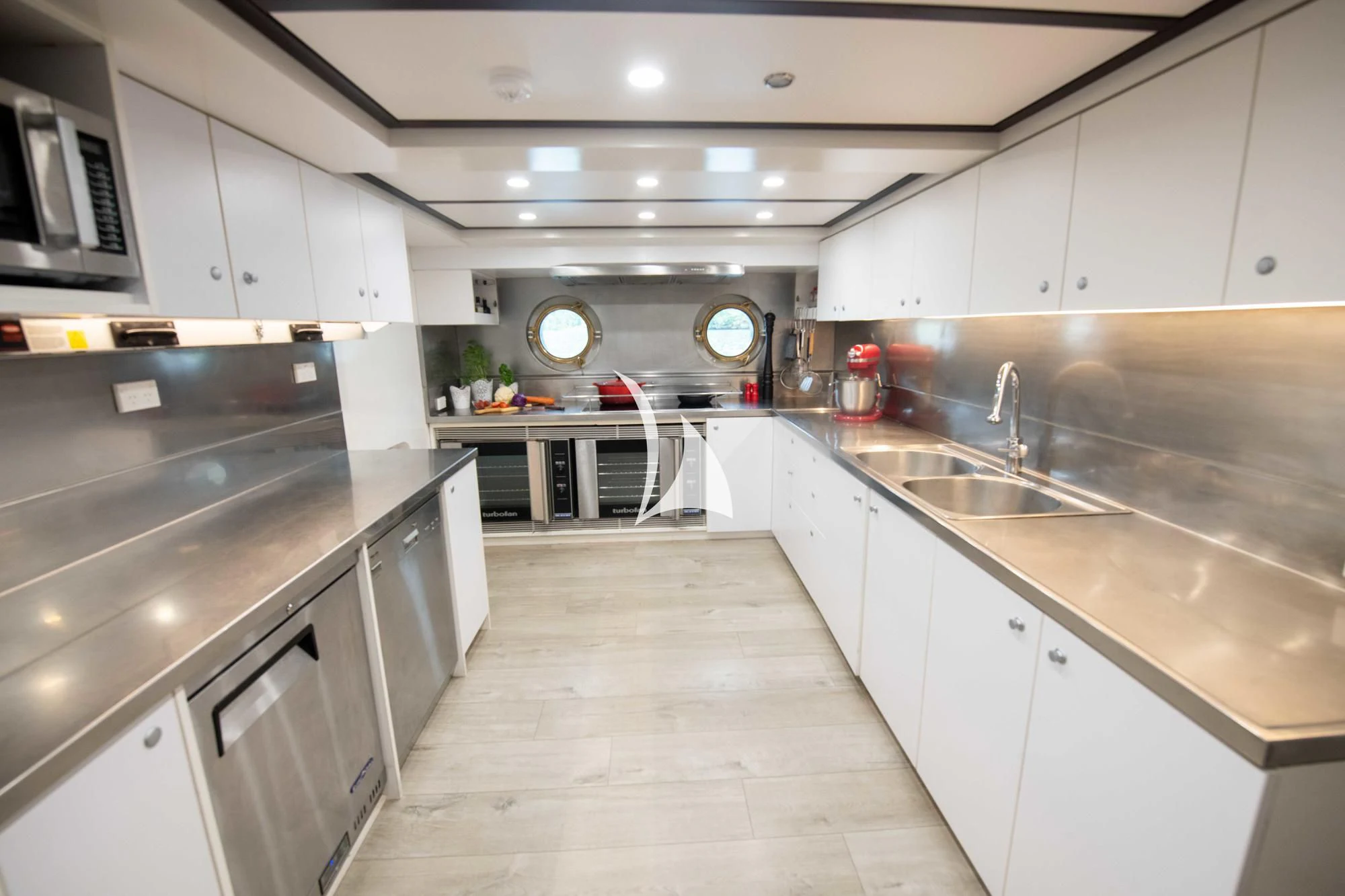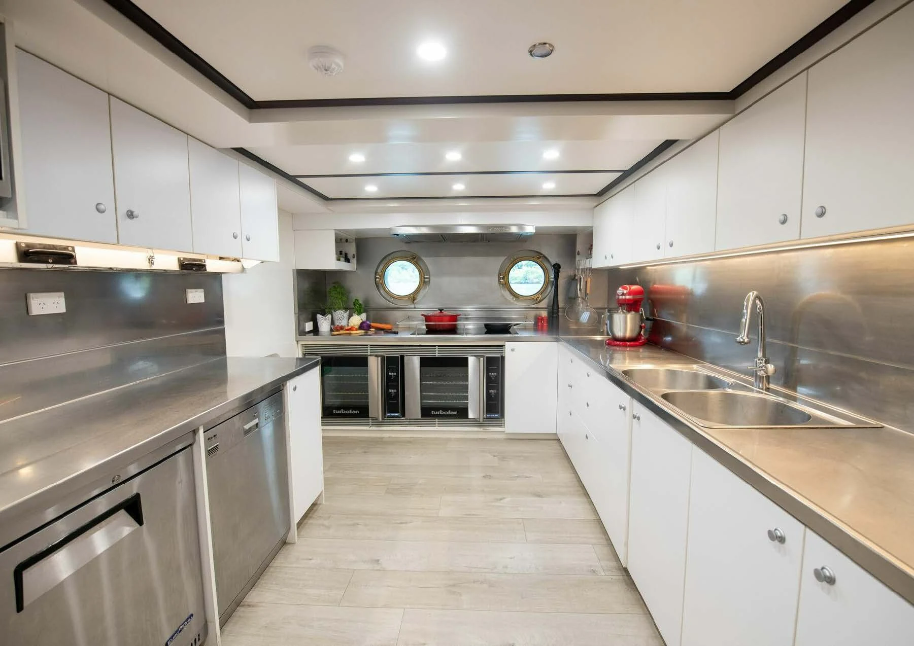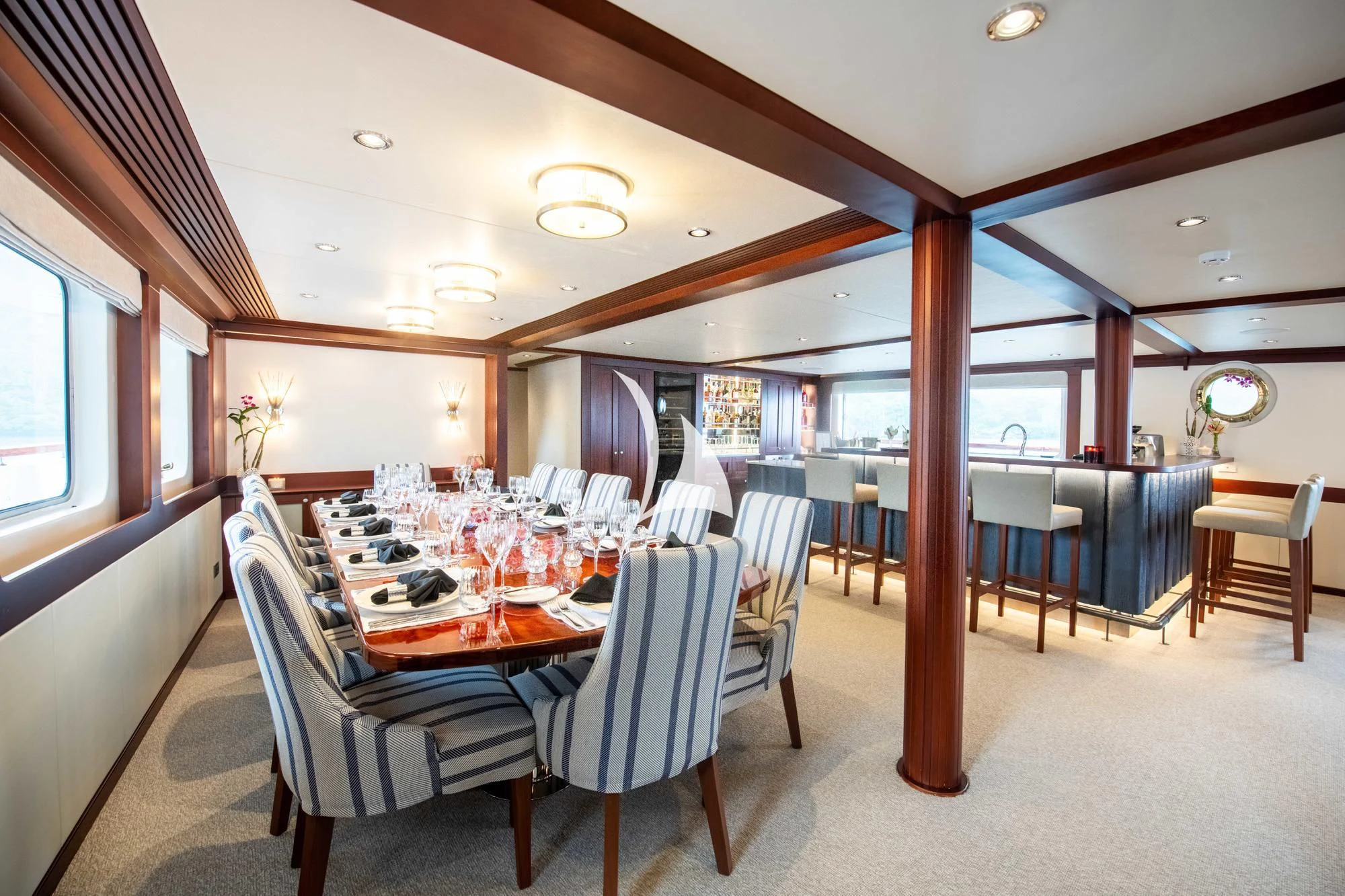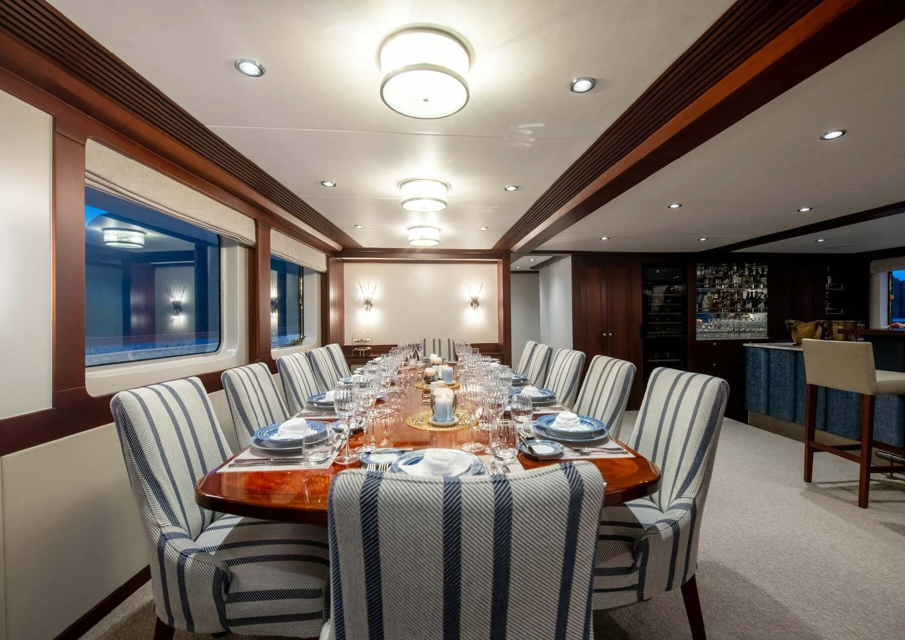 Step inside LATITUDE and be welcomed by an atmosphere radiating sophistication and comfort. The interior design seamlessly blends modern aesthetics with classic elegance, creating spaces that are both inviting and stylishly appointed. Accommodating up to twelve guests across six luxurious cabins ensures privacy and tranquillity during your voyage. The master stateroom is nothing short of spectacular, offering plush interiors marked by high-quality materials and exquisite craftsmanship.