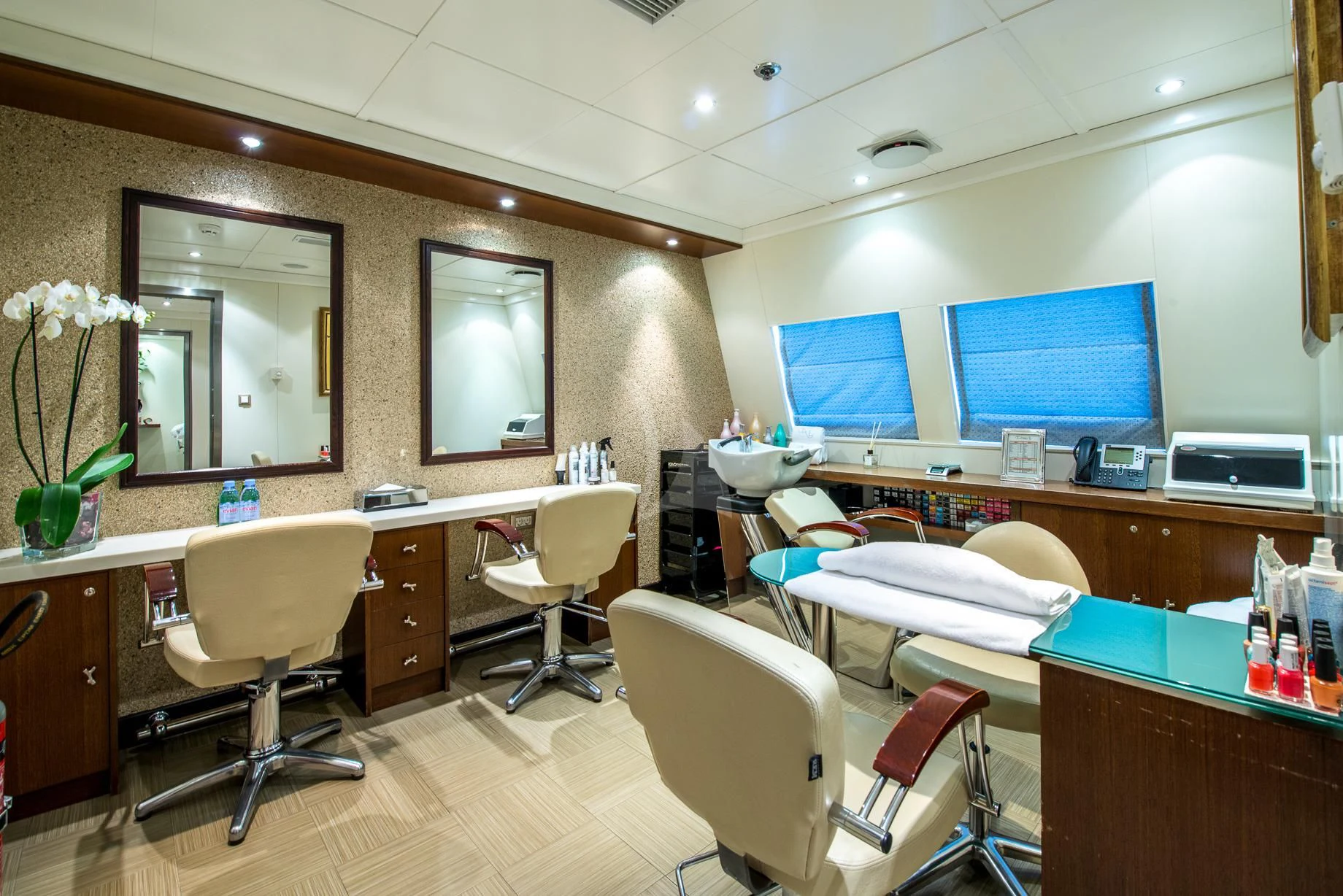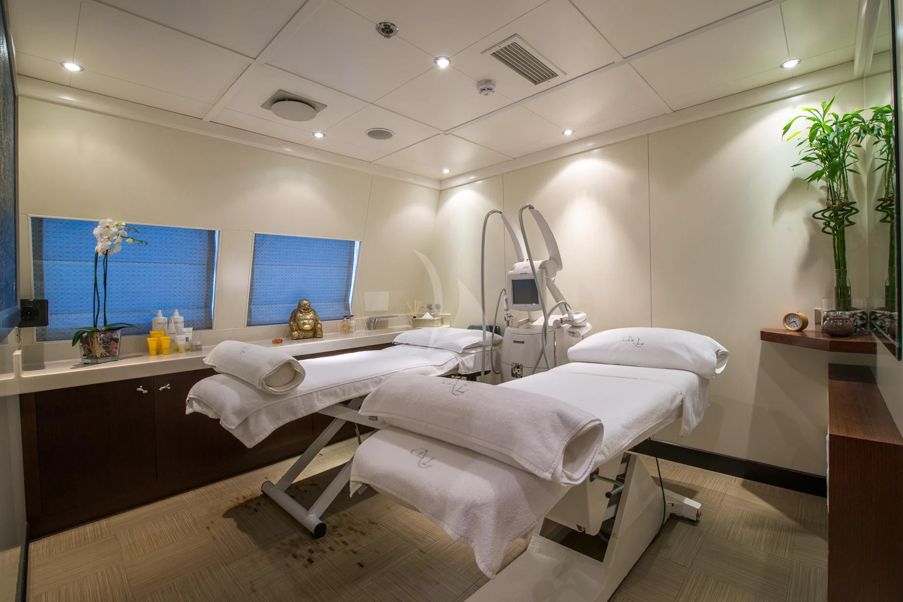 The amenities onboard LAUREN L are nothing short of spectacular – from the state-of-the-art conference room designed for conducting high-level meetings on the go, to the well-equipped gym for fitness enthusiasts who never miss their workout routine even while sailing across oceans. For relaxation seekers, there’s a dedicated masseuse ready to knead away your stress; or you could simply unwind in the steam room or sauna after a long day exploring exotic ports.