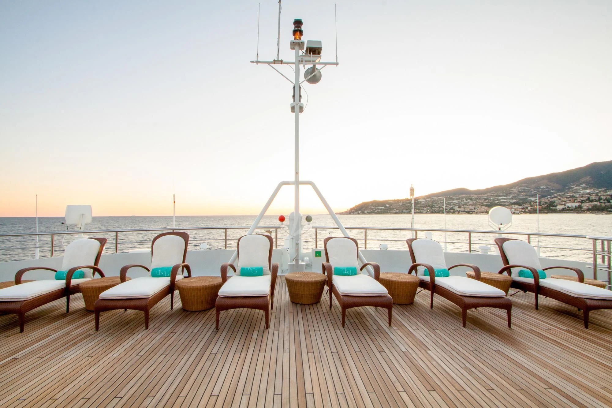 LAUREN L's exterior presents itself as a masterful blend of power and elegance. Her sleek silhouette is punctuated by expansive deck areas that invite guests to relish in the open air while cruising at a leisurely pace of up to 15 knots. The sundecks are perfect for sun worshipers seeking tranquility under azure skies, while alfresco dining areas provide an intimate setting for gourmet meals with panoramic views. A helipad adds another layer of convenience for those arriving in style.