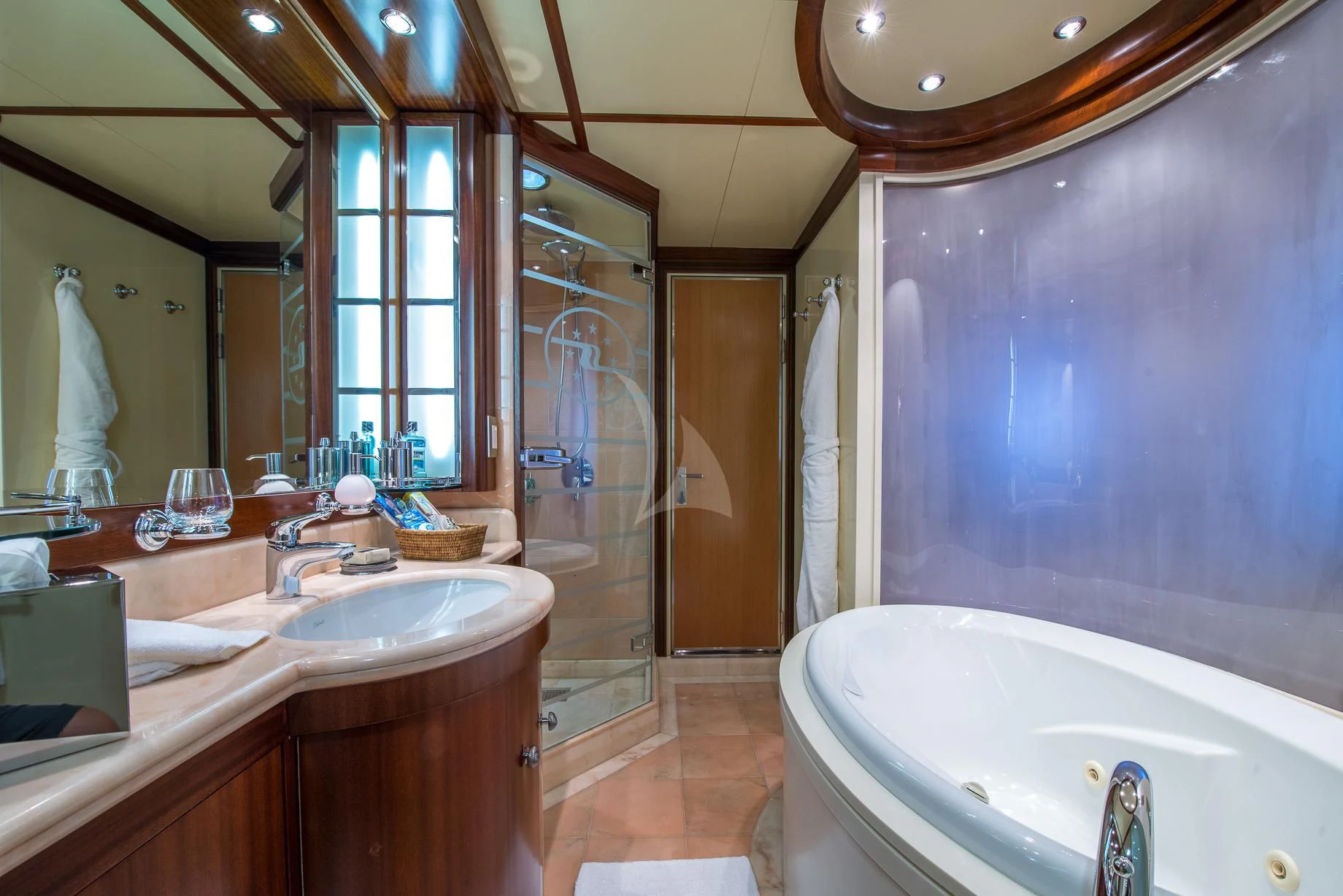 Step aboard LAUREN L and immerse yourself in an interior that exudes opulence at every turn. She comfortably accommodates up to 40 guests across her twenty plush cabins, each one radiating warmth through tastefully chosen color palettes and intricate design elements. The master stateroom stands as an epitome of luxury living on water – spacious, lavishly furnished, and offering breathtaking ocean views from its private balcony.