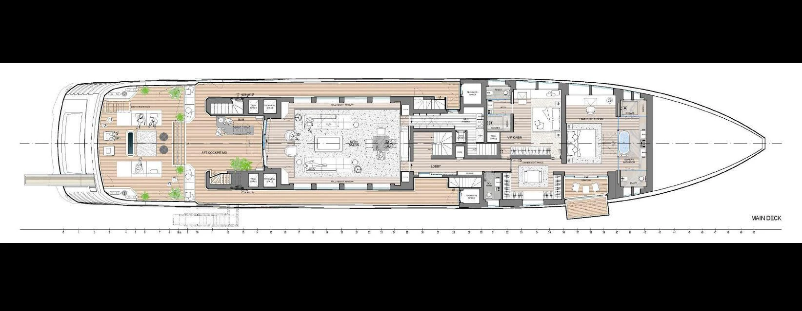 Constructed with an aluminium hull, this maxi-category beauty boasts a beam measurement of 29 feet 6 inches (9 meters) granting generous space for both exterior and interior amenities. The exterior design reflects a contemporary elegance, its sleek lines cutting through the water at cruising speeds of 21 knots, while capable of reaching exhilarating top speeds of 25 knots powered by two MTU 12V 4000 M93L engines producing an astounding combined power output of 3460 hp /2580 kW.