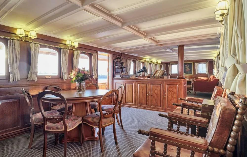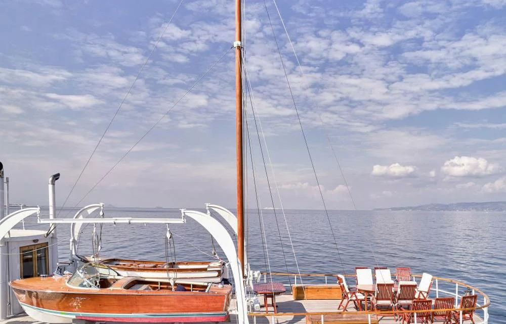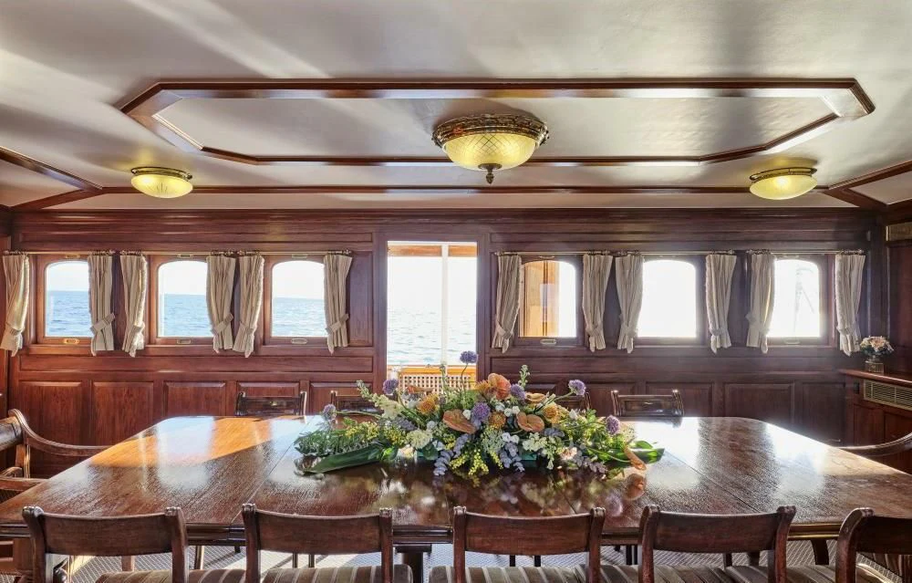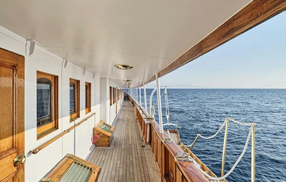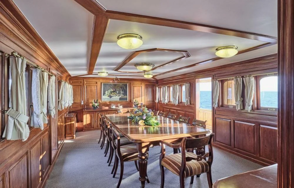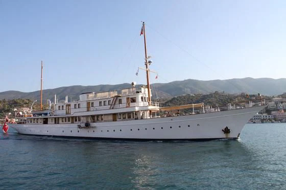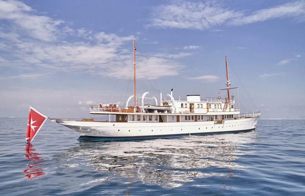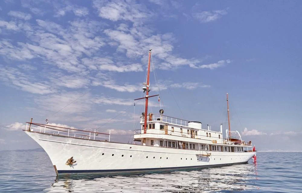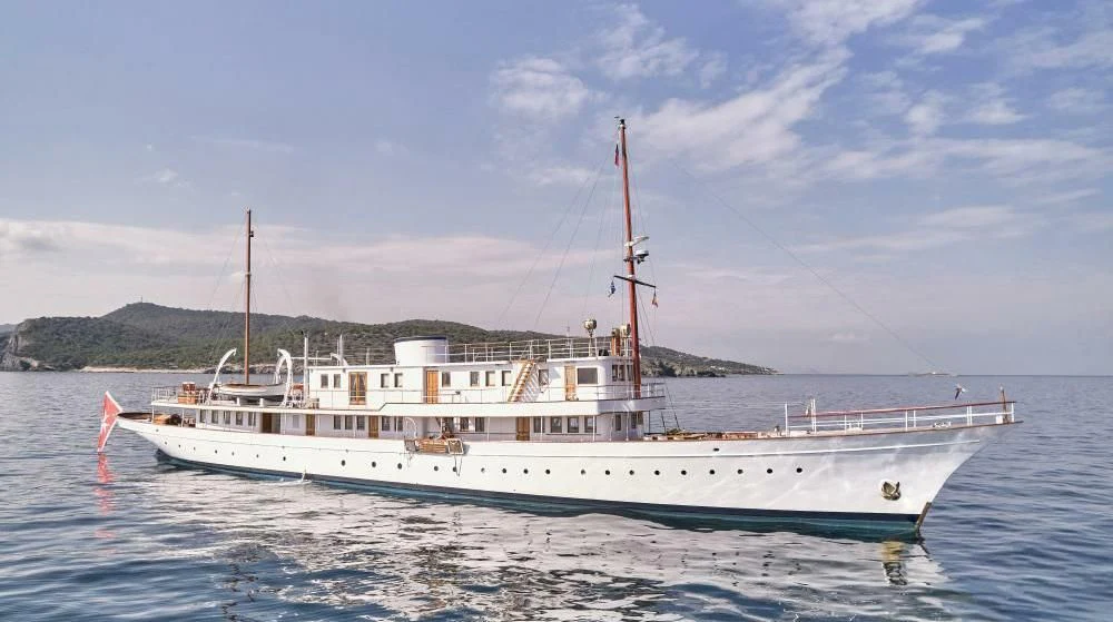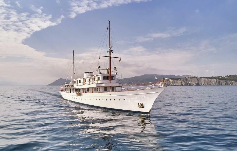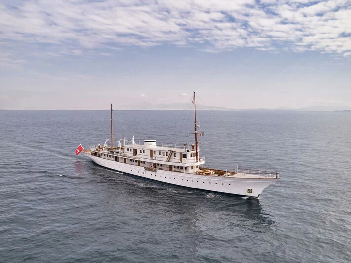 The 120-year-old steel-hulled motor yacht, now powered by two Mercedes 250Hp engines, accommodates 14 guests in seven cabins and operates with a crew of 10. The vessel is complemented by a 6m Riva Superflorida tender and a 6m classic launch.