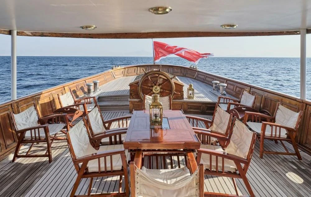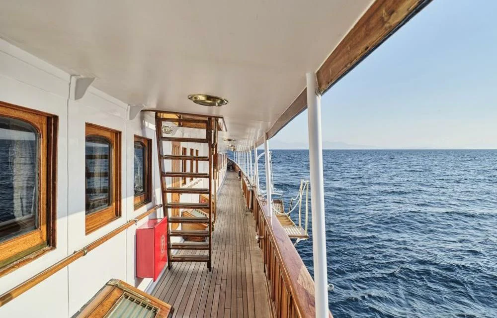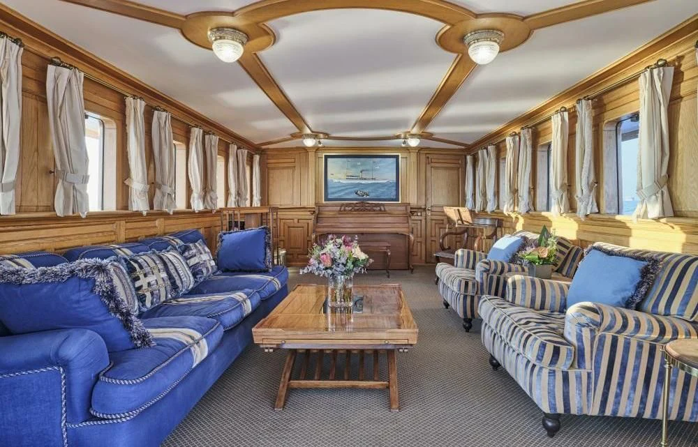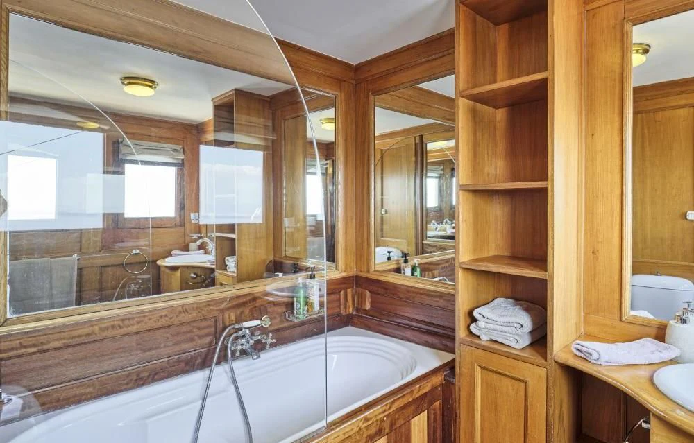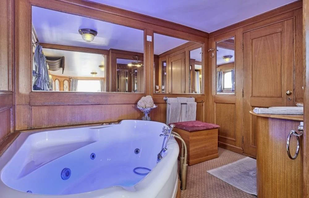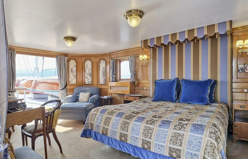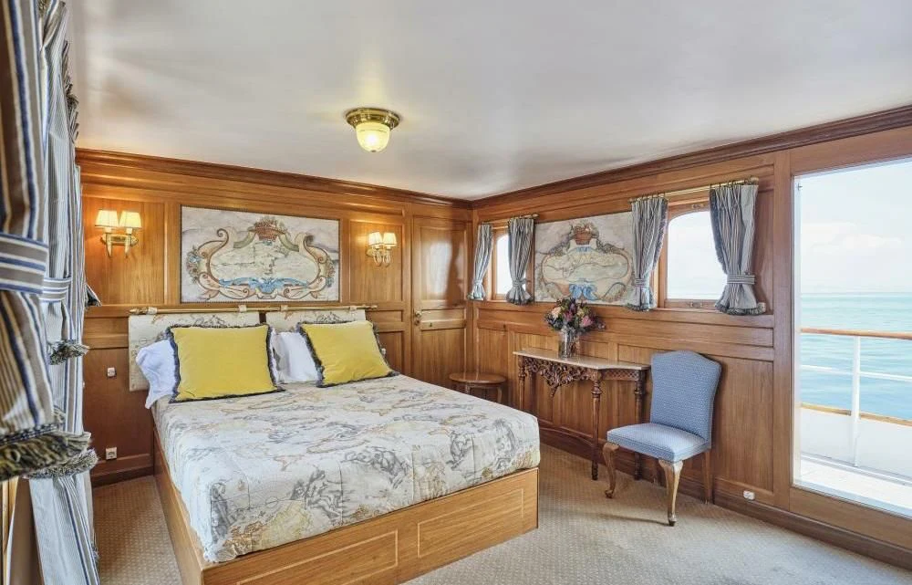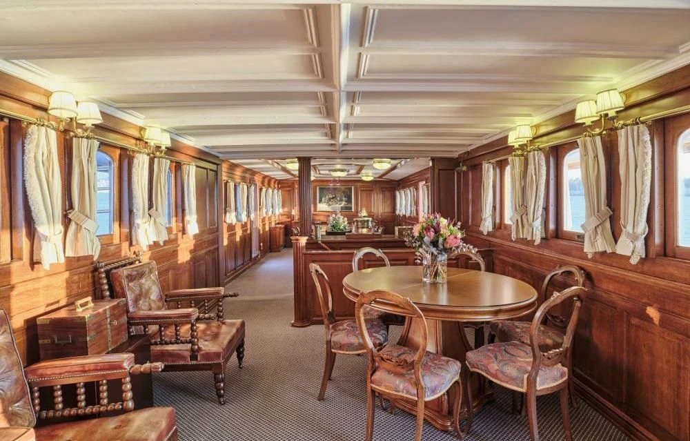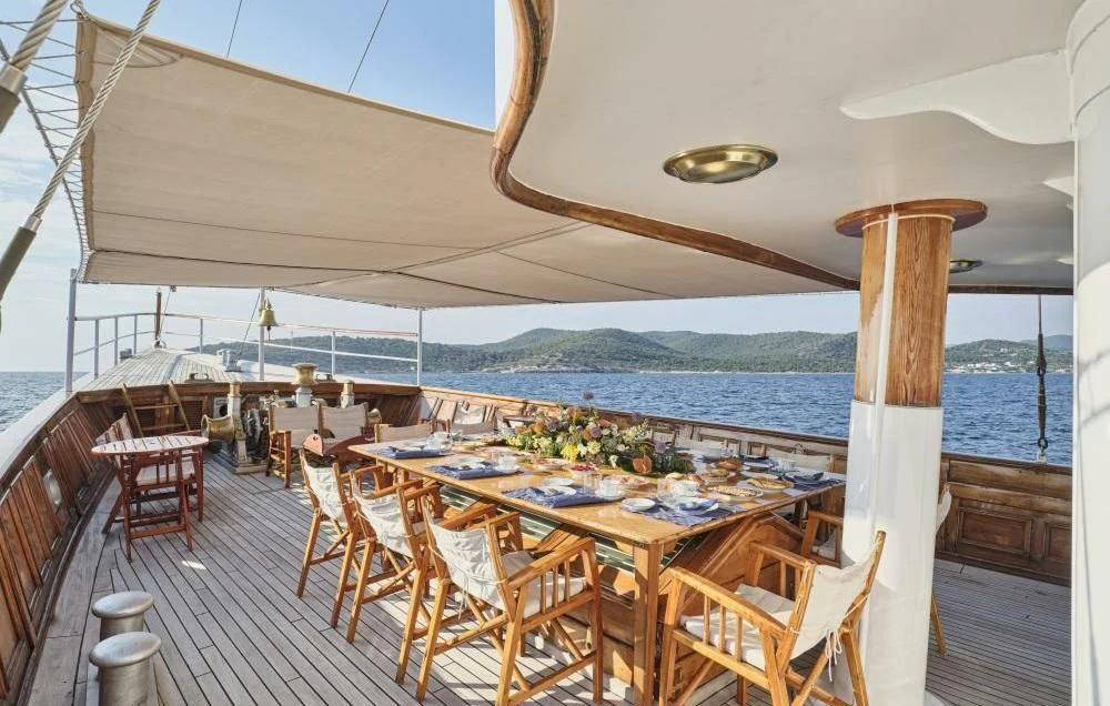 The 120-year-old steel-hulled motor yacht, now powered by two Mercedes 250Hp engines, accommodates 14 guests in seven cabins and operates with a crew of 10. The vessel is complemented by a 6m Riva Superflorida tender and a 6m classic launch.