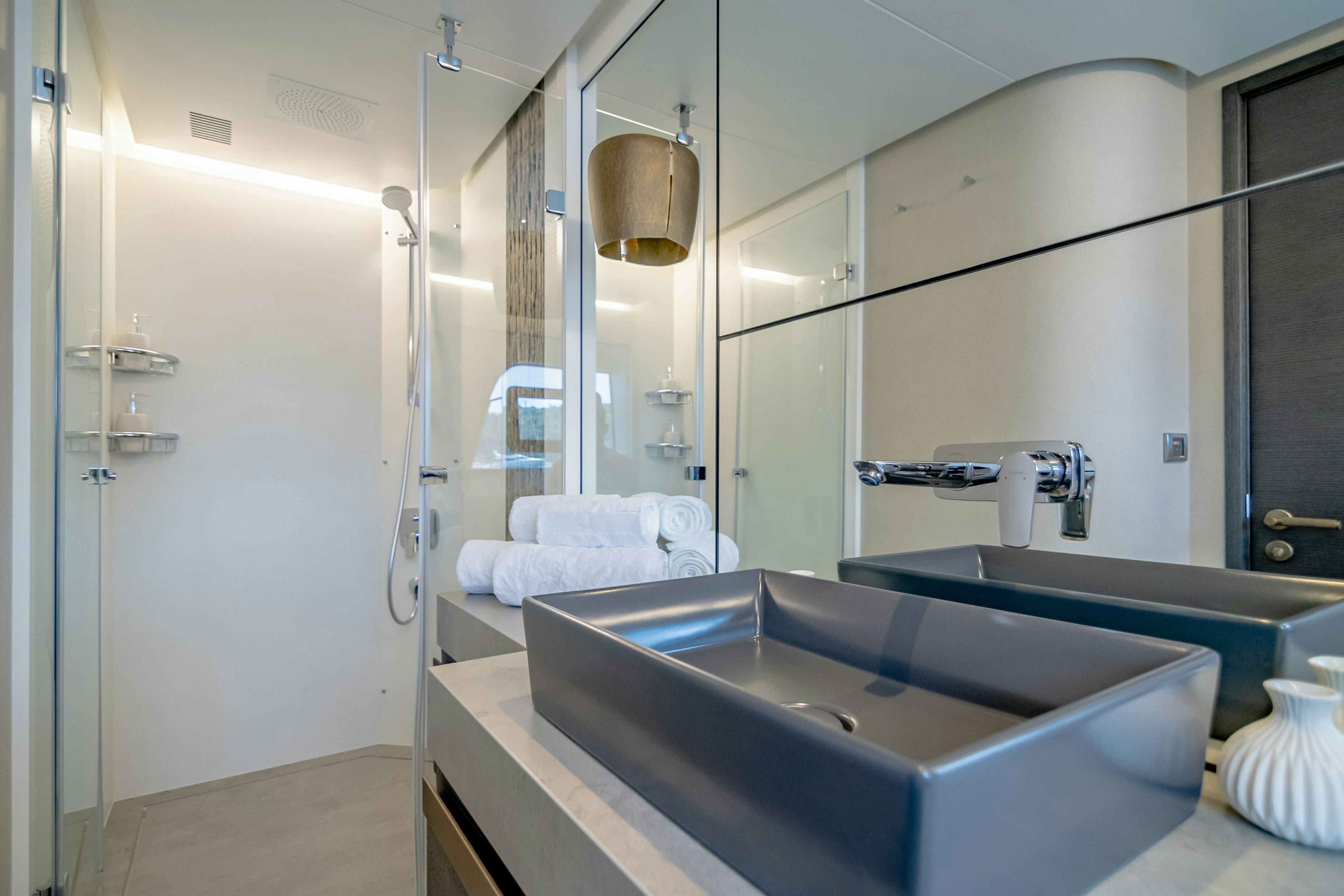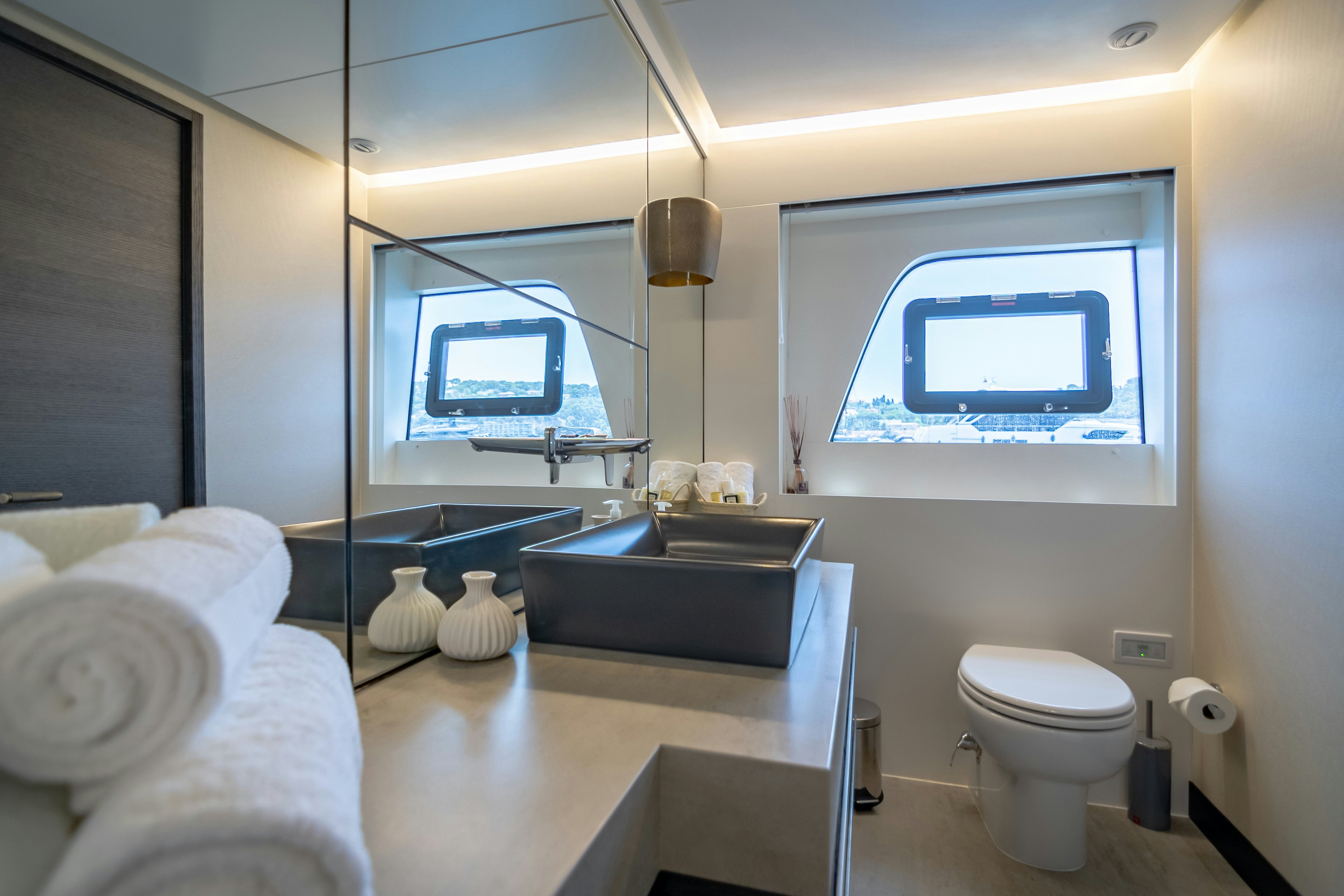 This yacht can comfortably sleep six guests in three staterooms. The full-beam master cabin, located aft, includes a spacious double bed, a walk-in wardrobe with a safe, a large L-shaped sofa, and a desk. The large VIP double cabin forward boasts a full-beam layout with ample storage, a sofa, and a desk. The port side double cabin features a double bed and a wardrobe. Each stateroom comes with its own ensuite shower room, ensuring guests enjoy privacy.