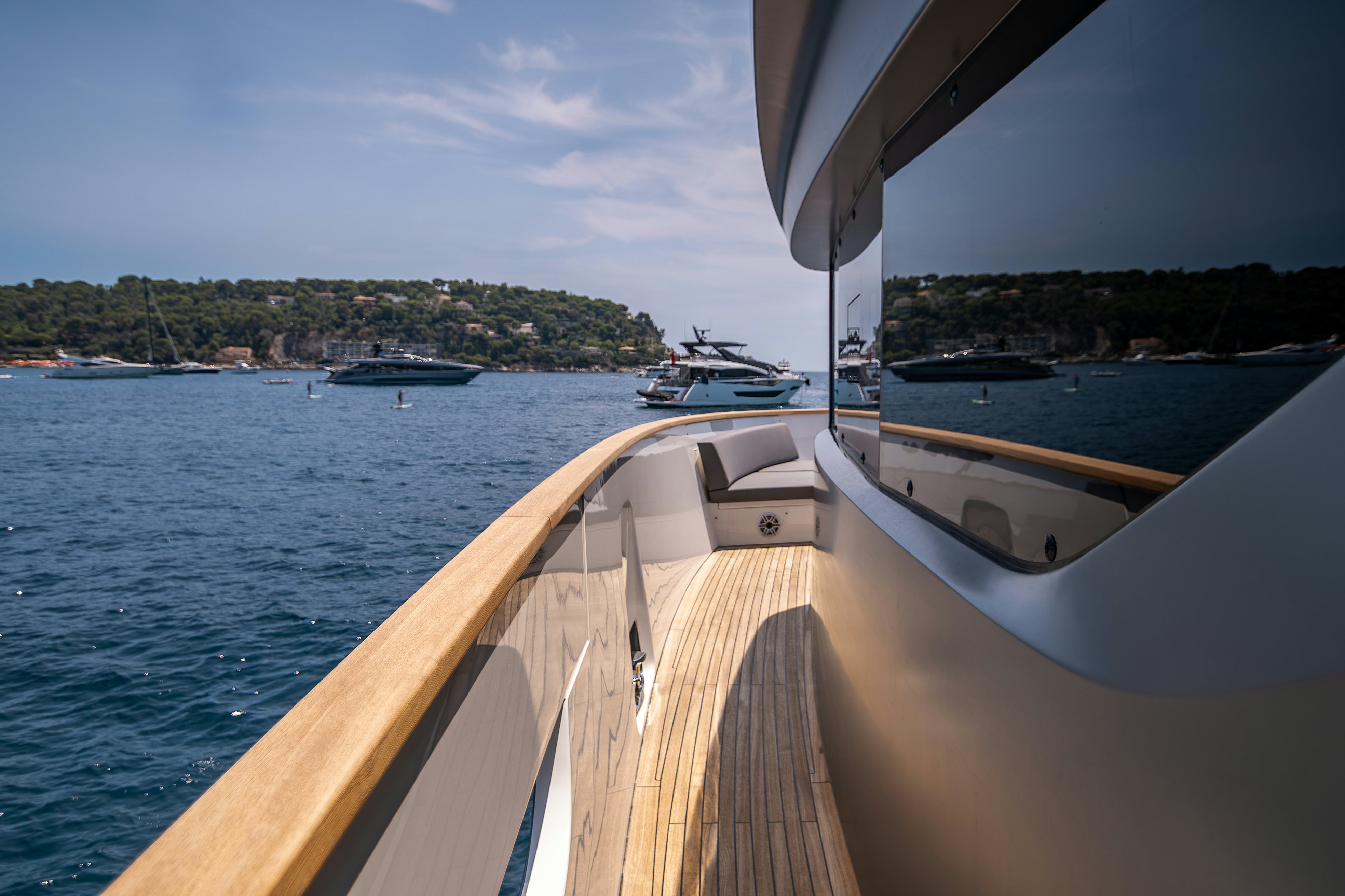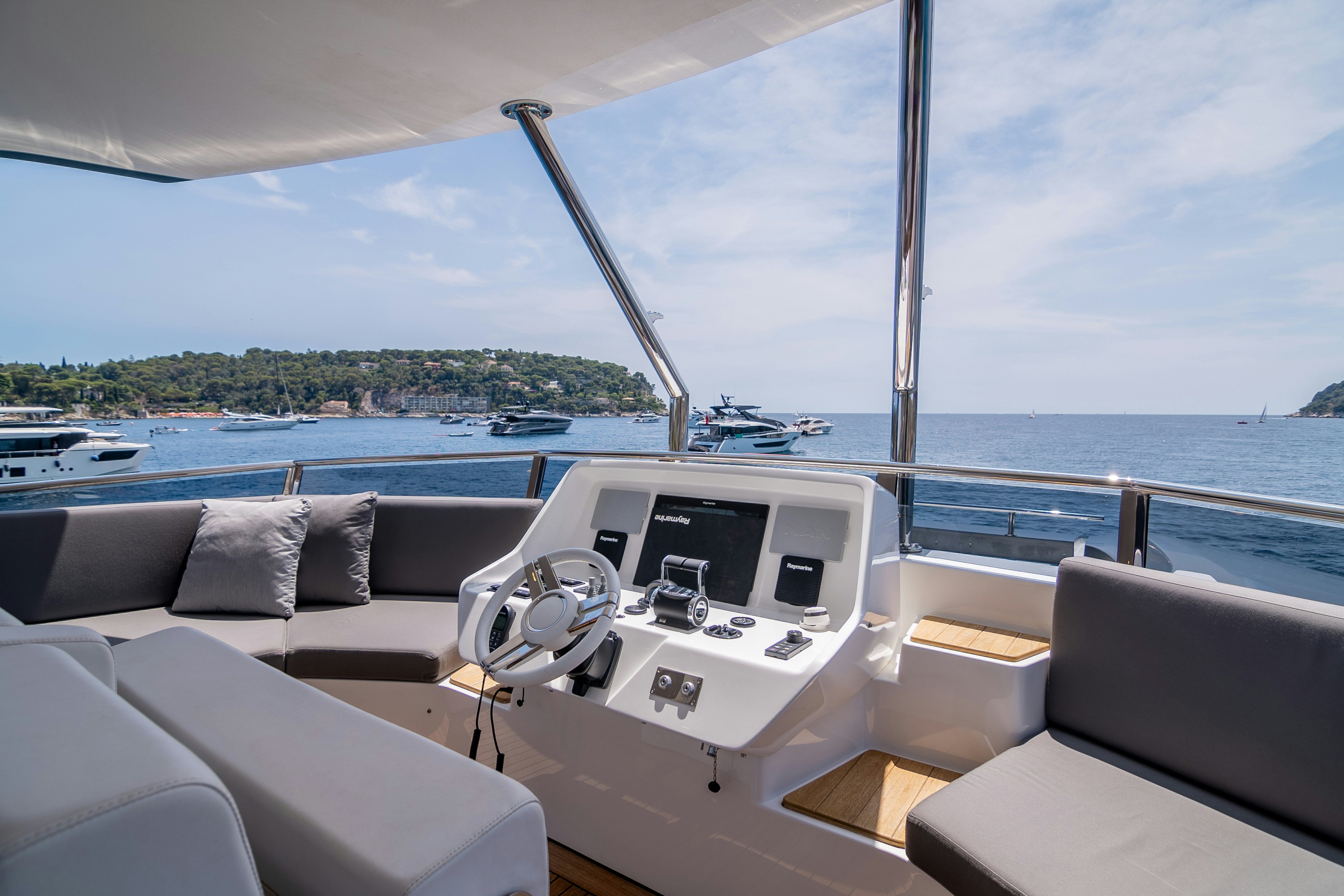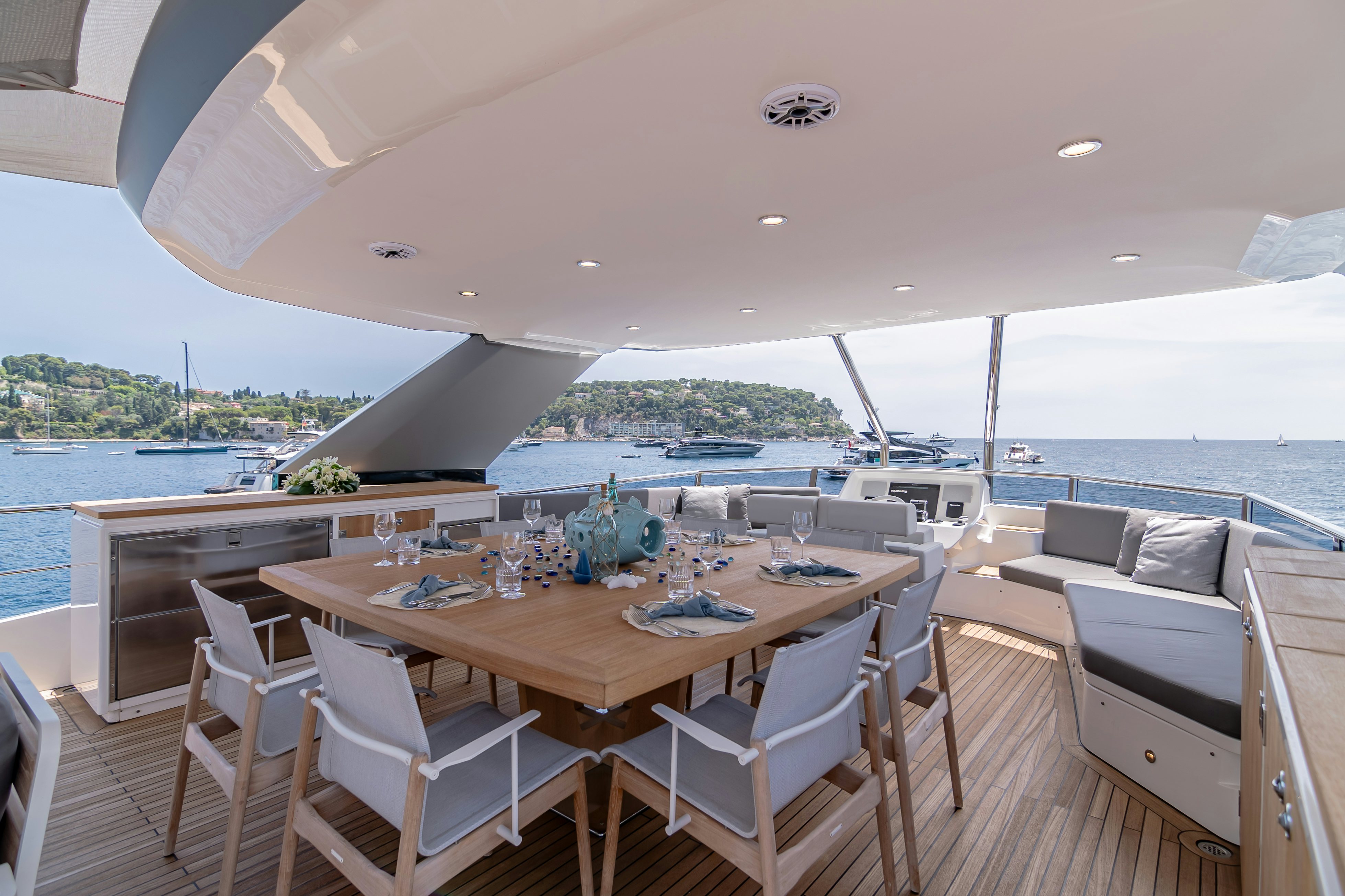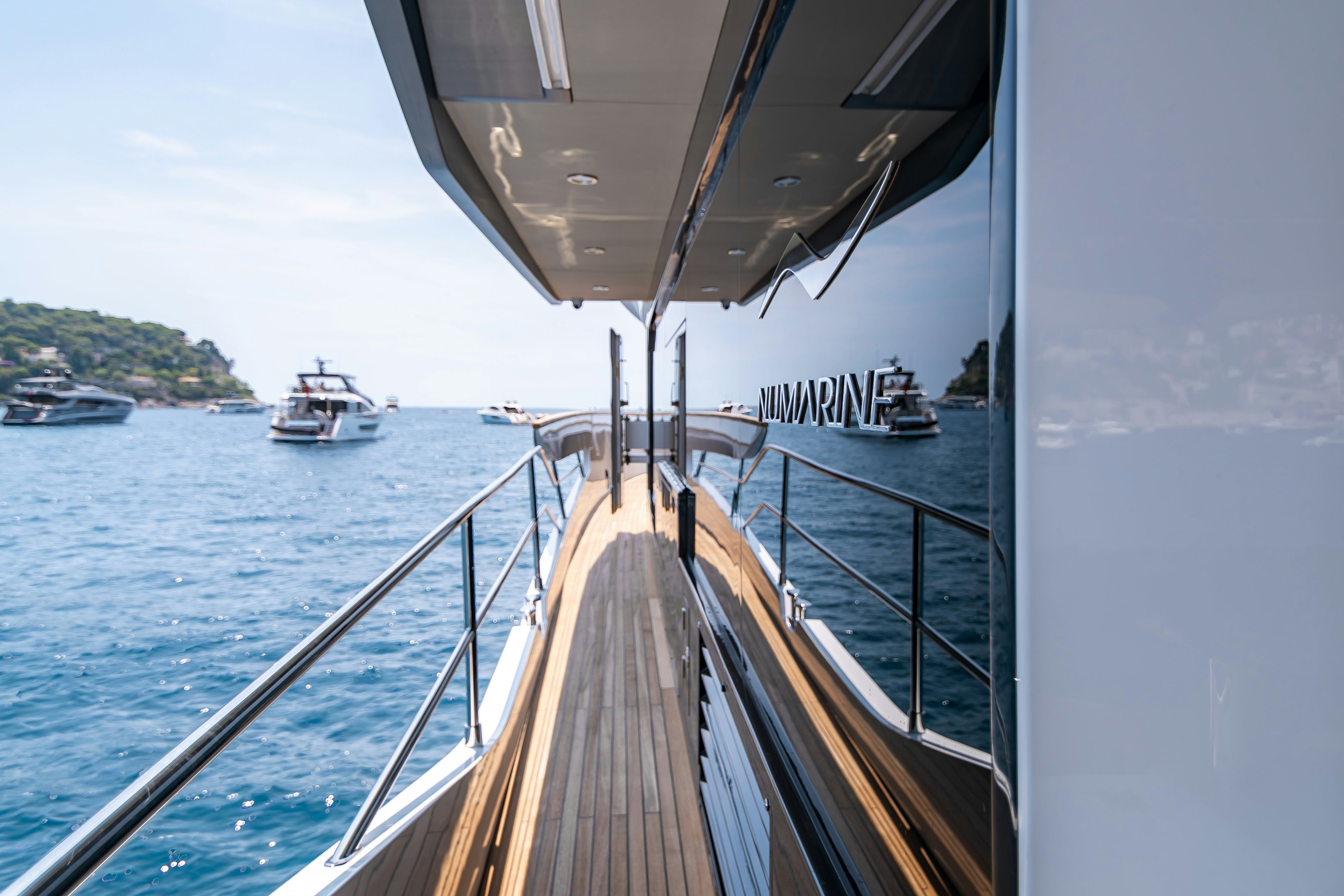 MAORIA, a 2021 Numarine 26XP, is an exceptional explorer-style motor yacht designed for world cruising with displacement characteristics. MAORIA stands out with her sleek, modern lines and expansive exterior spaces. Boarding from the aft deck, guests are welcomed by a comfortable lounge area with seating for eight and adjustable tables, perfect for alfresco dining or relaxing with a drink from the small bar equipped with a fridge. The main salon, accessible from the aft deck, features a large sofa that seats six and a dining table for eight. Floor-to-ceiling windows flood the salon with natural light, offering panoramic views.