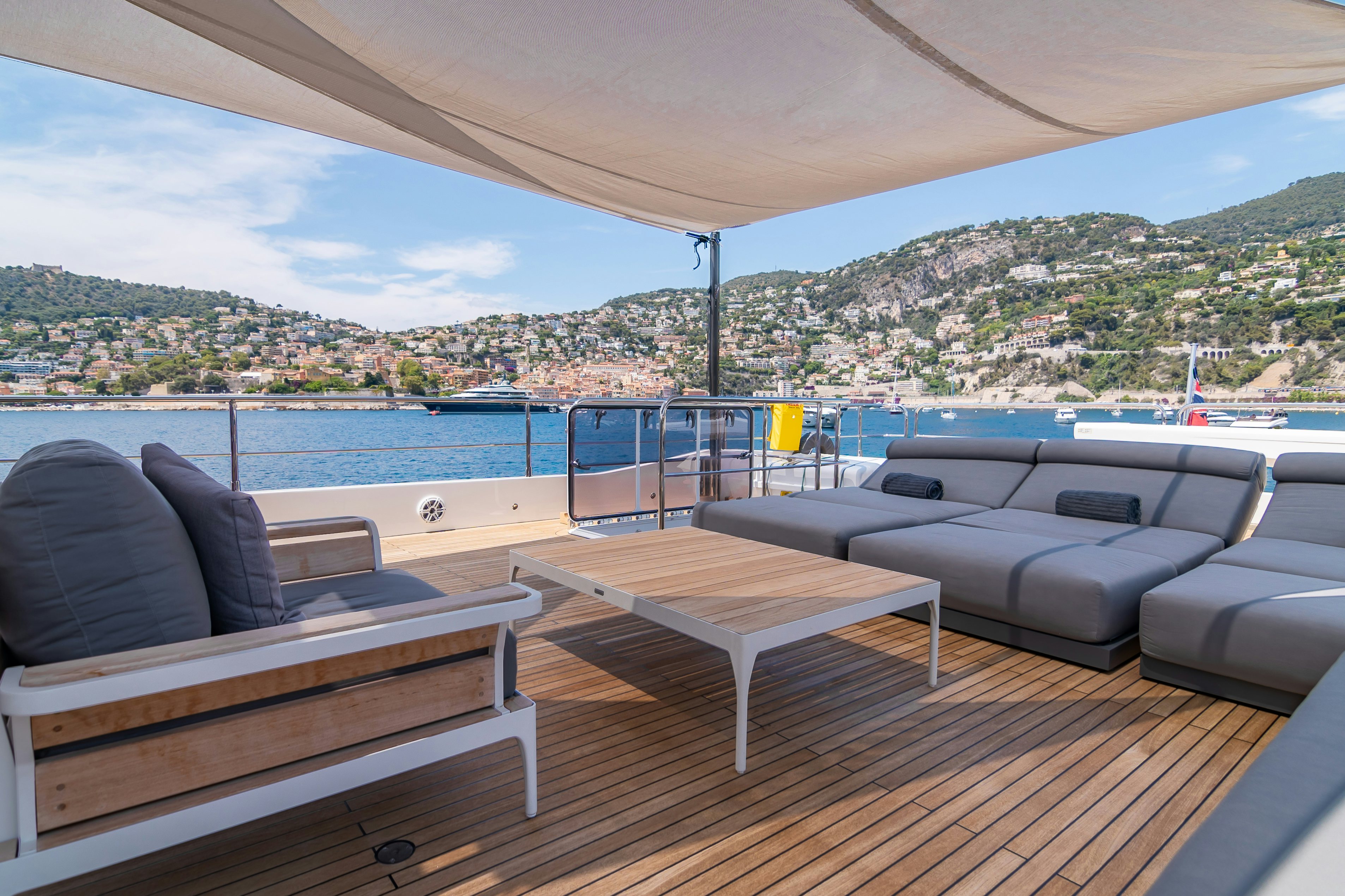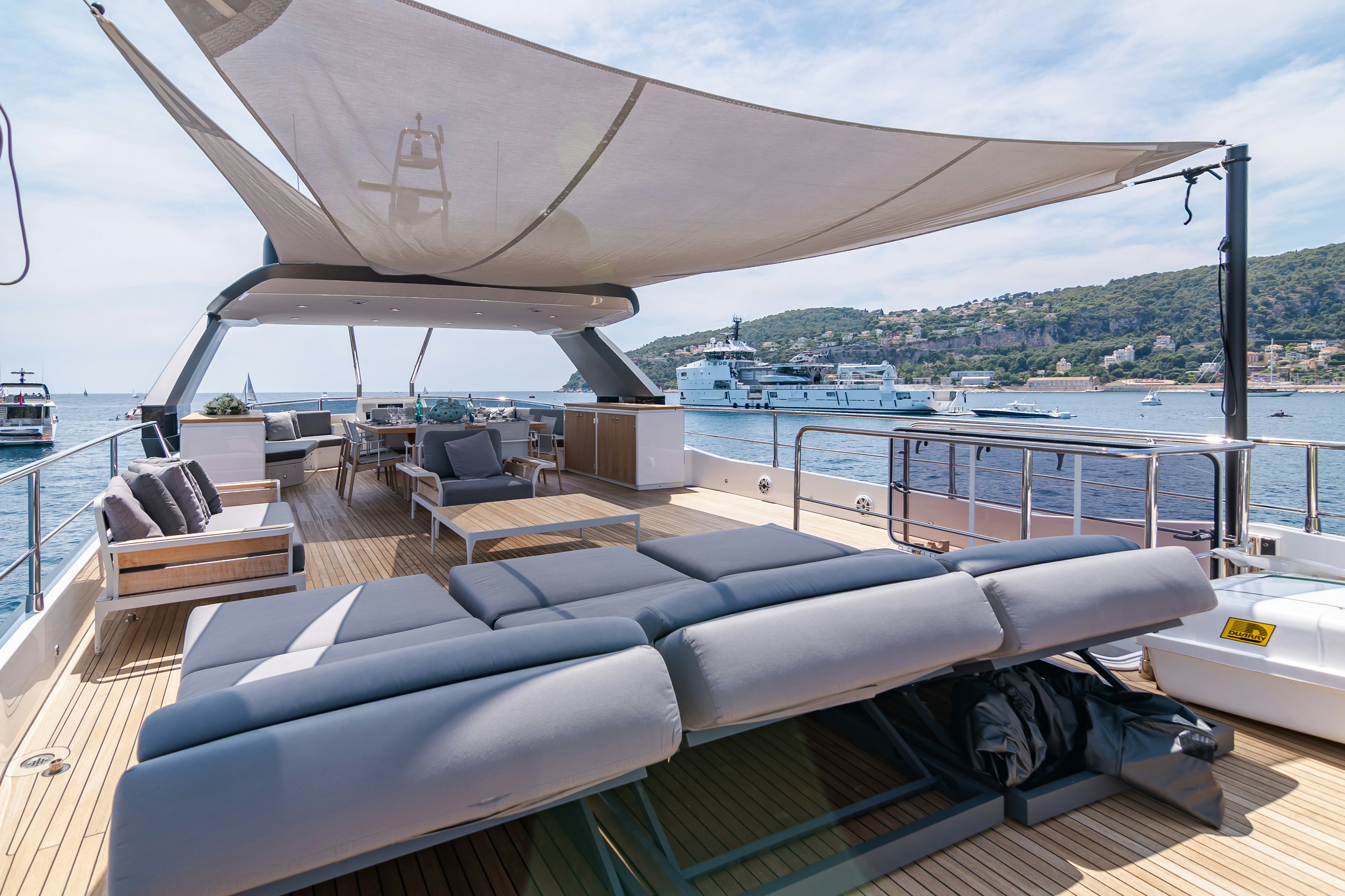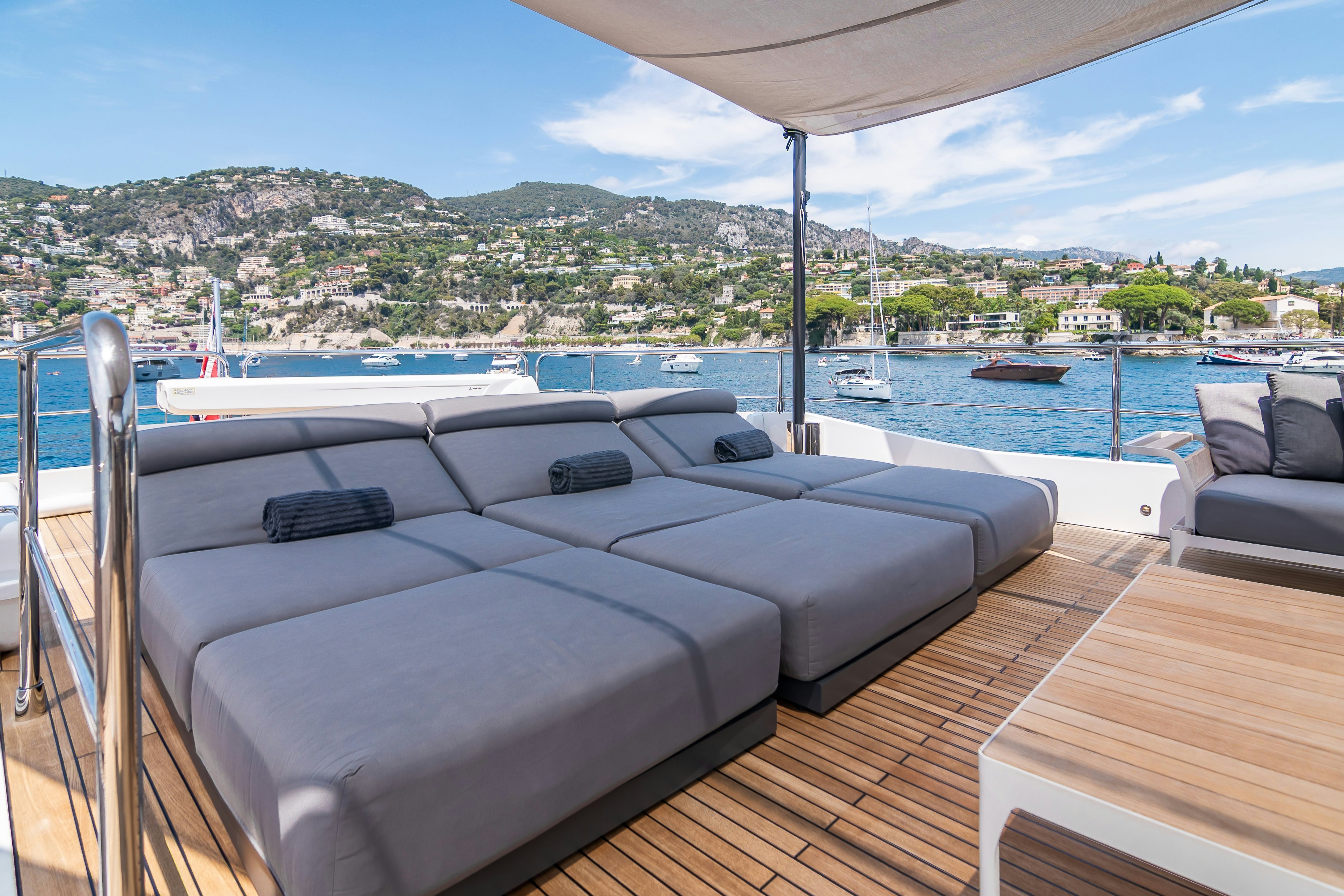 MAORIA’s sundeck is a versatile space. It features a spacious dining table for eight, a barbecue, fridges, an ice machine, and comfortable sunbeds and sofas. The foredeck offers additional seating for six and a small retractable table, while the swim platform can be lowered into the water for easy access to the sea. One of the yacht’s standout features is the large sauna and shower on the lower deck, providing a perfect retreat after a day of exploration.