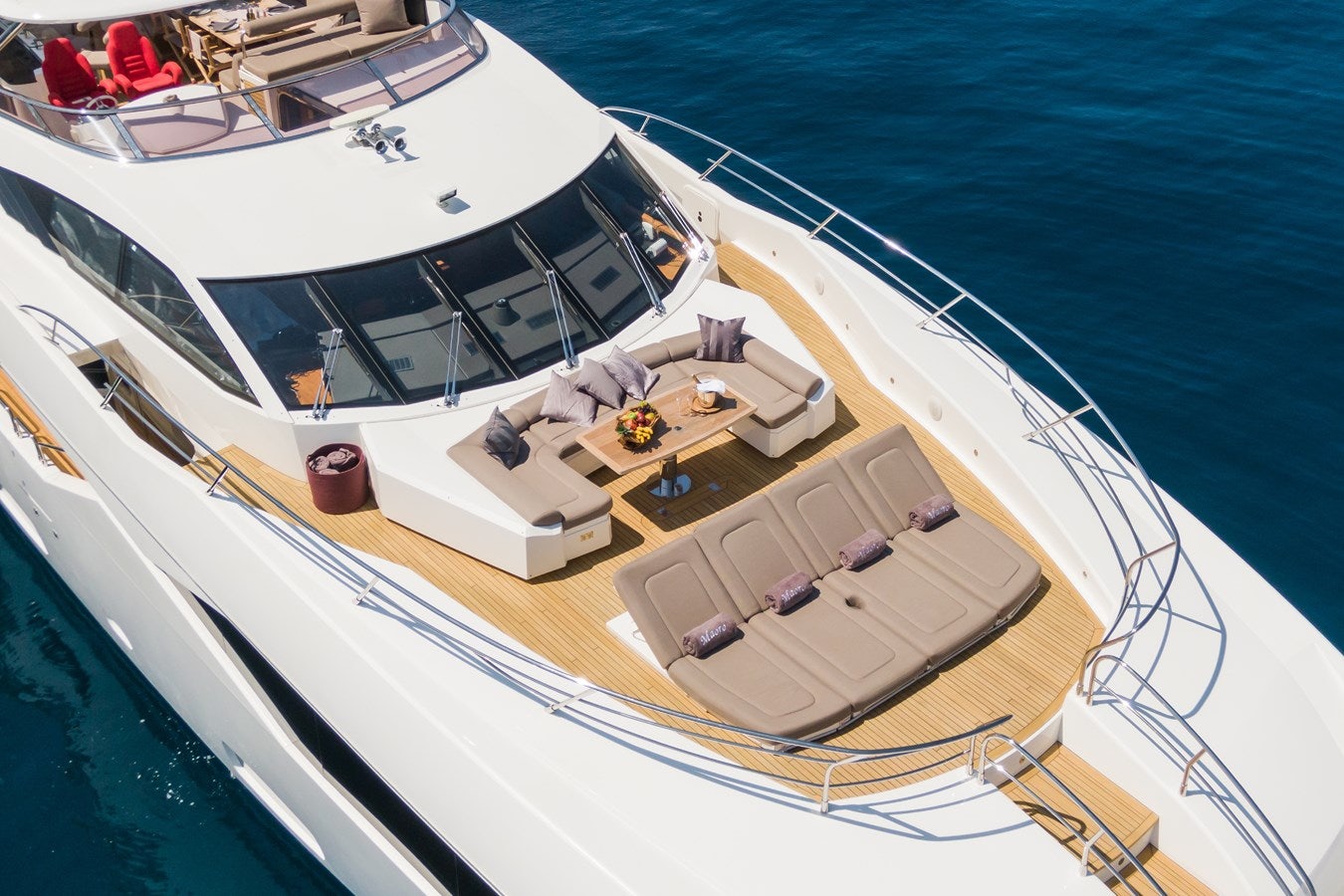 The exterior design of MAORO is nothing short of breathtaking. With its GRP hull material gleaming under the sun's rays, this motor yacht exudes elegance from every angle. It boasts a flybridge that offers panoramic views of the surrounding seascape - perfect for those who appreciate nature's beauty while cruising at speeds up to a brisk 26 knots. Notable exterior features include underwater lights that illuminate the ocean depths during night-time voyages and stabilizers that ensure smooth sailing even in challenging sea conditions.