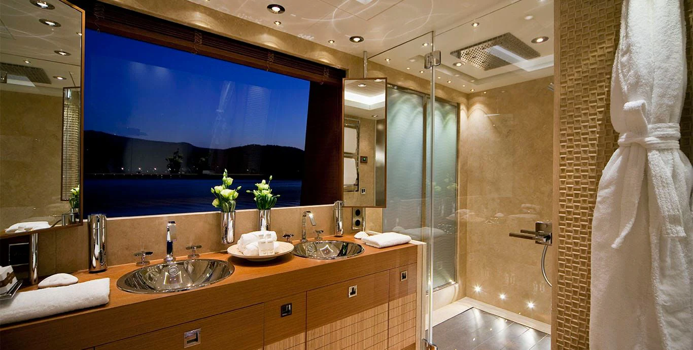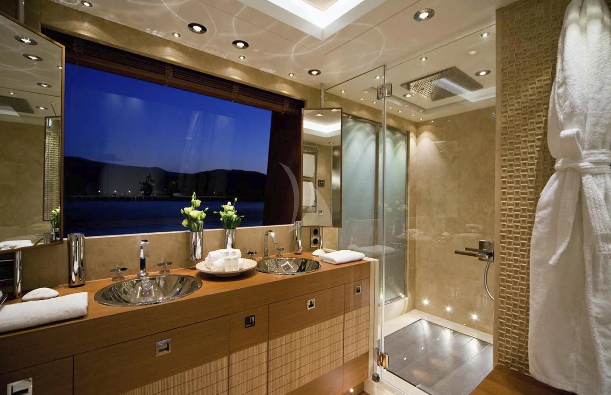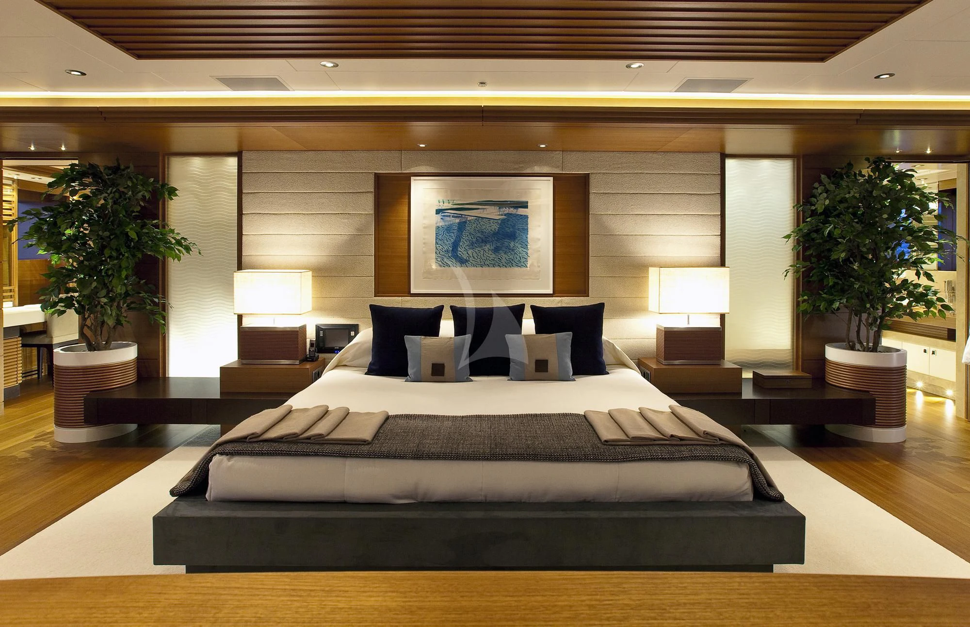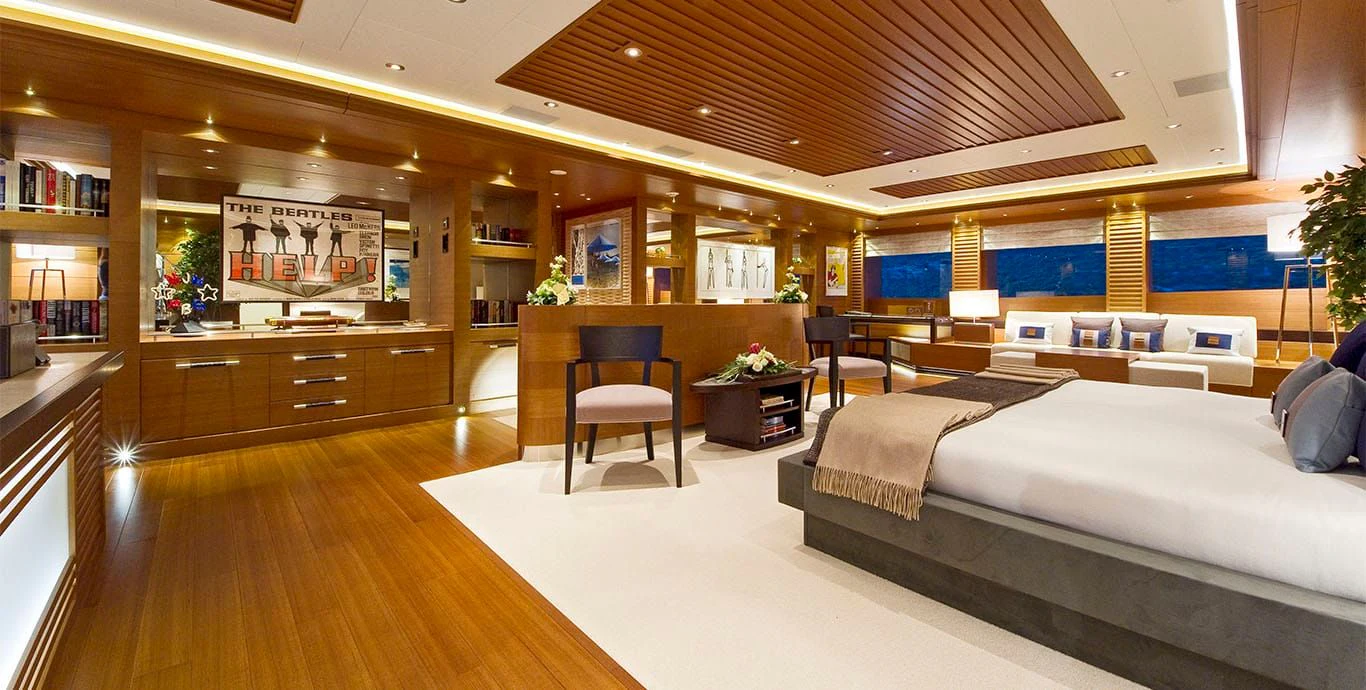 Stepping inside MARY-JEAN II reveals an interior that can only be described as palatial. Seven sumptuous cabins accommodate up to twelve guests in grand style, with each space exuding its own unique charm through carefully curated color palettes and design elements. The master stateroom stands out for its sheer size and luxury, offering occupants majestic sea views from their private sanctuary aboard this floating palace.
