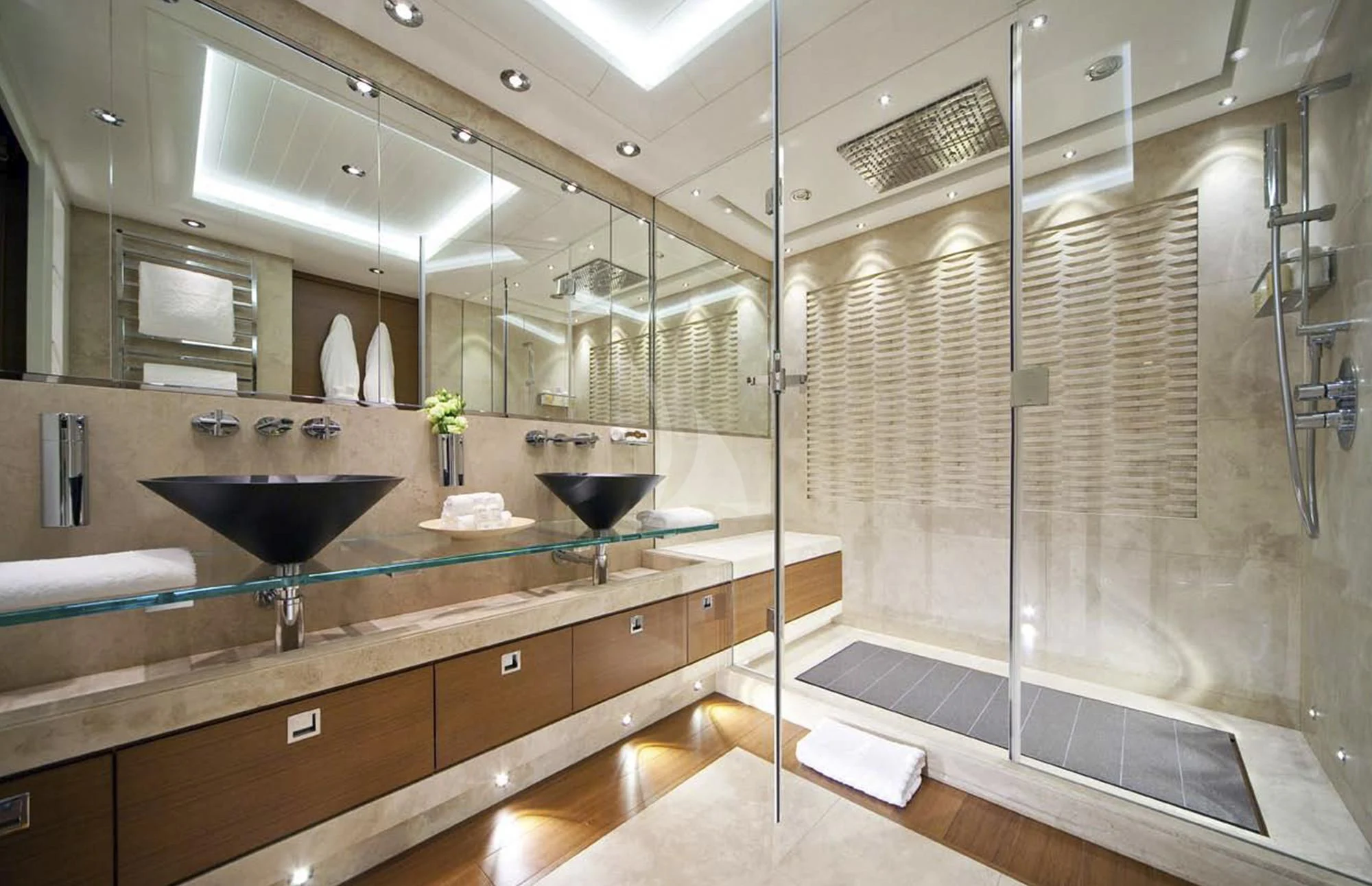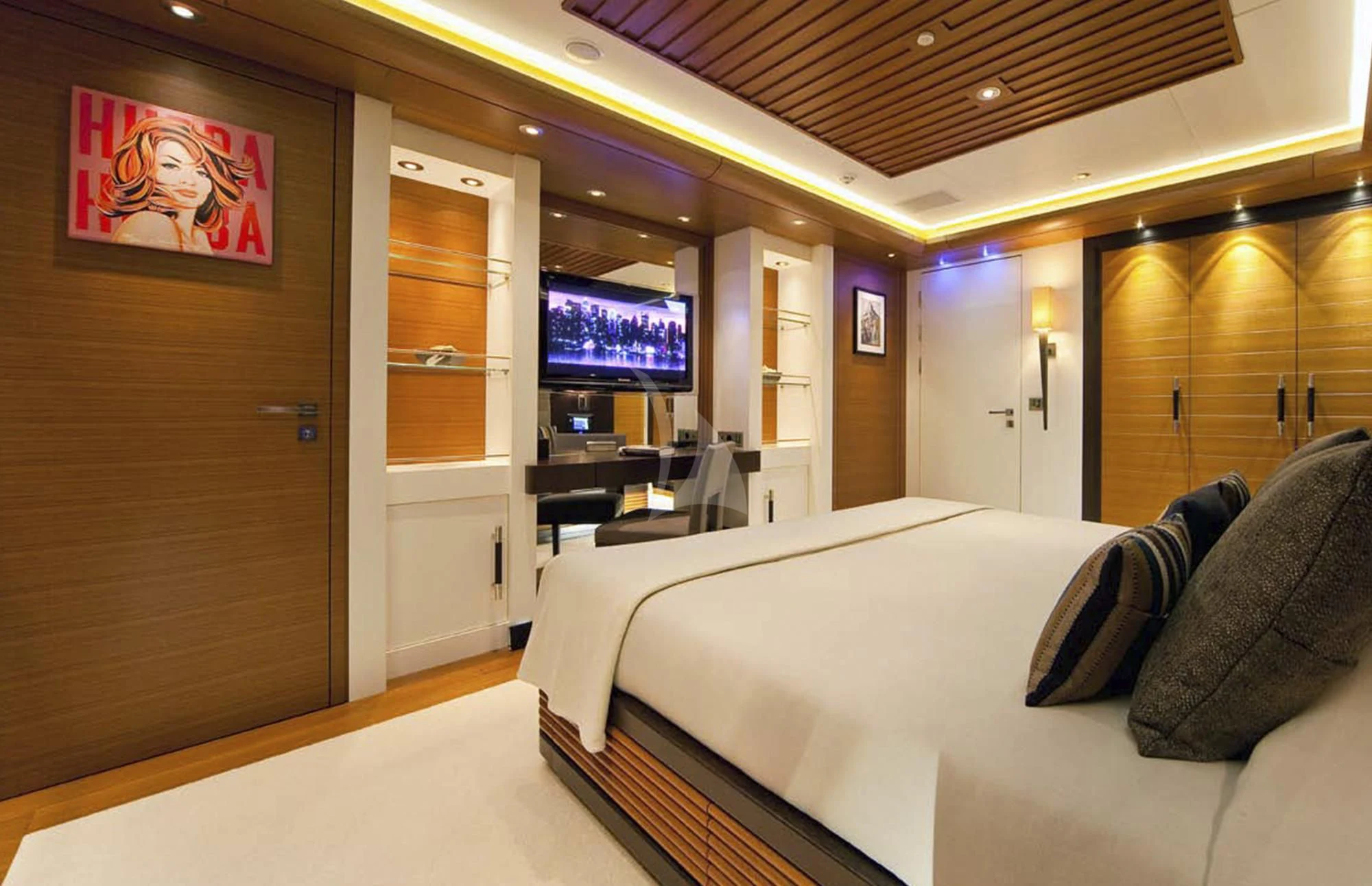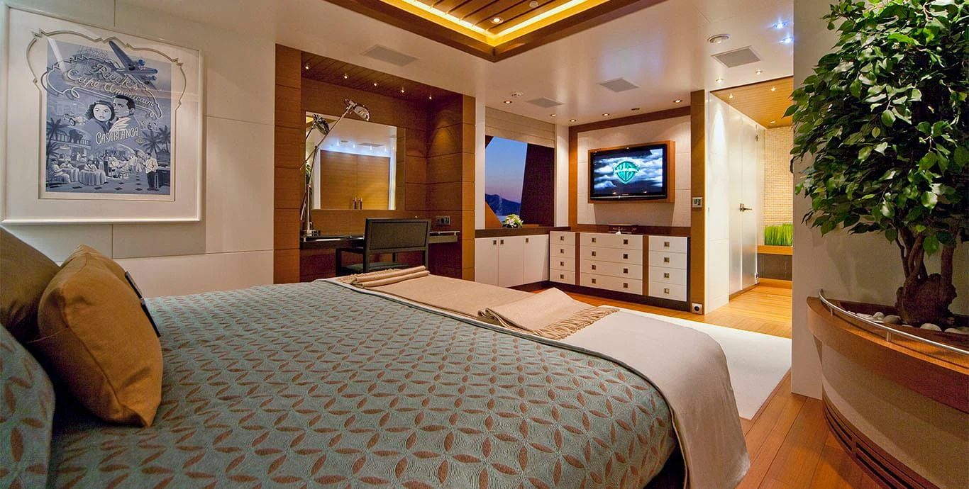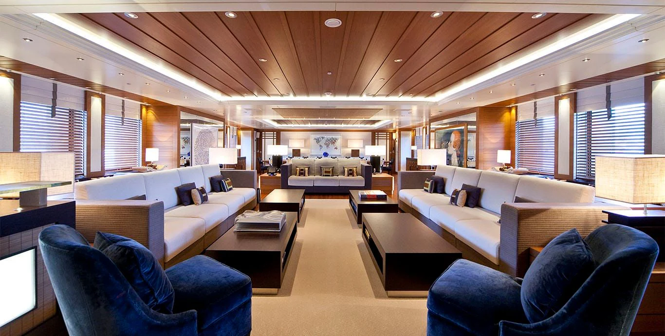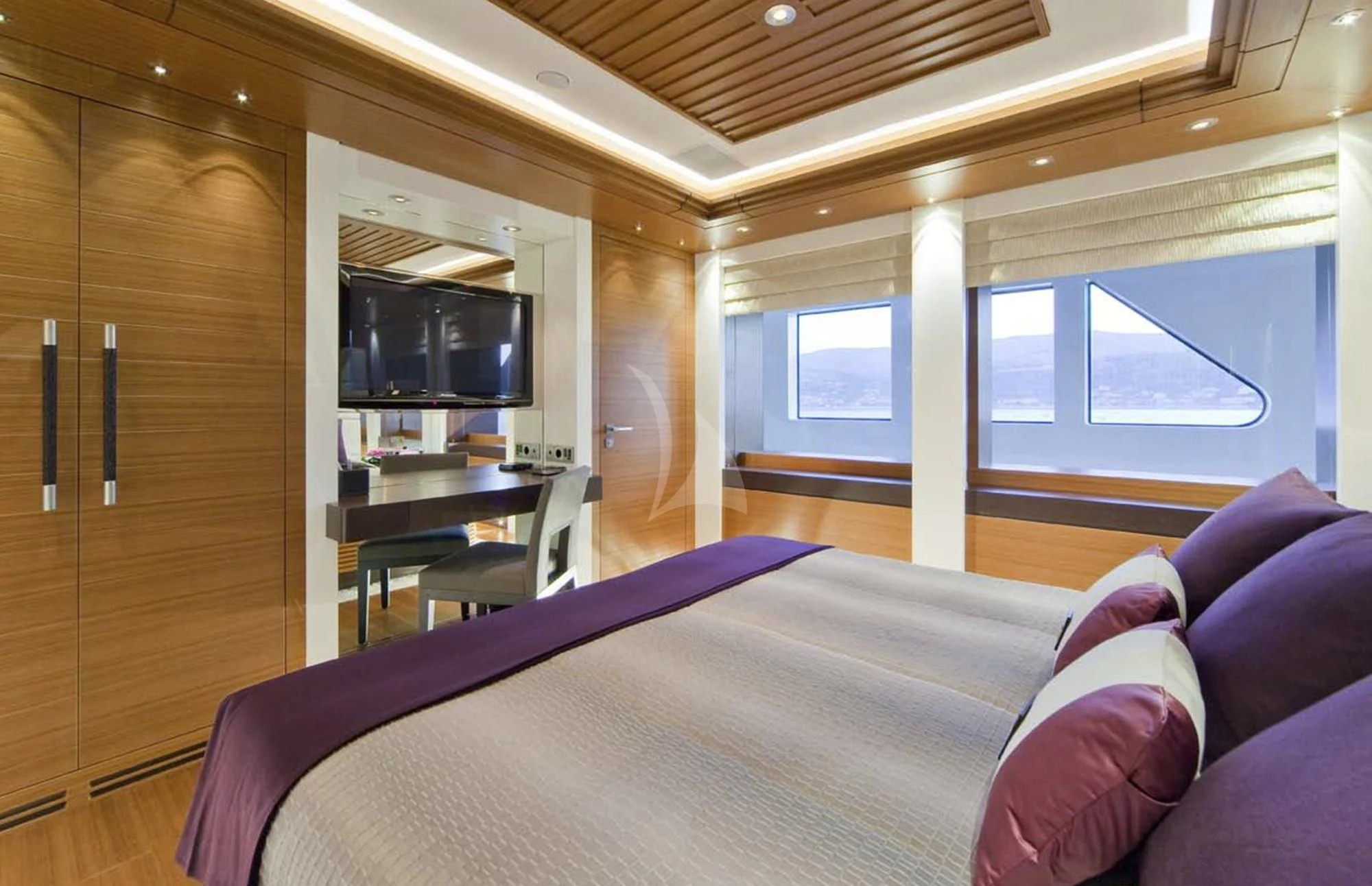 Stepping inside MARY-JEAN II reveals an interior that can only be described as palatial. Seven sumptuous cabins accommodate up to twelve guests in grand style, with each space exuding its own unique charm through carefully curated color palettes and design elements. The master stateroom stands out for its sheer size and luxury, offering occupants majestic sea views from their private sanctuary aboard this floating palace.