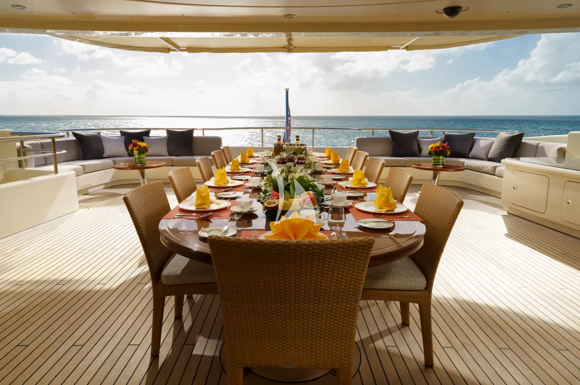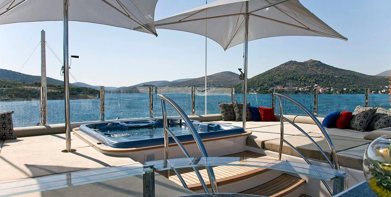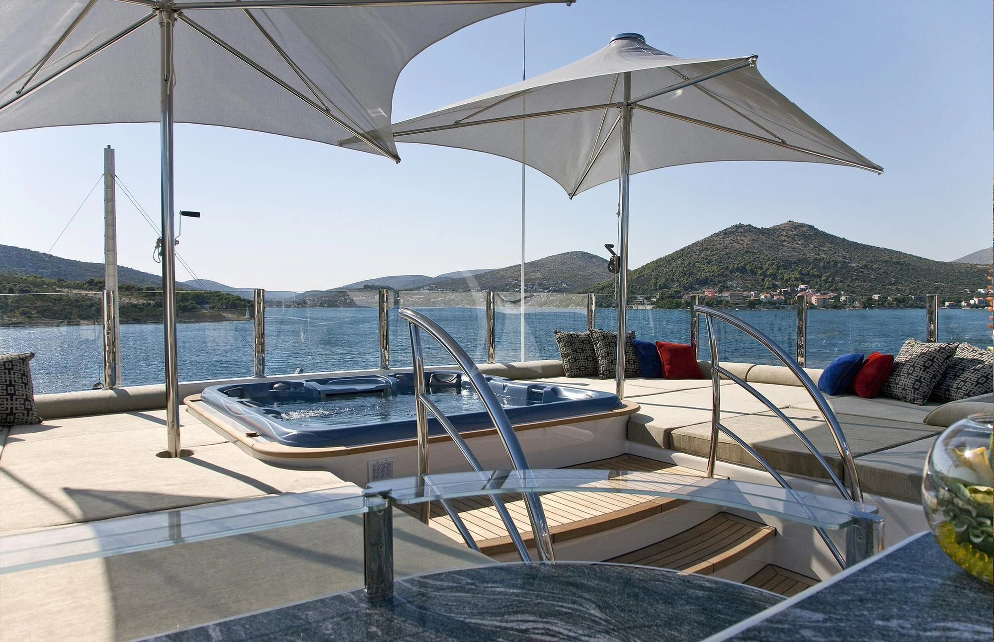 MARY-JEAN II's exterior features are as striking as they are functional. The sundecks invite sunbathers to relax on plush loungers while taking in panoramic ocean views; alfresco dining areas set the scene for unforgettable meals under starlit skies; and a luxurious Jacuzzi provides the perfect spot for guests to unwind after a day of sea exploration. With a cruising speed of 14.5 knots and maximum speed of 16.5 knots, MARY-JEAN II effortlessly glides across the water while offering her guests unparalleled stability and comfort.