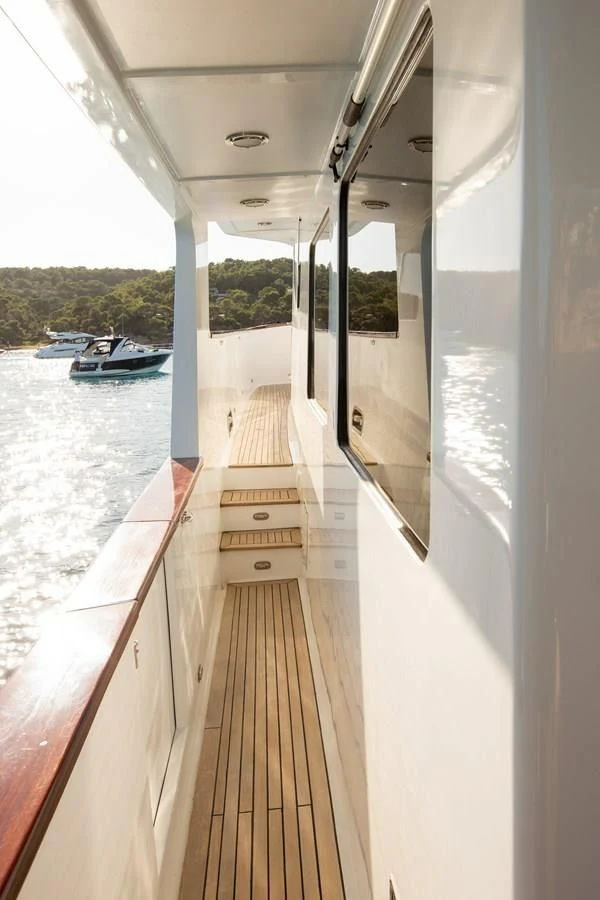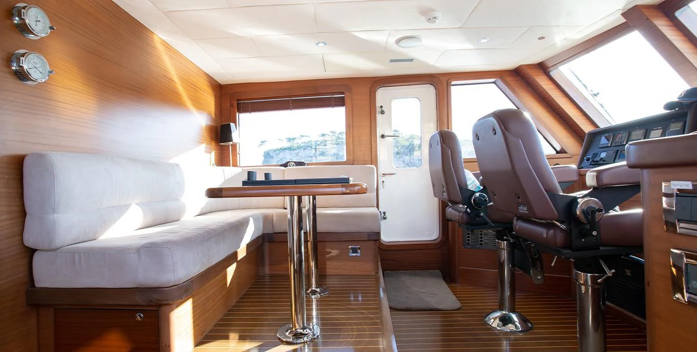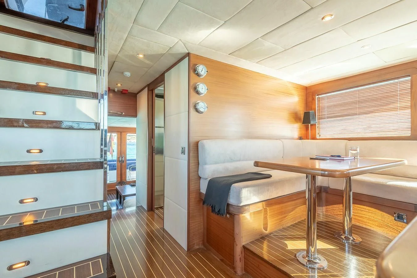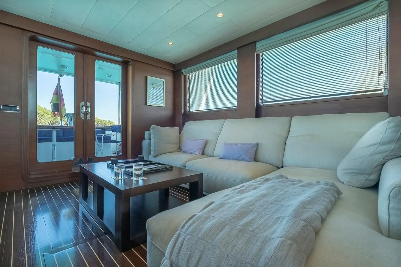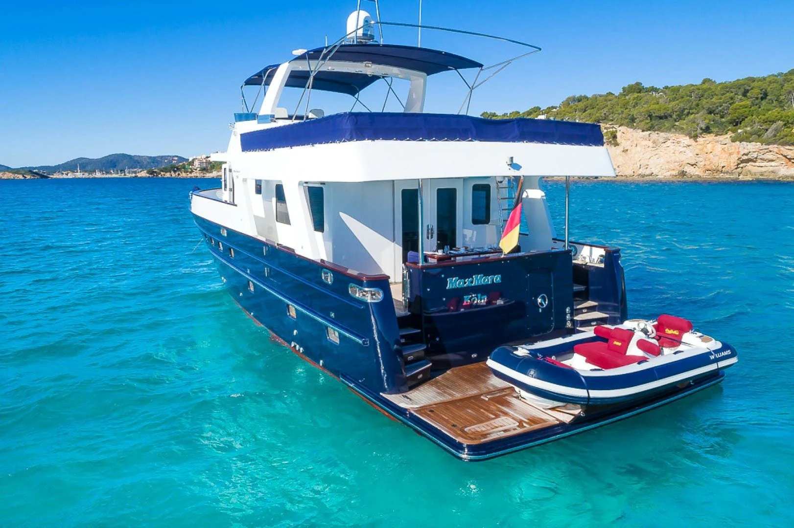 MAXMARA showcases an elegantly styled interior with nautical touches and is adorned with beautiful teak and Alcantara leather wall coverings and teak flooring. The yacht’s interior offers a warm, homelike ambiance featuring an abundance of natural light and plush furnishings. The motor yacht welcomes six guests in three nicely appointed staterooms. She features a master suite with a double bed, a VIP stateroom with a double bed and a twin-bed stateroom. Also, the yacht has one crew cabin.