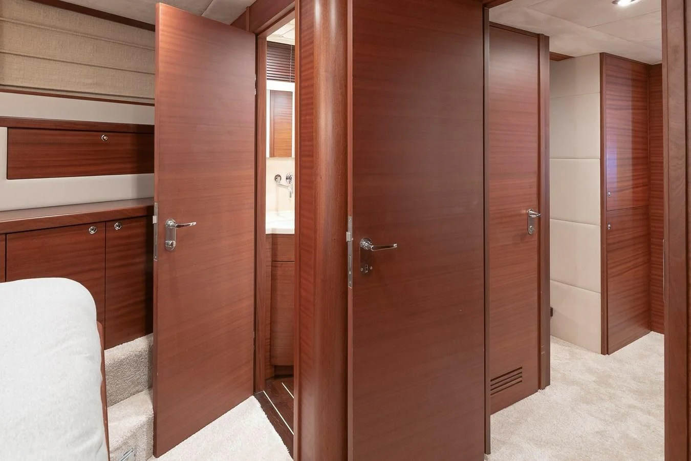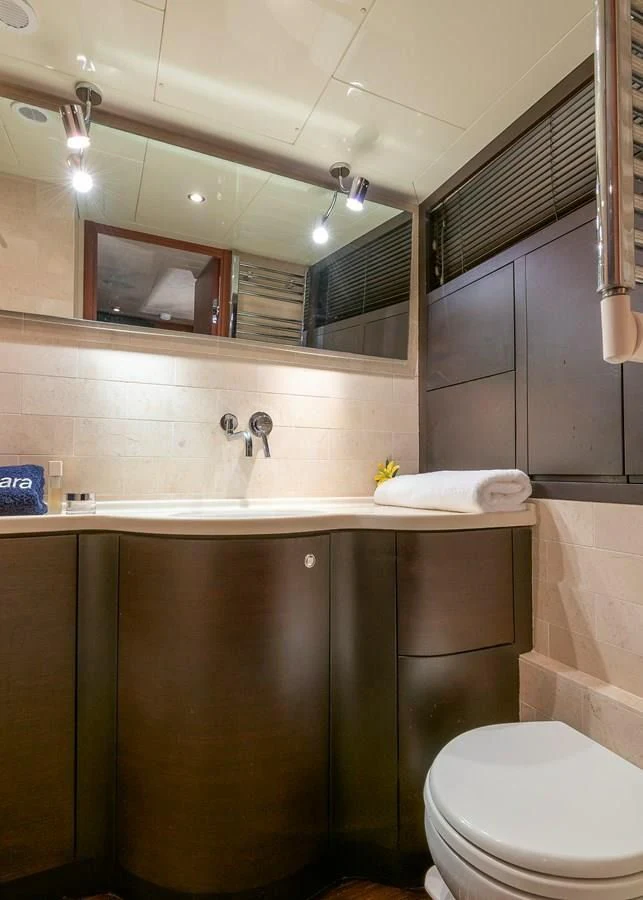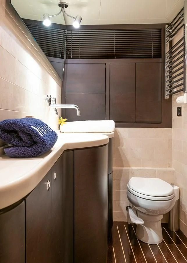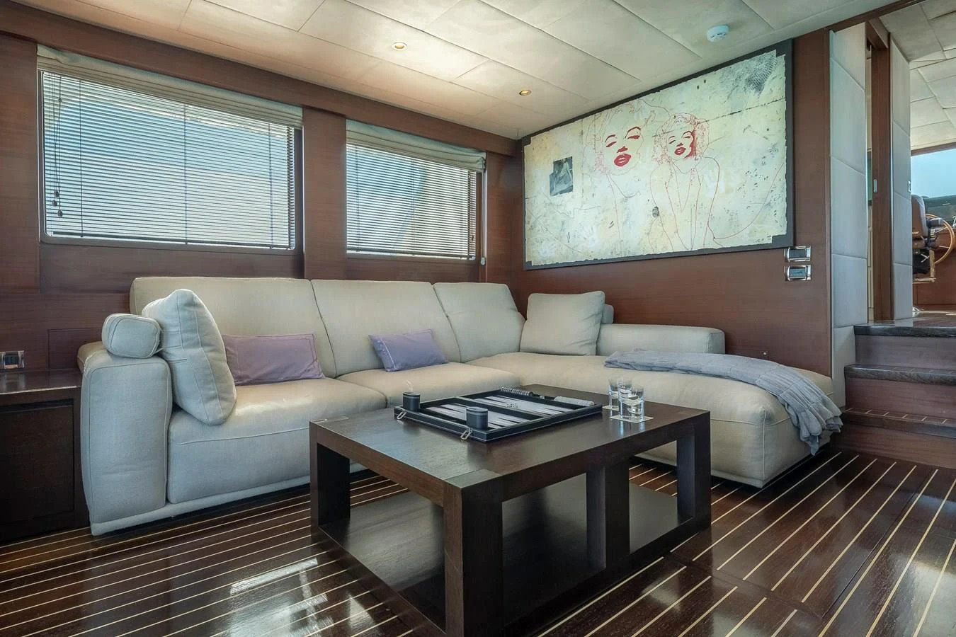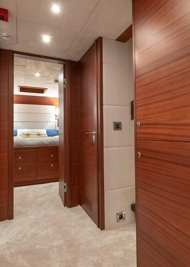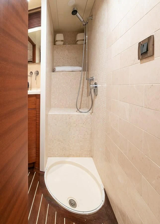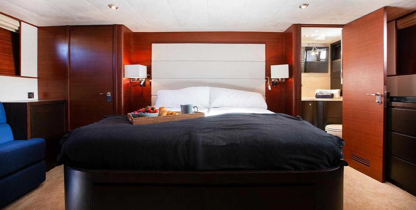 MAXMARA showcases an elegantly styled interior with nautical touches and is adorned with beautiful teak and Alcantara leather wall coverings and teak flooring. The yacht’s interior offers a warm, homelike ambiance featuring an abundance of natural light and plush furnishings. The motor yacht welcomes six guests in three nicely appointed staterooms. She features a master suite with a double bed, a VIP stateroom with a double bed and a twin-bed stateroom. Also, the yacht has one crew cabin.