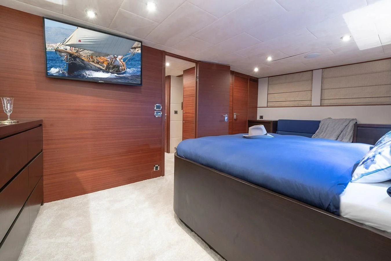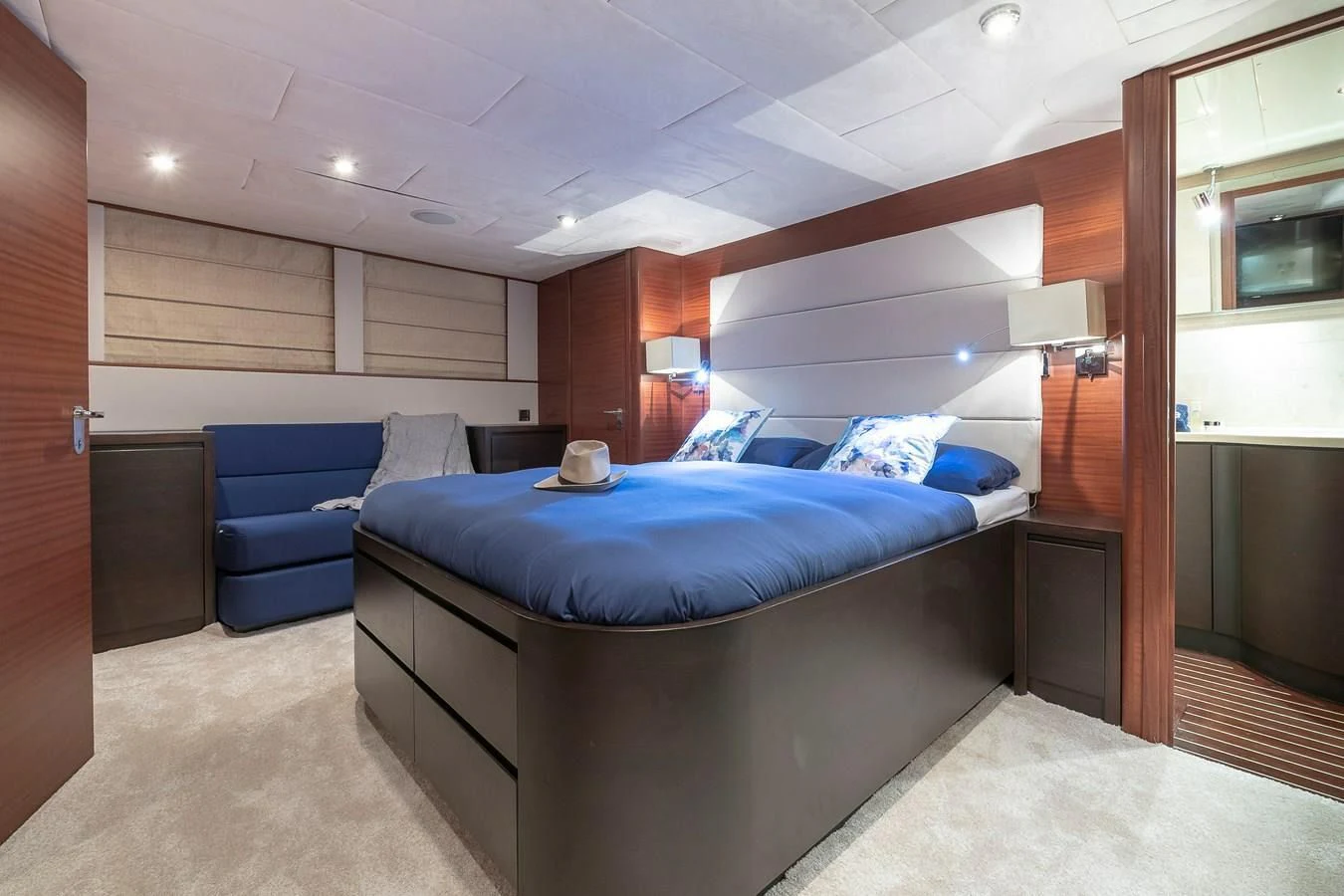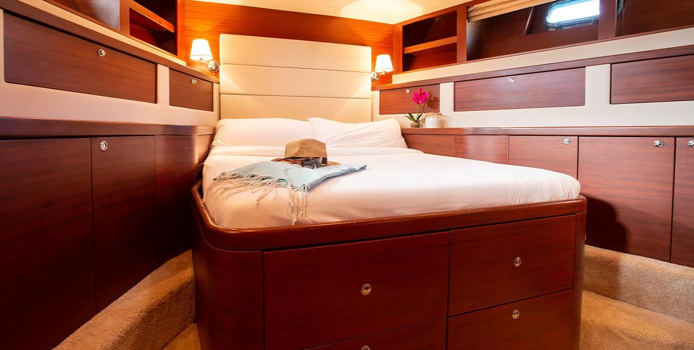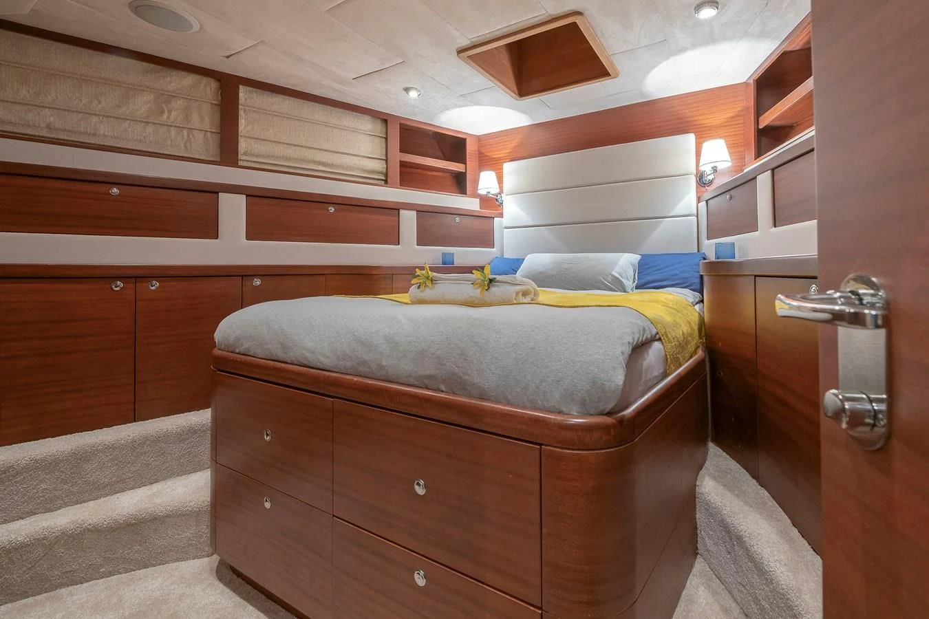 MAXMARA showcases an elegantly styled interior with nautical touches and is adorned with beautiful teak and Alcantara leather wall coverings and teak flooring. The yacht’s interior offers a warm, homelike ambiance featuring an abundance of natural light and plush furnishings. The motor yacht welcomes six guests in three nicely appointed staterooms. She features a master suite with a double bed, a VIP stateroom with a double bed and a twin-bed stateroom. Also, the yacht has one crew cabin.