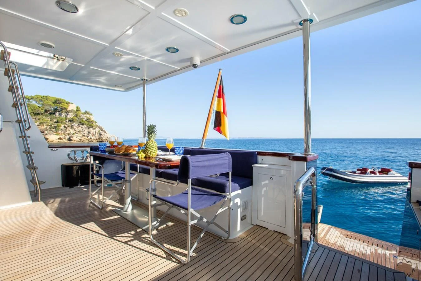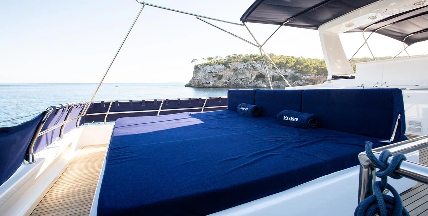 Having the yacht’s tender aft allows the yacht’s flybridge to be fully used for relaxation and entertaining. MAXMARA’s flybridge offers an excellent covered area with ample seating as well as a superb sunbathing area with a large sunpad. The luxury yacht also offers Portuguese bow seating and aft deck alfresco dining.