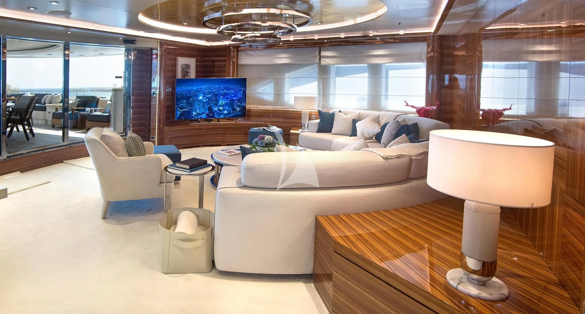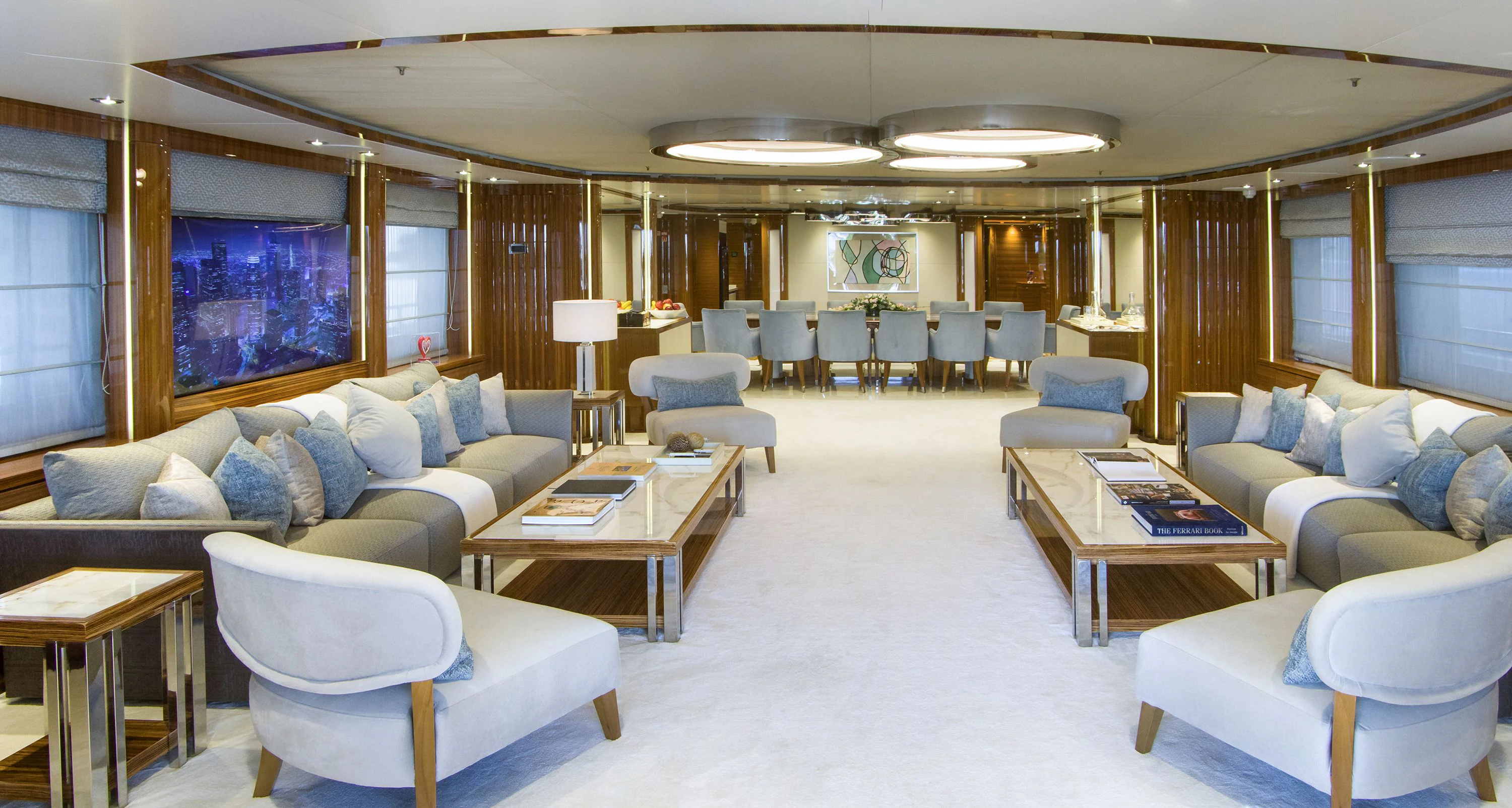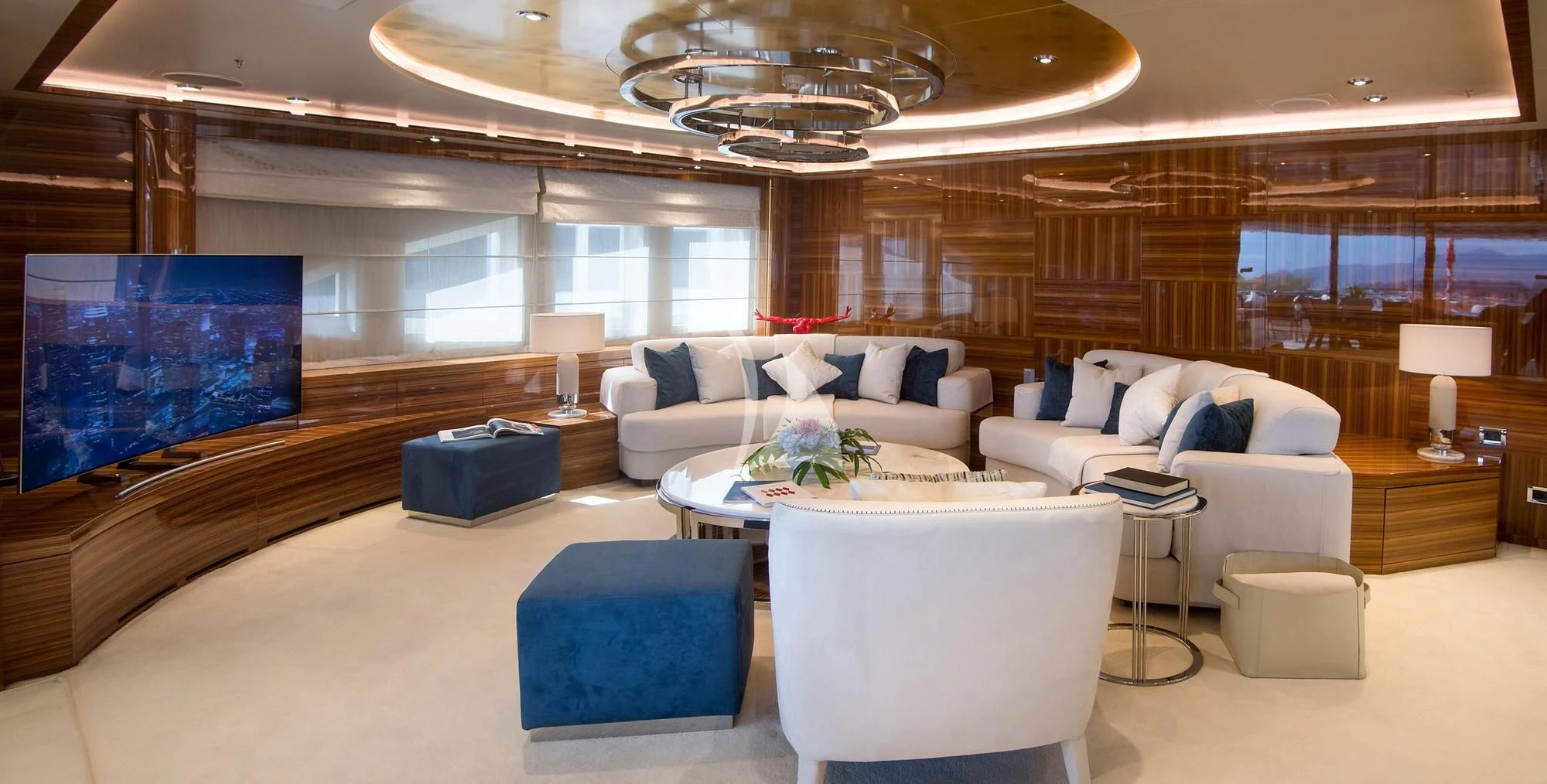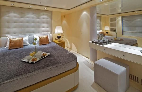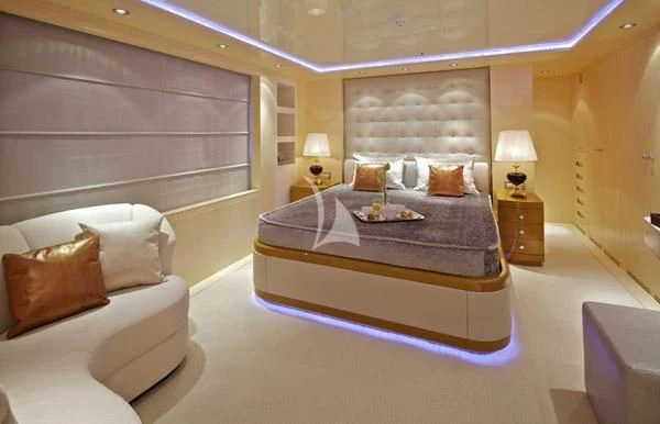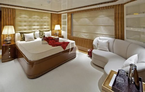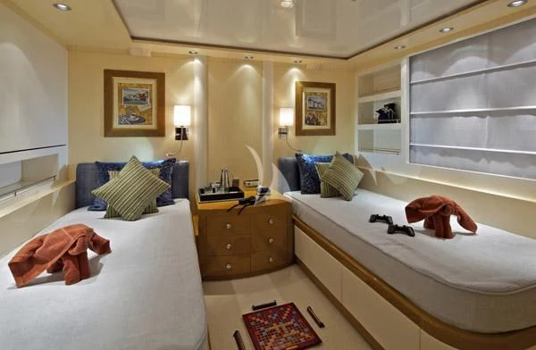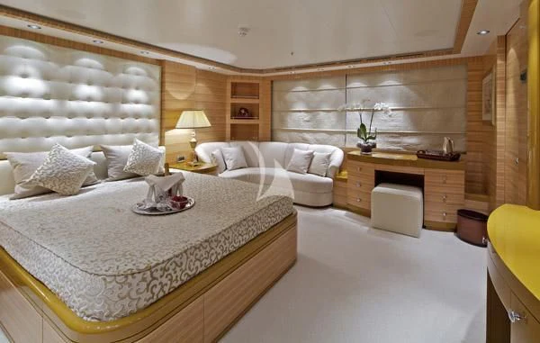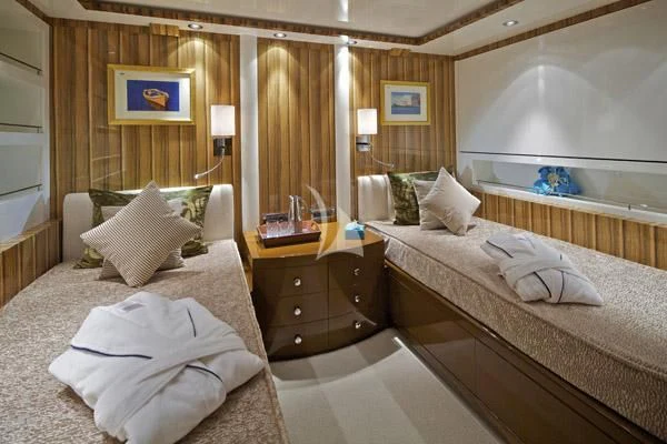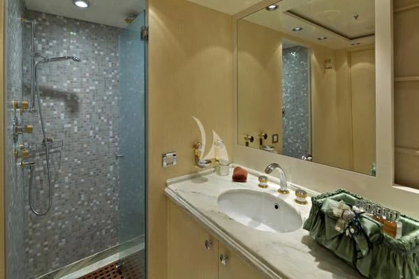 MIA RAMA accommodates up to 12 guests across 7 well-appointed cabins, including four doubles, two twins, and one convertible cabin, offering flexible arrangements for families or mixed charter groups. The interior is complemented by a professional crew of 12, ensuring attentive service and smooth operations.