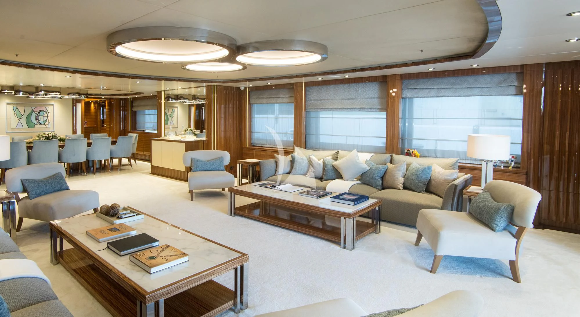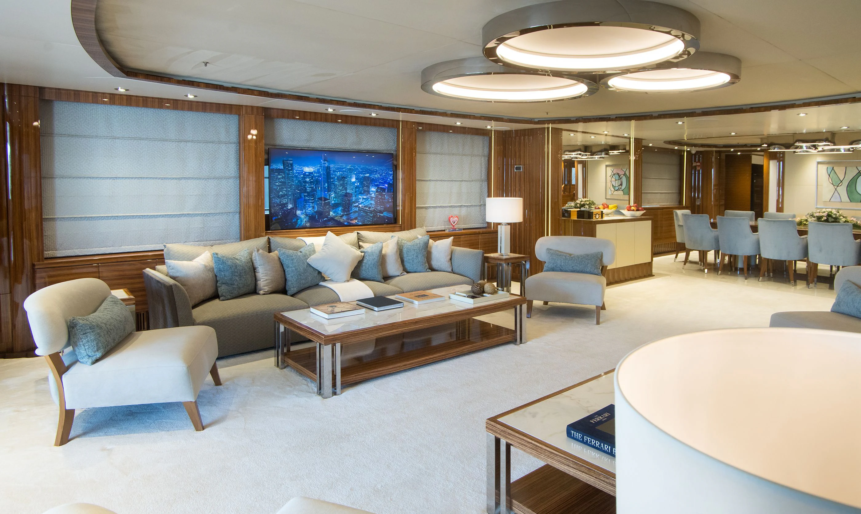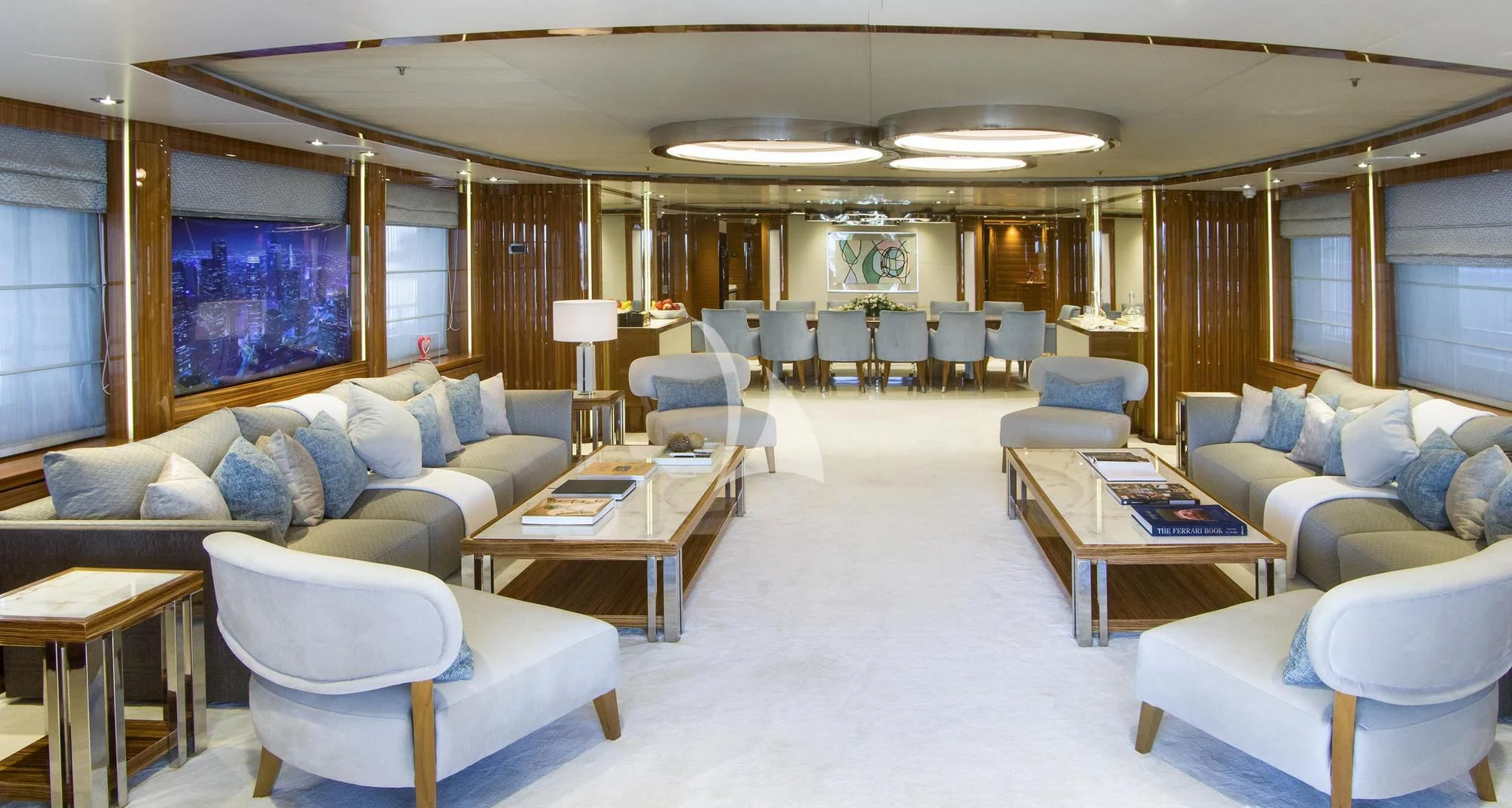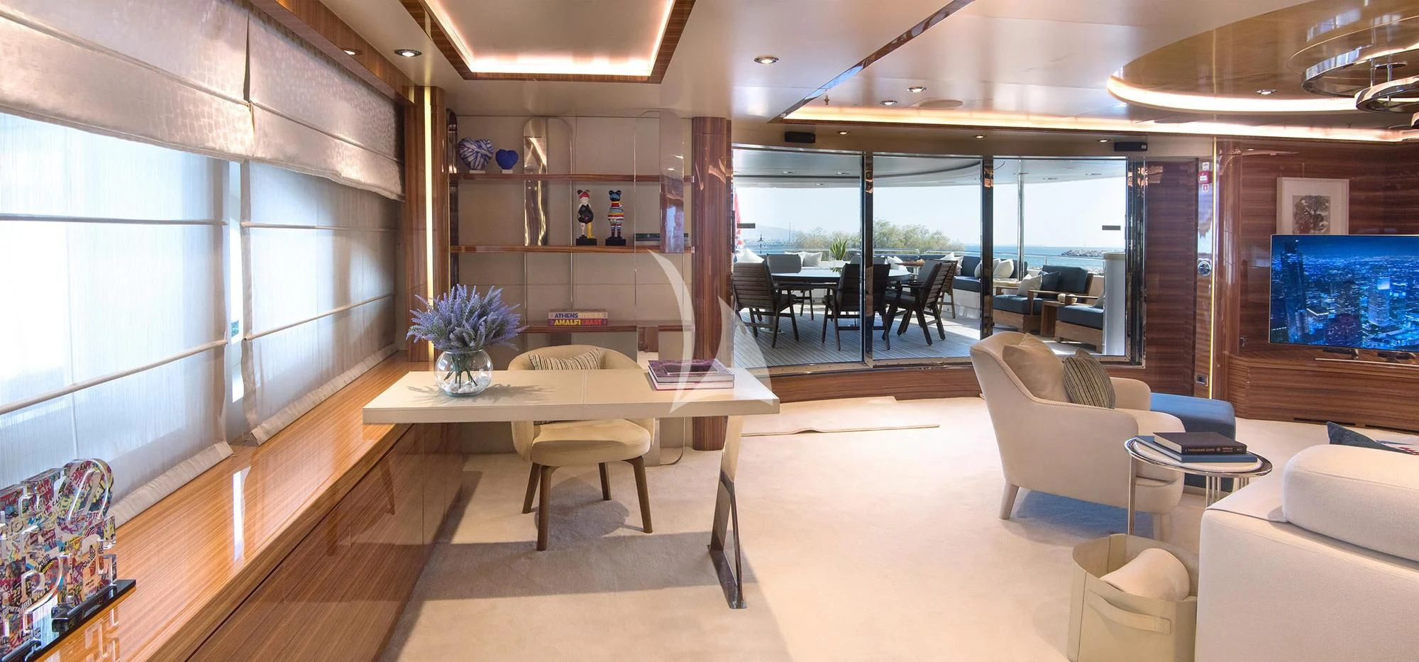 MIA RAMA accommodates up to 12 guests across 7 well-appointed cabins, including four doubles, two twins, and one convertible cabin, offering flexible arrangements for families or mixed charter groups. The interior is complemented by a professional crew of 12, ensuring attentive service and smooth operations.
