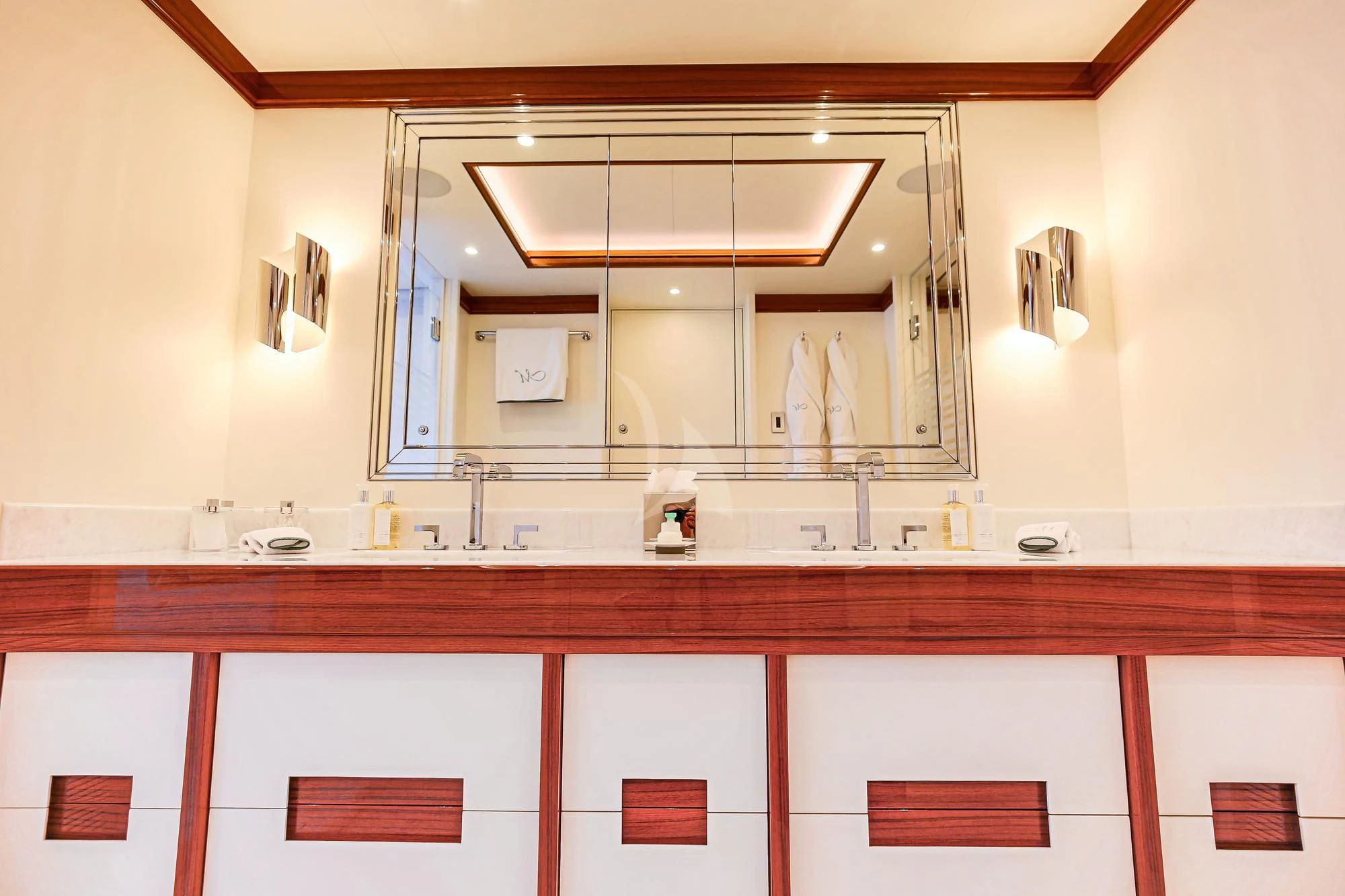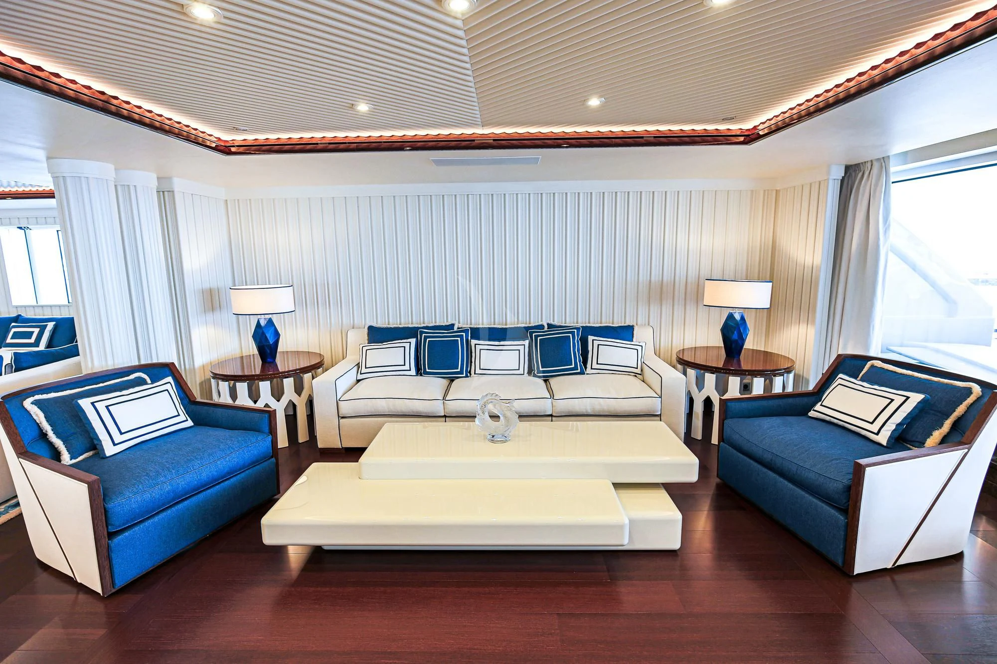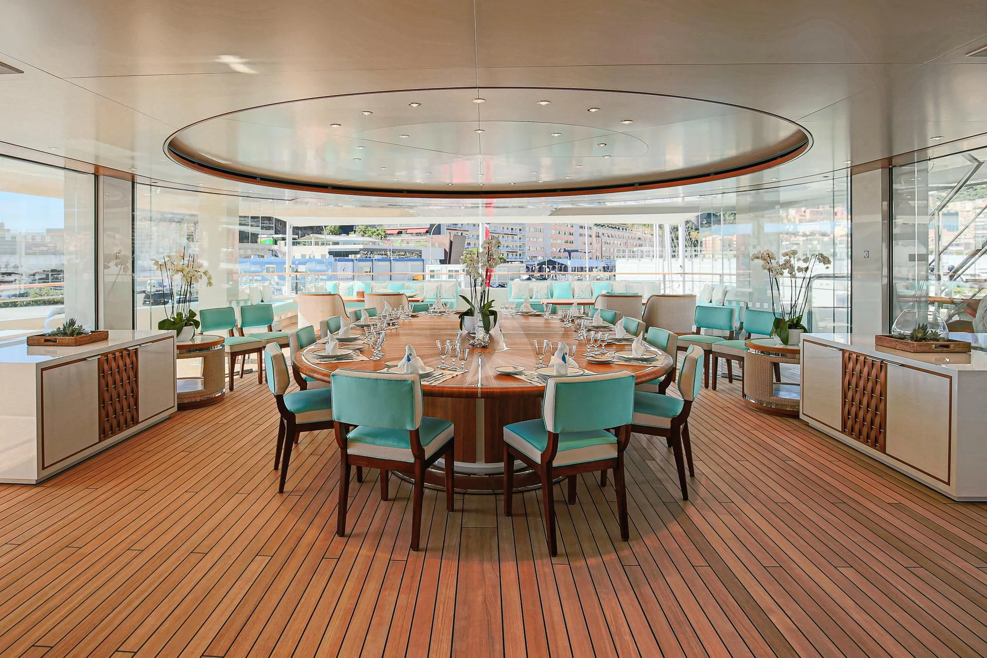 An absolute marvel in terms of exterior design, MIMTEE's broad beam stretches to an impressive 45 feet (13.5 meters), providing expansive deck areas for relaxation and entertainment. The sundeck beckons with its sun-drenched lounging spaces where guests can bask in luxury while taking in the panoramic views of the seascape. Alfresco dining areas are seamlessly integrated into her layout, offering divine gastronomic experiences under starlit skies or warm sunshine.