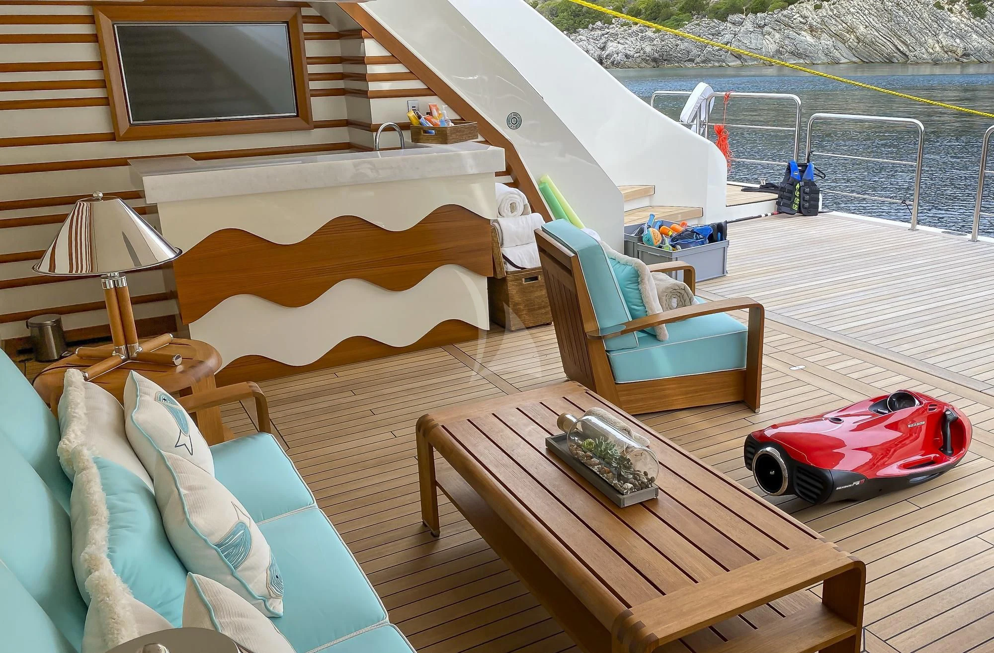 MIMTEE's beach club adds another dimension to sea life enjoyment; imagine diving into azure waters right from your own private deck! Moreover, she houses an extensive inventory of water toys adding more fun-filled layers to your ocean adventure!