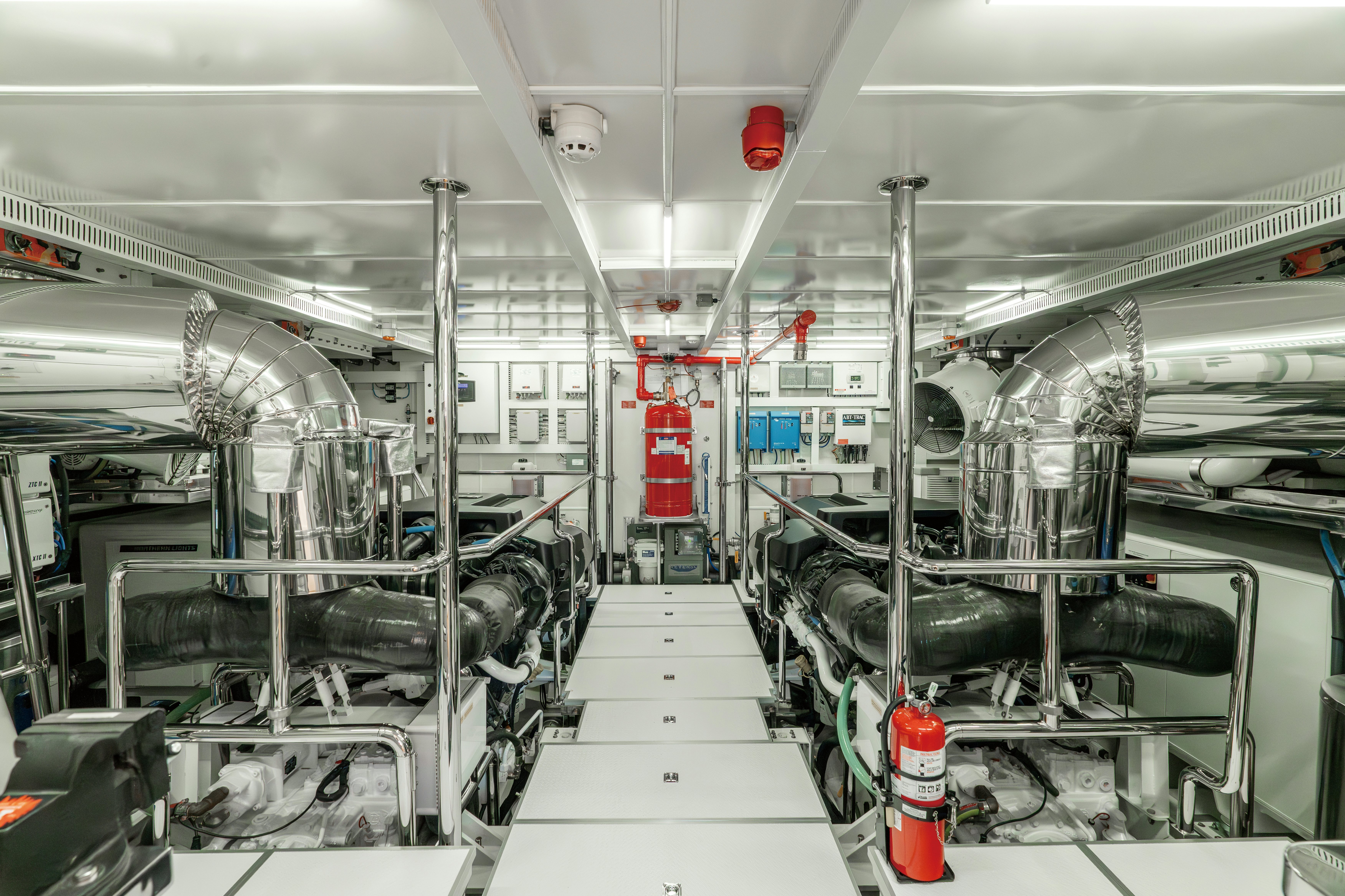 The hydraulic tender garage holds a Williams Jet 445 and ample storage for gear, accessed via a Besenzoni retractable gangway. Underwater lights add to her evening presence at anchor, while thoughtful design touches throughout reflect a yacht built without compromise.
