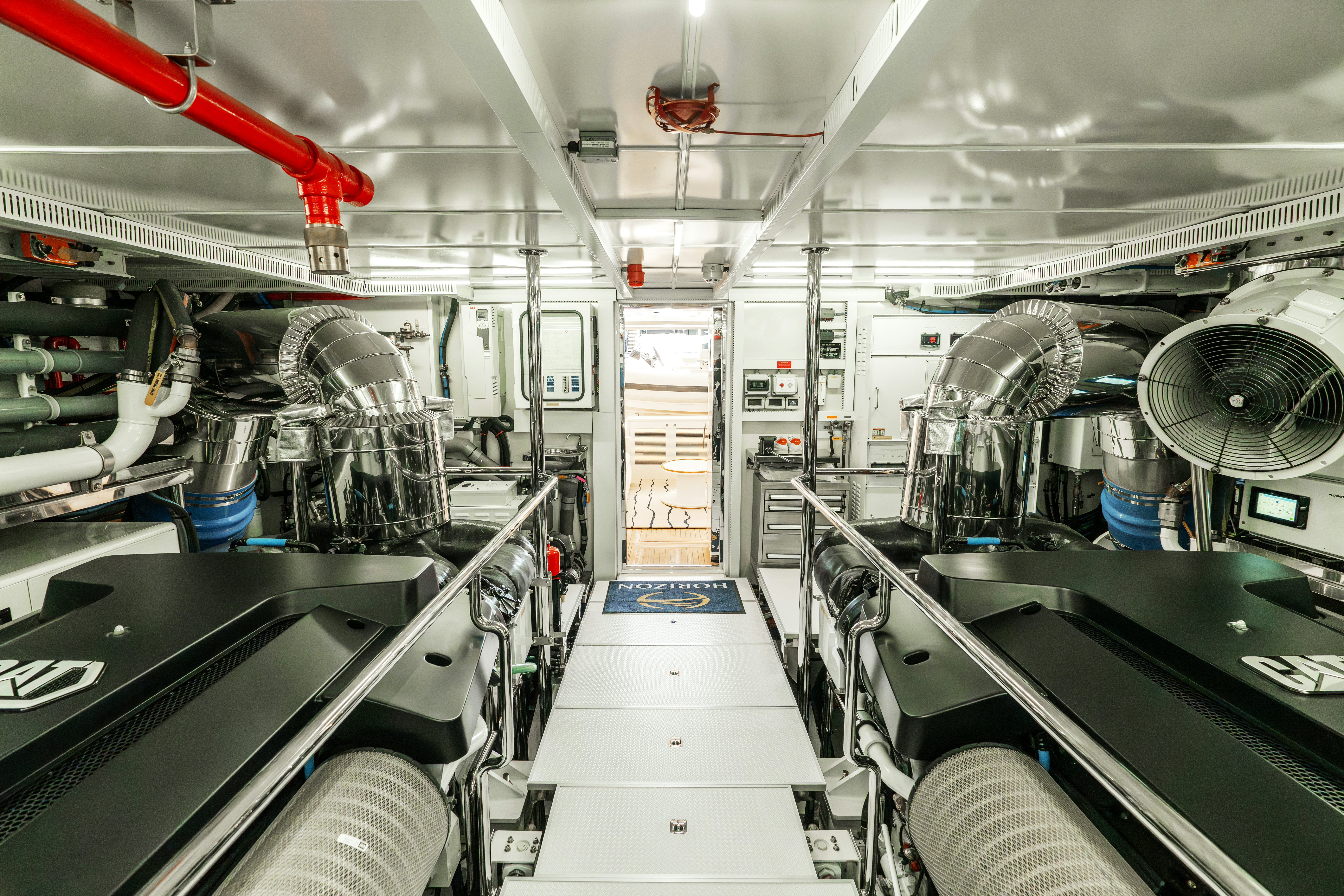 Built on Horizon’s proven high-performance hull form, MISS MICHELLE features a piercing bow design and is constructed using Horizon’s proprietary SCRIMP™ resin-infusion technology for increased strength, reduced weight, and improved efficiency. Her twin Caterpillar C32B engines deliver a fast cruise of 16 knots and a top speed of 20 knots. ABT zero-speed fin stabilizers and 65hp bow and stern thrusters provide unmatched comfort and control, whether running at speed or settling into a quiet anchorage. A full Furuno navigation suite and Starlink connectivity ensure operational confidence in any cruising scenario.