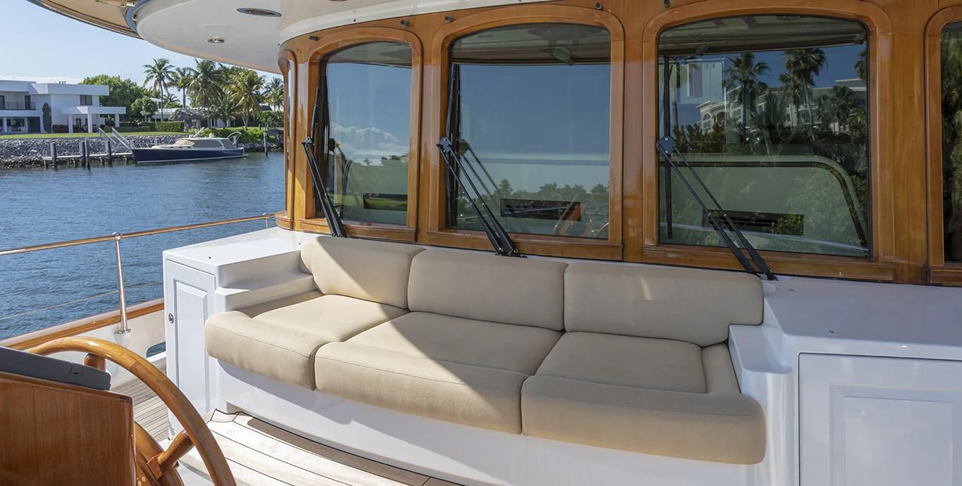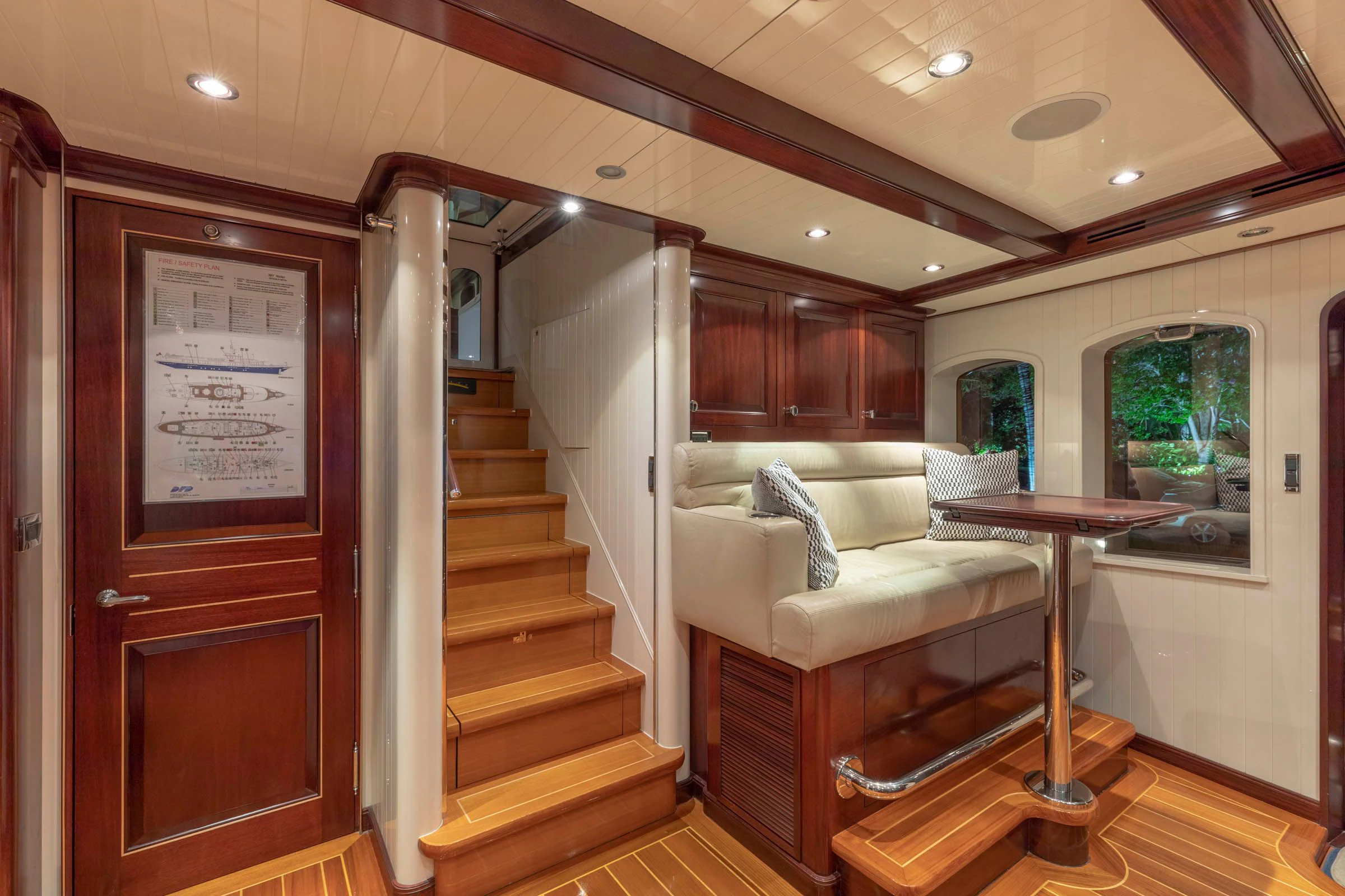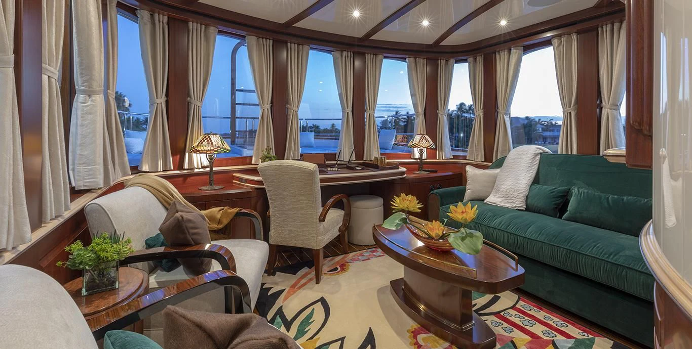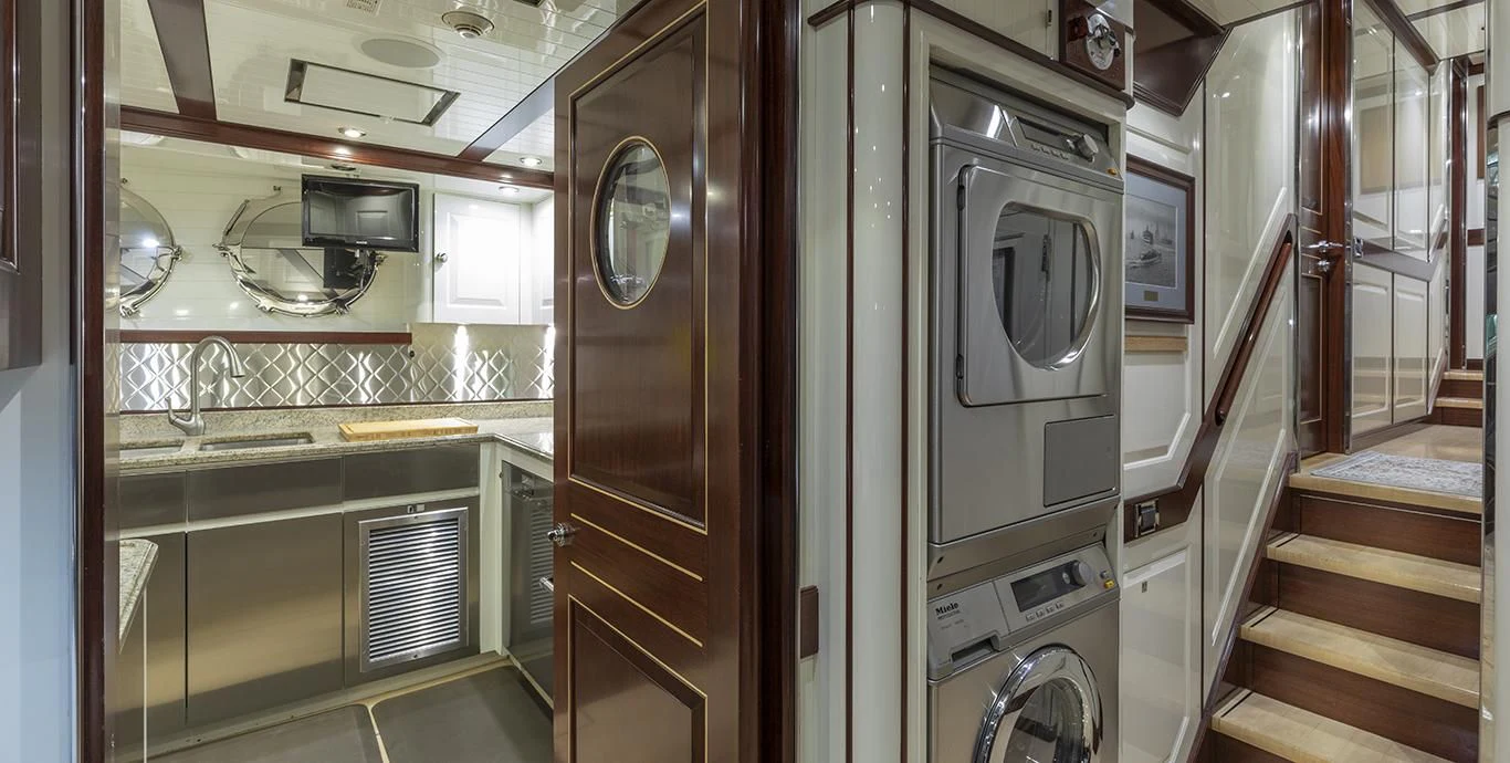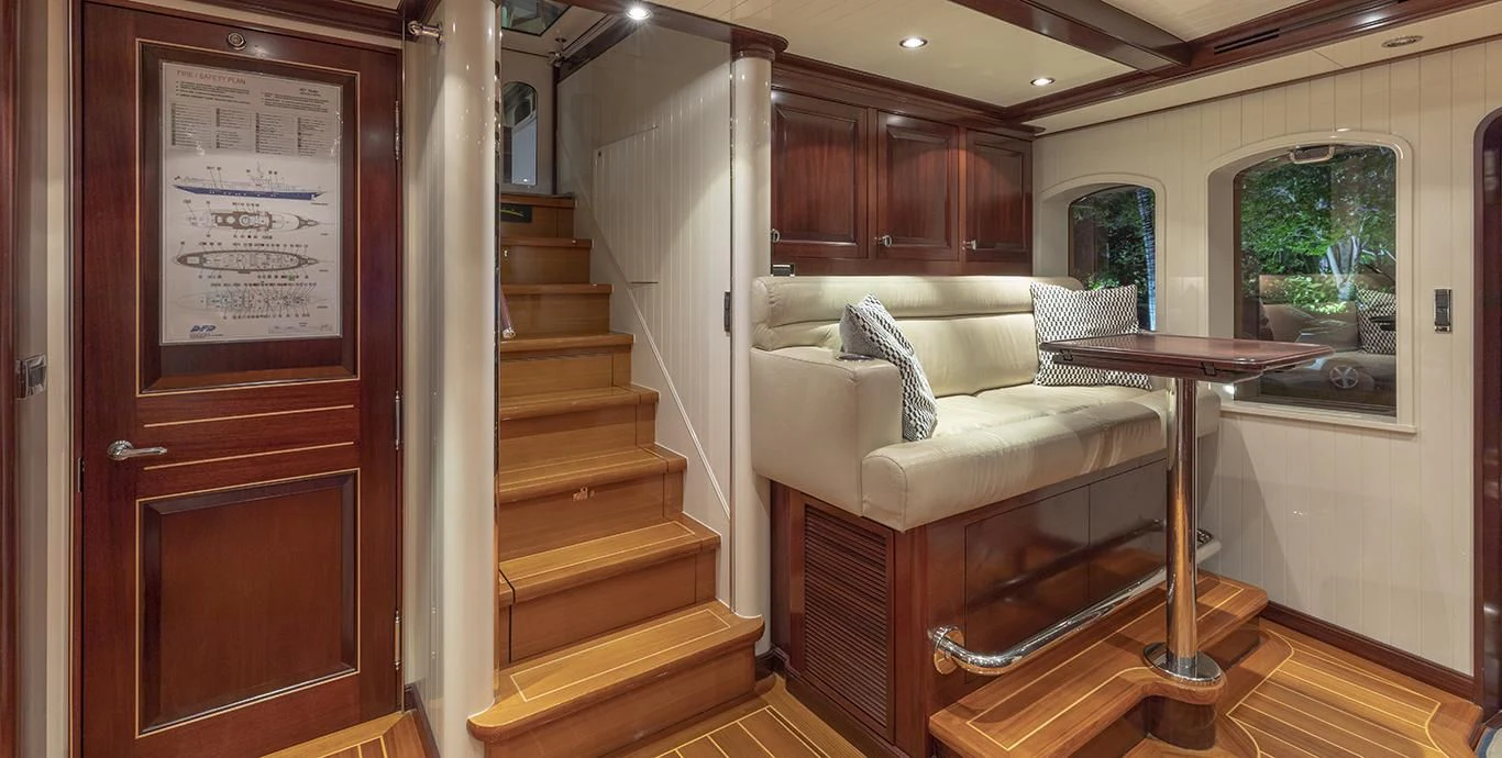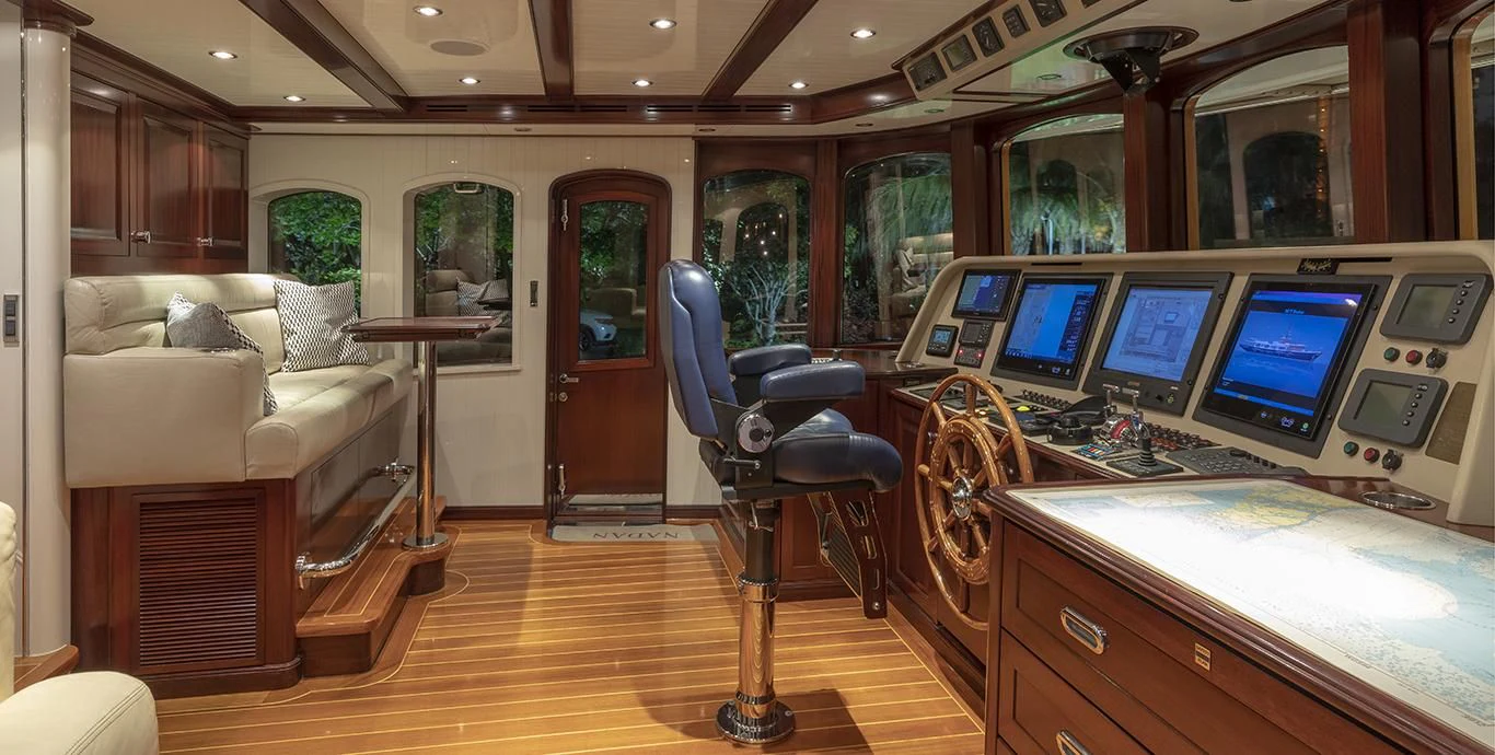 In terms of utilities, NADAN is outfitted with advanced systems including Dometic central chilled air conditioning system providing optimal indoor climate control regardless of external weather conditions; Quantum thrusters at bow and stern aiding maneuverability; Asea shore power converter facilitating seamless transition between different power sources; along with dedicated battery banks ensuring uninterrupted operation of critical systems such as radios & navigation equipment.