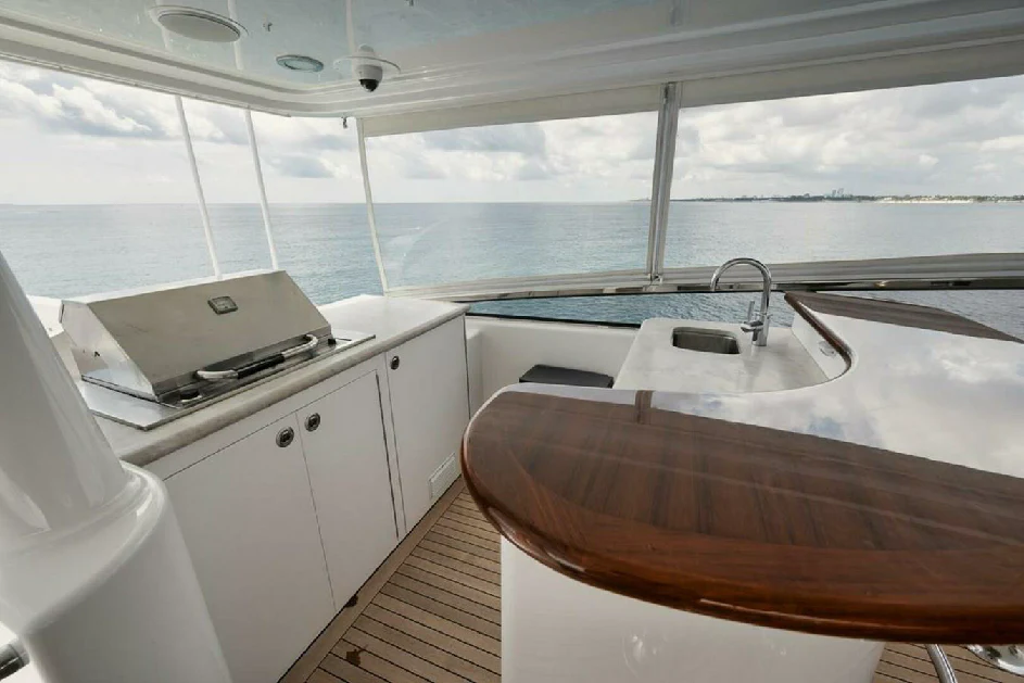 The exterior design of NATURAL 9 captivates with its grandeur and elegance. Its striking silhouette is complemented by a beam width of over 23 feet (7.2 meters), providing ample space for outdoor relaxation and entertainment. The sundeck invites guests to bask under the sun or unwind in the Jacuzzi while enjoying panoramic views of the surroundings. As night falls, underwater lights create an enchanting ambiance that enhances alfresco dining experiences on board.