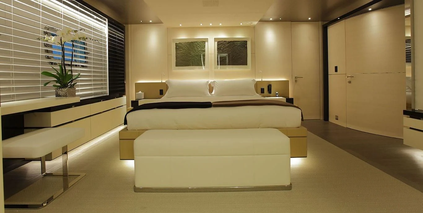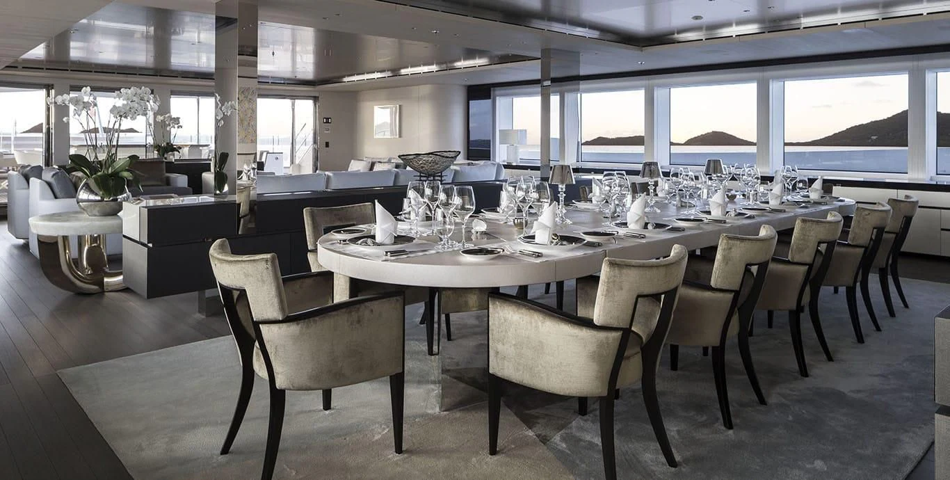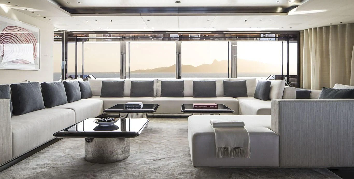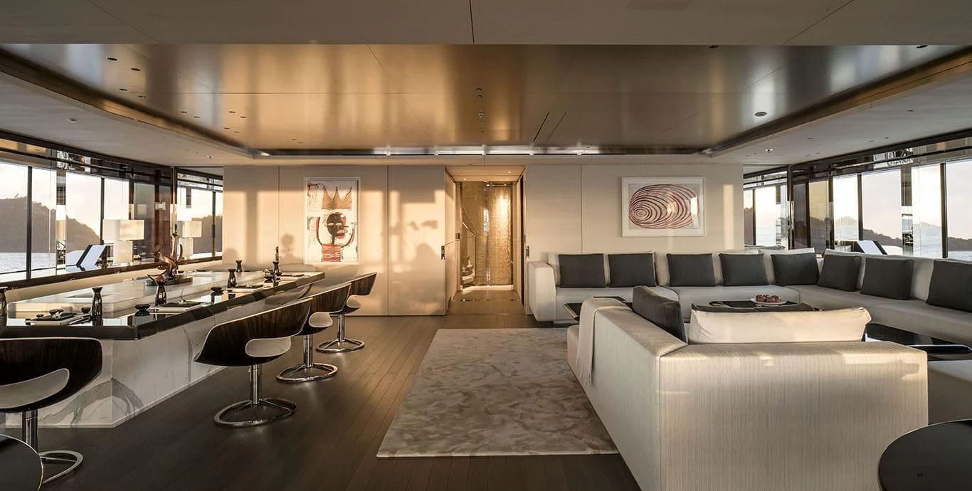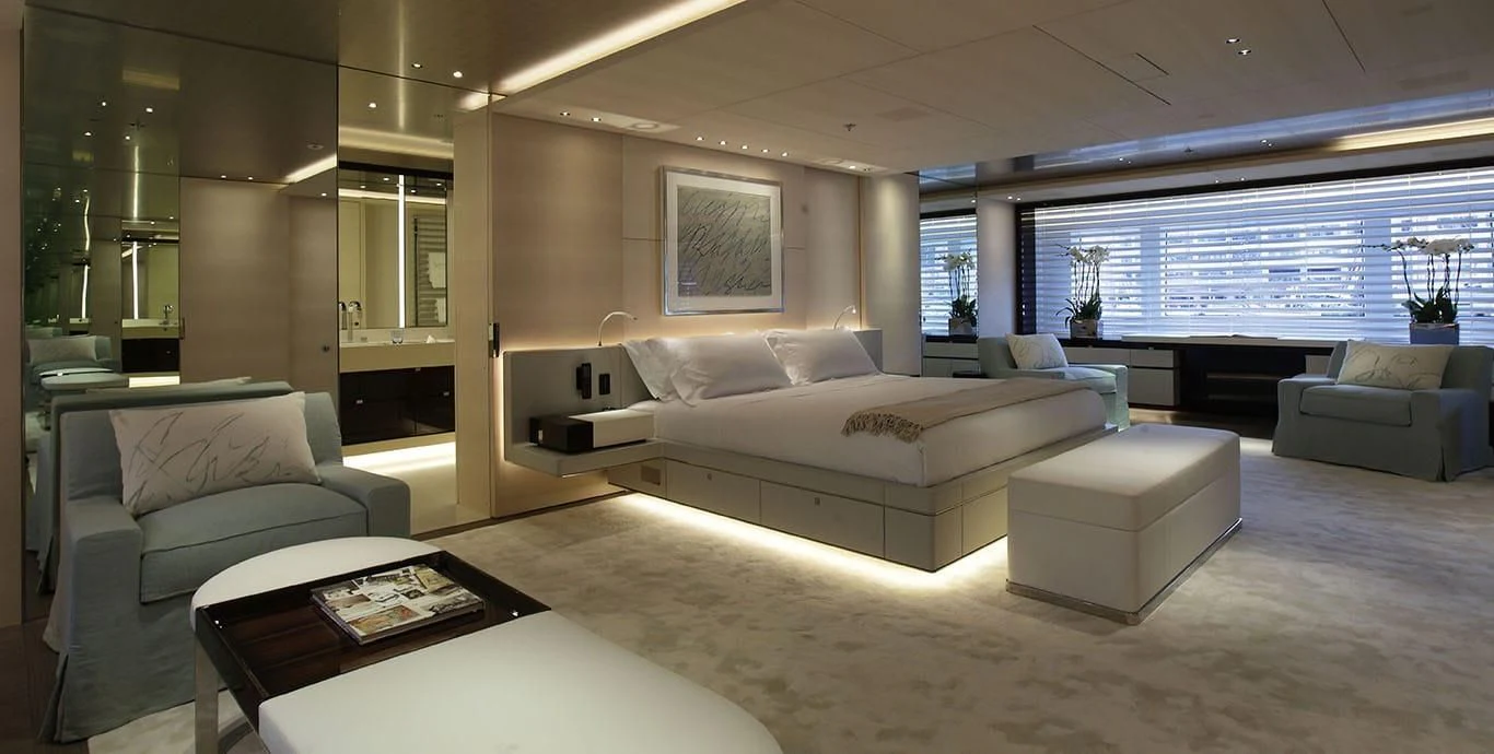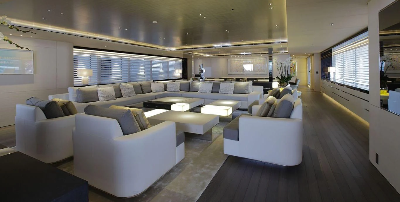 Stepping inside this magnificent vessel, one is immediately struck by the tasteful blend of comfort and sophistication that defines her interior design scheme. Seven luxurious cabins can comfortably accommodate up to twelve guests while twenty-two dedicated crew members ensure every need is met with utmost precision and care. The master stateroom stands as a testament to refined taste featuring plush furnishings complemented by rich textures and warm hues creating an ambiance of understated elegance.