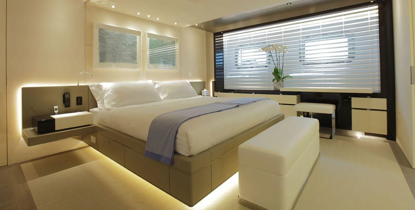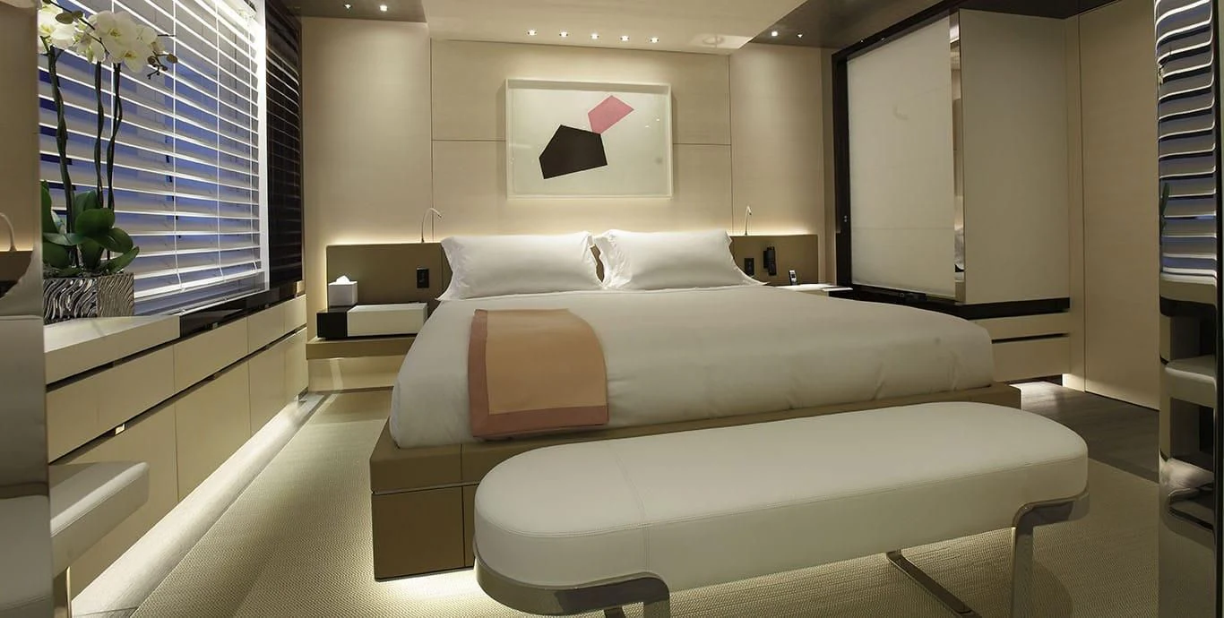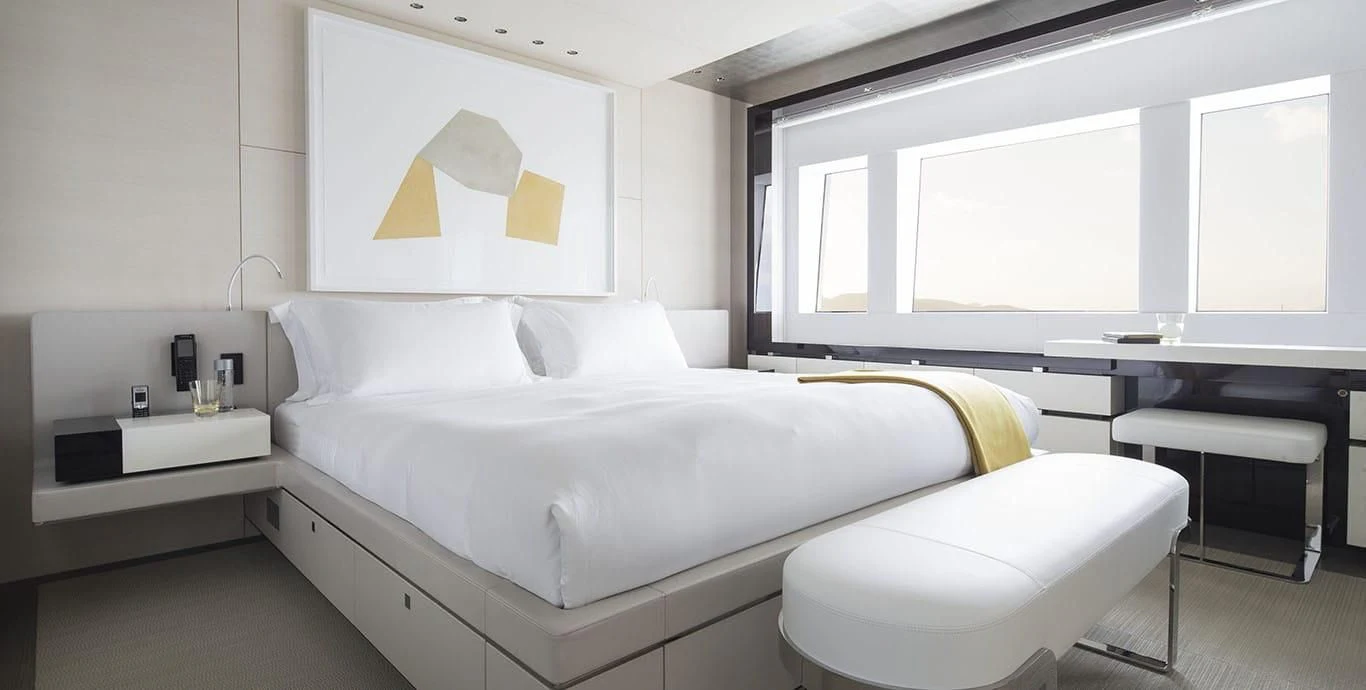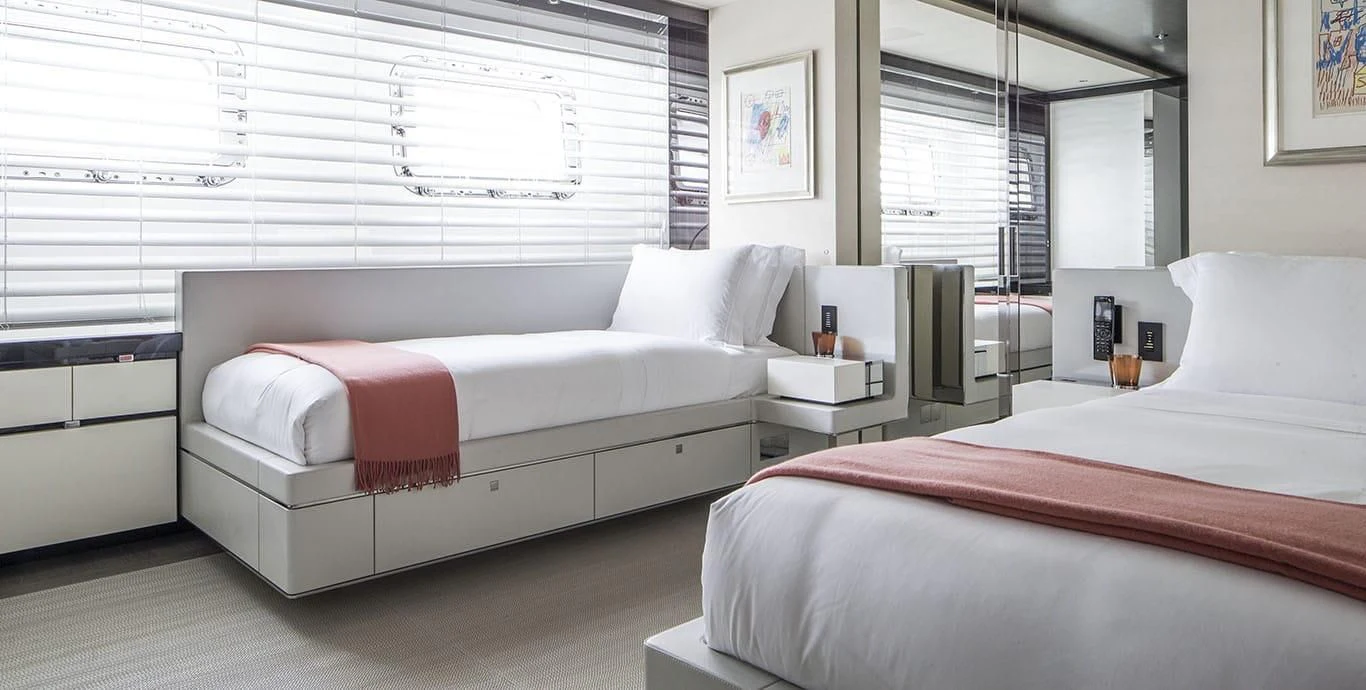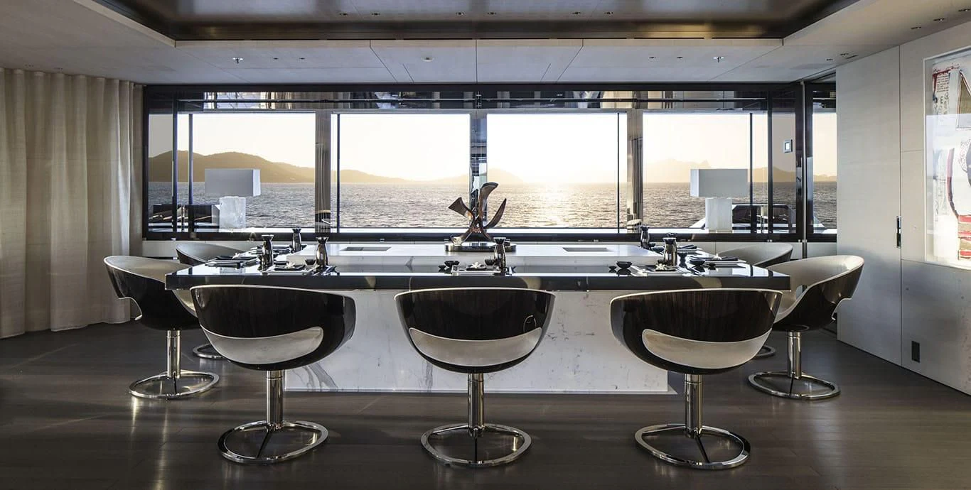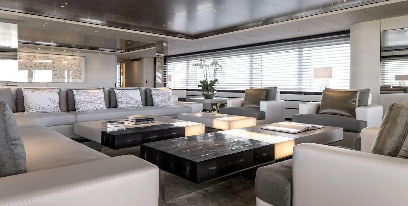 Stepping inside this magnificent vessel, one is immediately struck by the tasteful blend of comfort and sophistication that defines her interior design scheme. Seven luxurious cabins can comfortably accommodate up to twelve guests while twenty-two dedicated crew members ensure every need is met with utmost precision and care. The master stateroom stands as a testament to refined taste featuring plush furnishings complemented by rich textures and warm hues creating an ambiance of understated elegance.