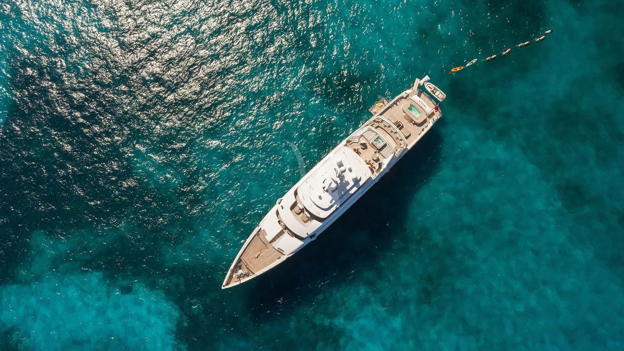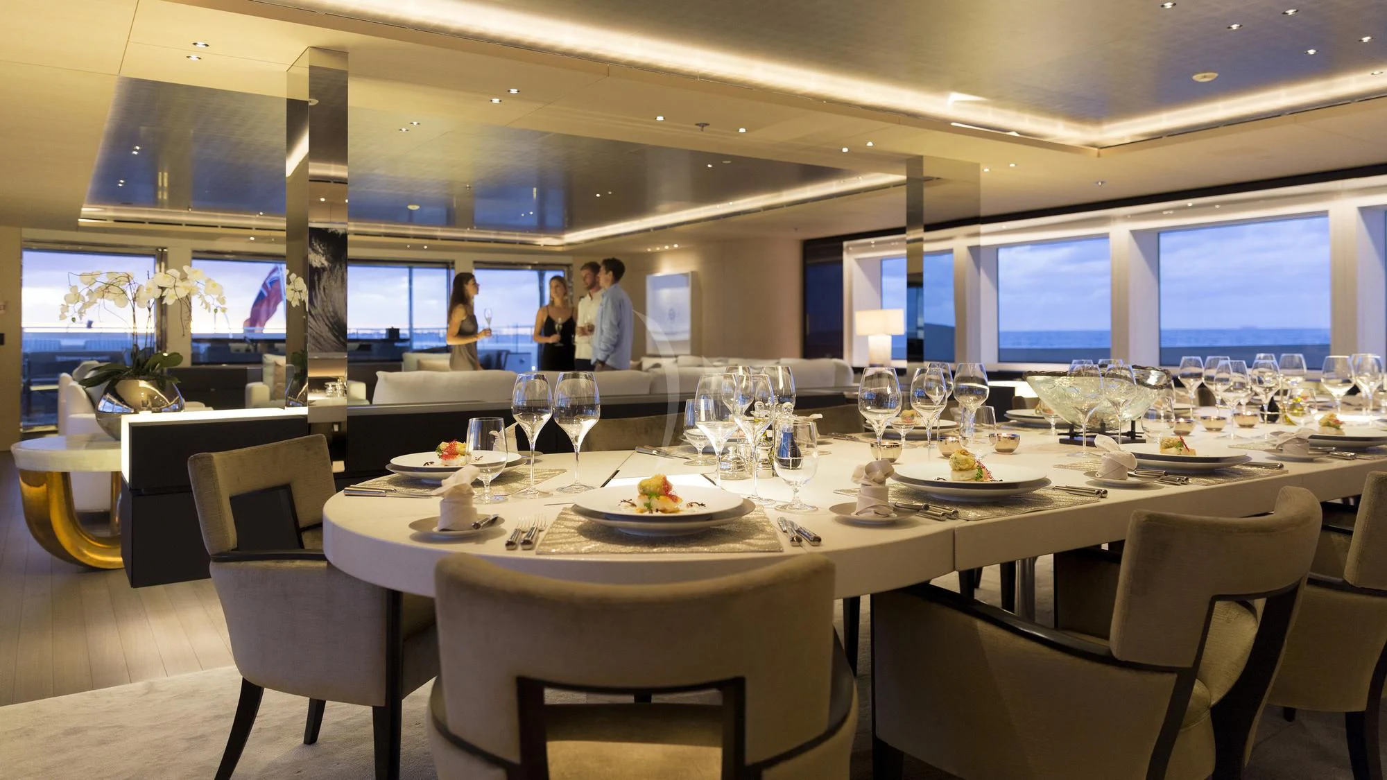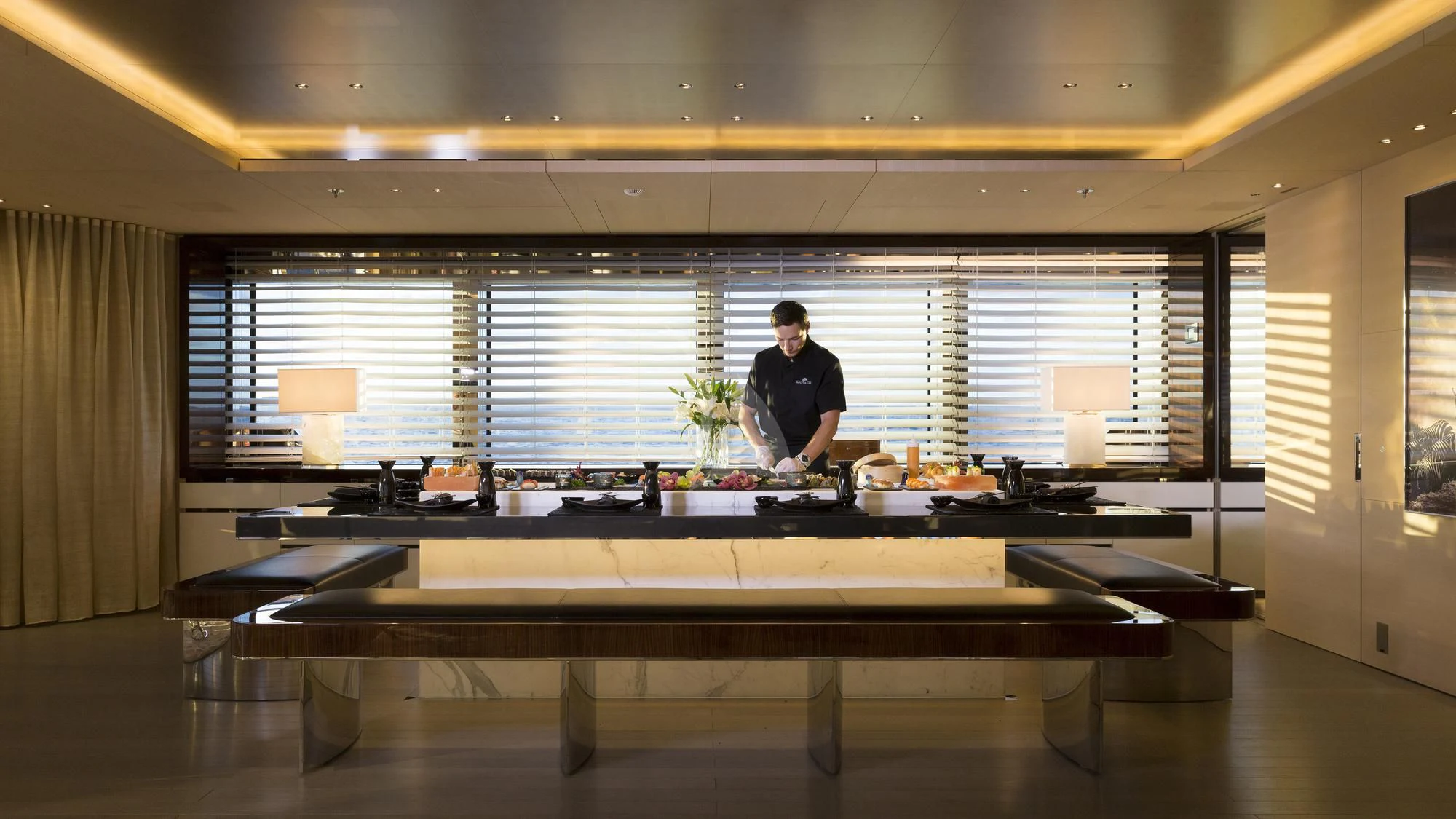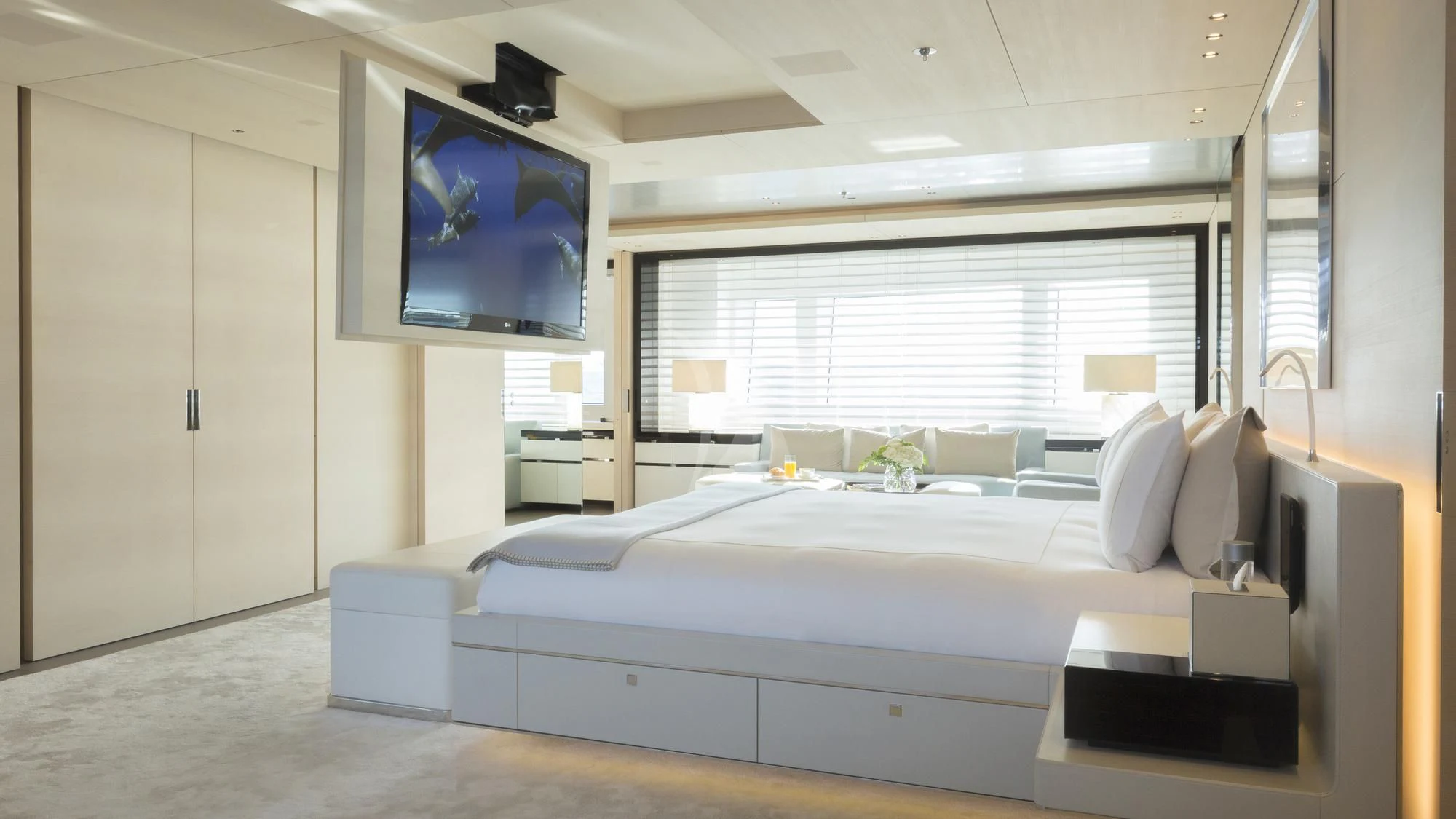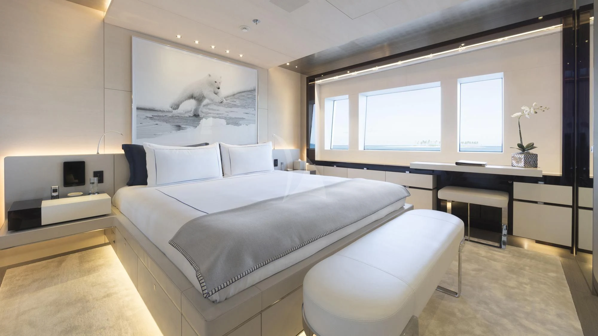 Stepping inside this magnificent vessel, one is immediately struck by the tasteful blend of comfort and sophistication that defines her interior design scheme. Seven luxurious cabins can comfortably accommodate up to twelve guests while twenty-two dedicated crew members ensure every need is met with utmost precision and care. The master stateroom stands as a testament to refined taste featuring plush furnishings complemented by rich textures and warm hues creating an ambiance of understated elegance.