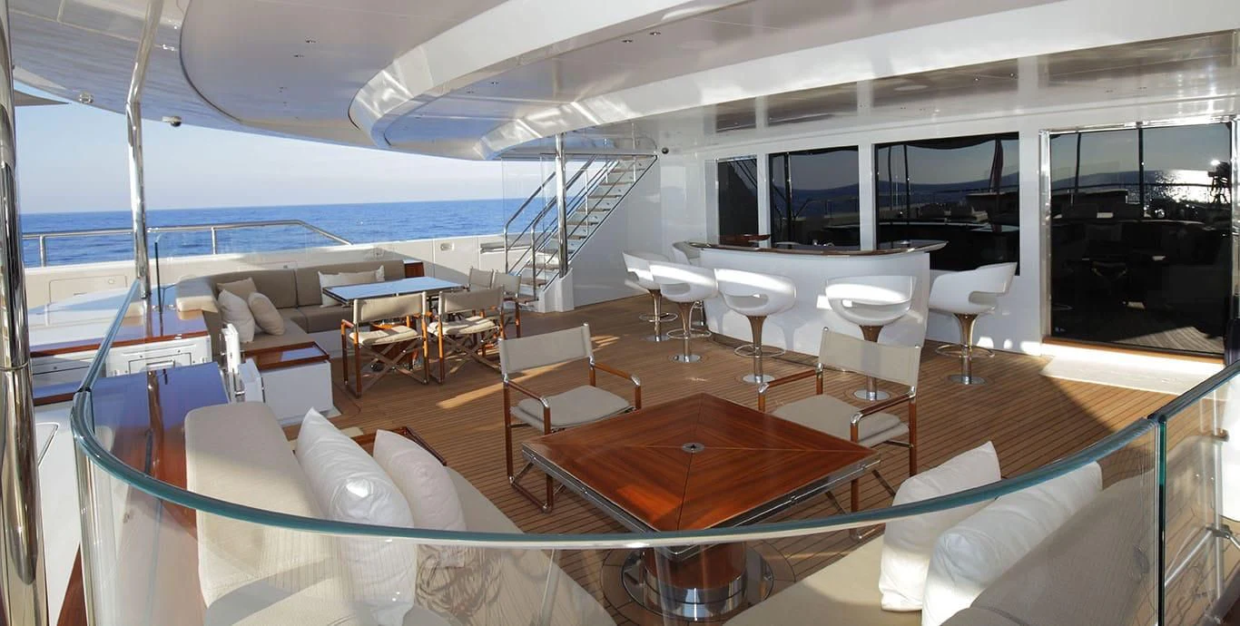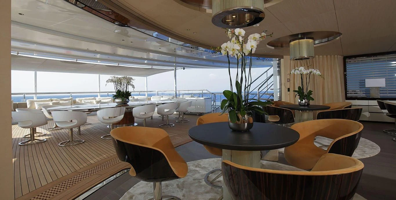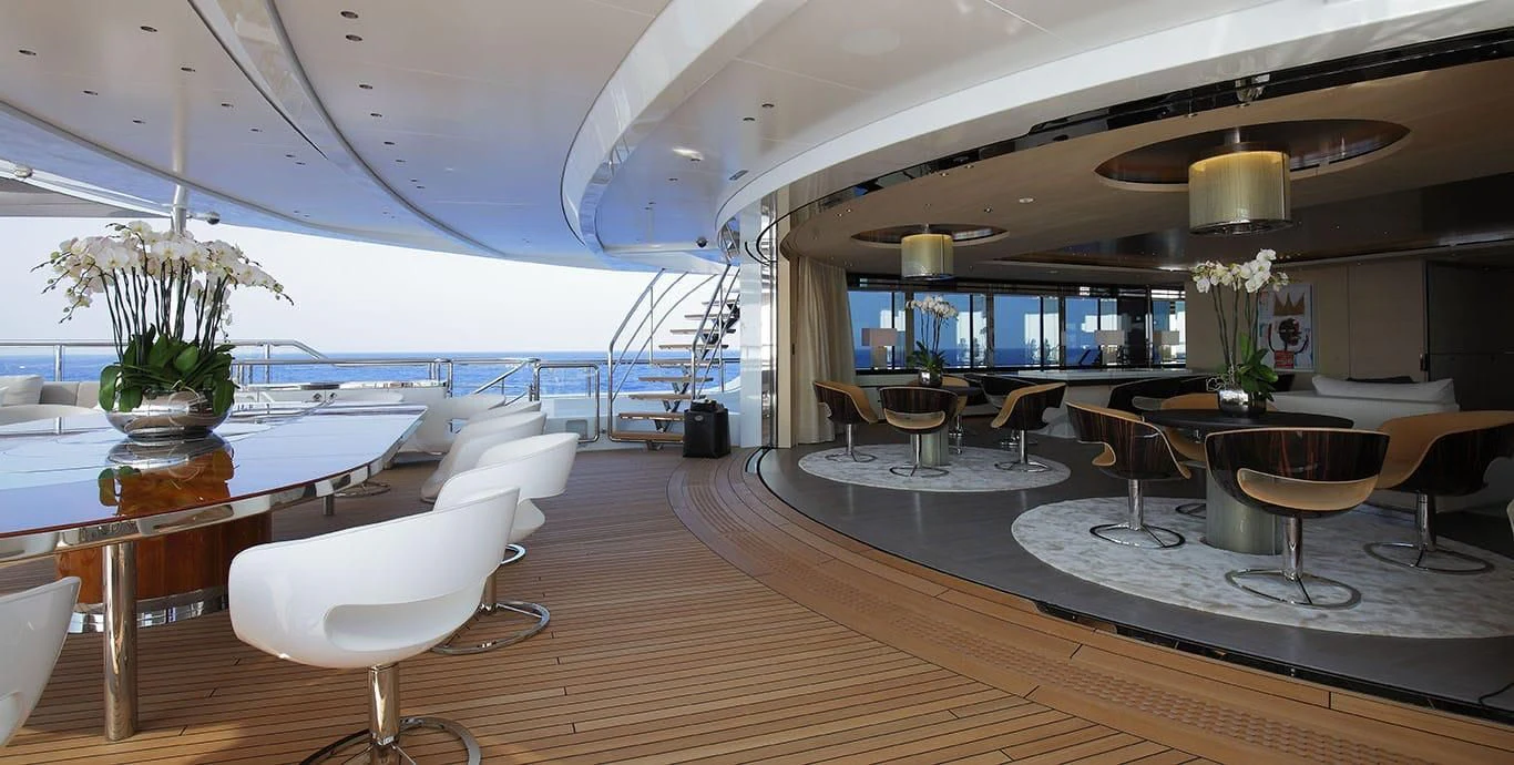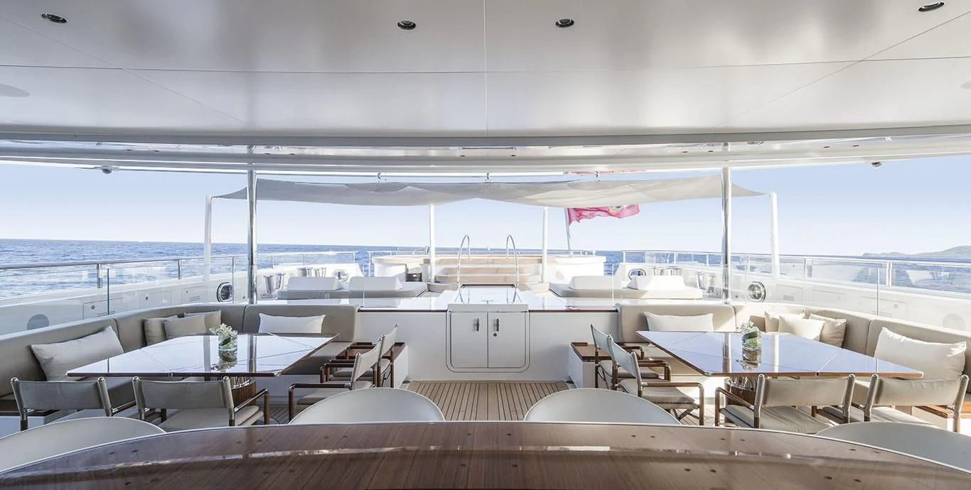 The exterior design of the NAUTILUS is nothing short of breathtaking; she possesses an imposing stature that commands attention wherever she sails, yet there's an undeniable elegance that softens her powerful presence. Her expansive sundeck offers ample space for sunbathing or simply enjoying the panoramic views that surround you on all sides during your voyage. Alfresco dining areas provide perfect settings for memorable meals under the stars while lounging areas invite guests to relax and unwind in style.