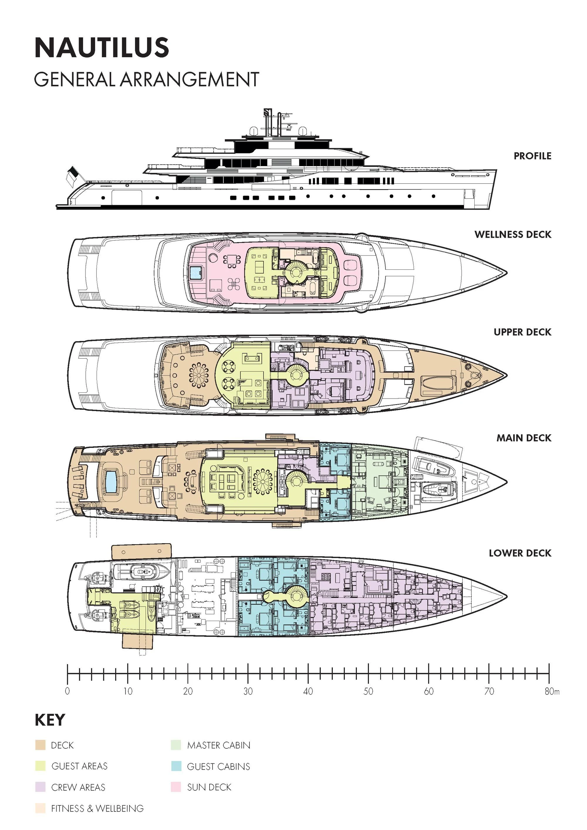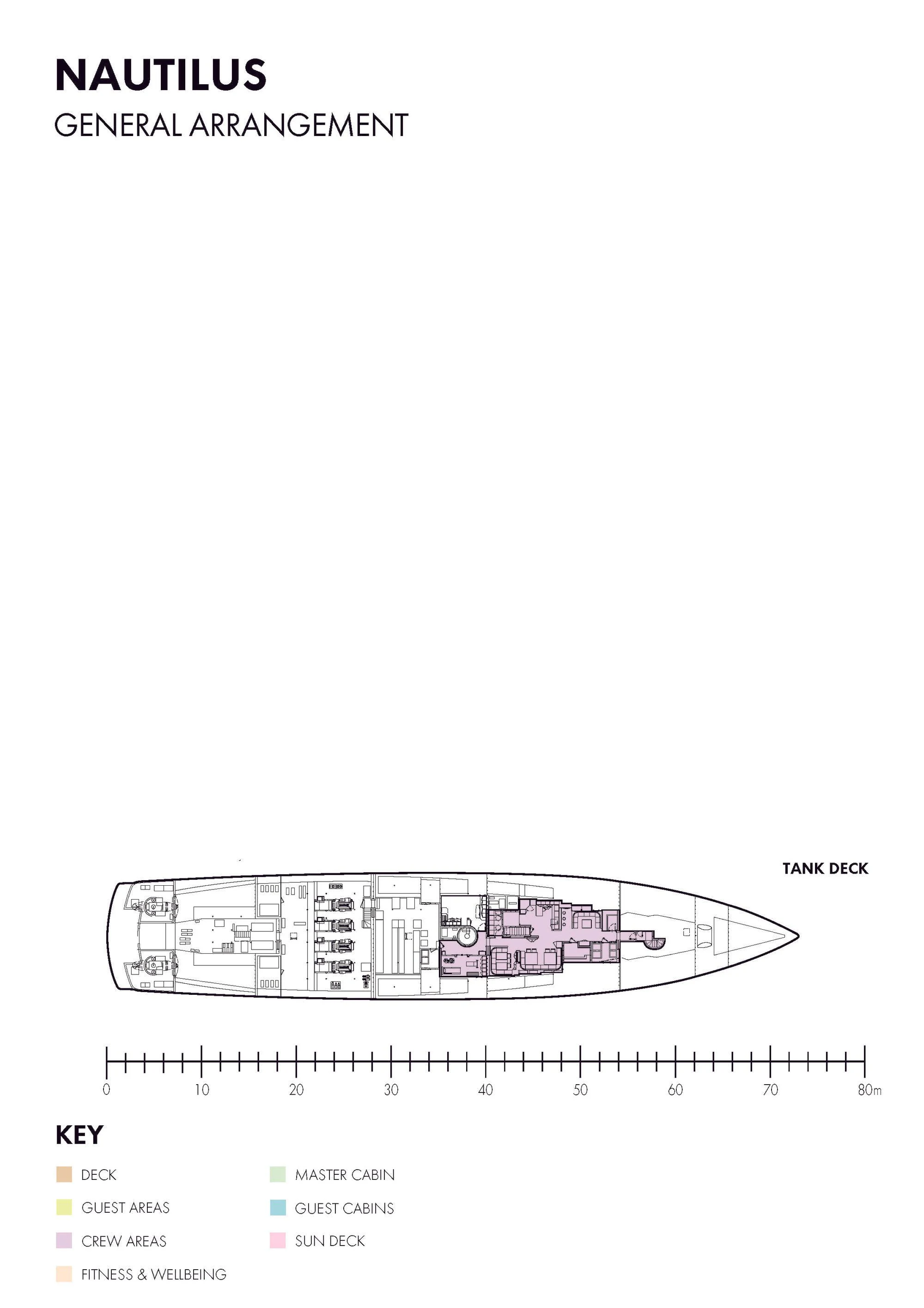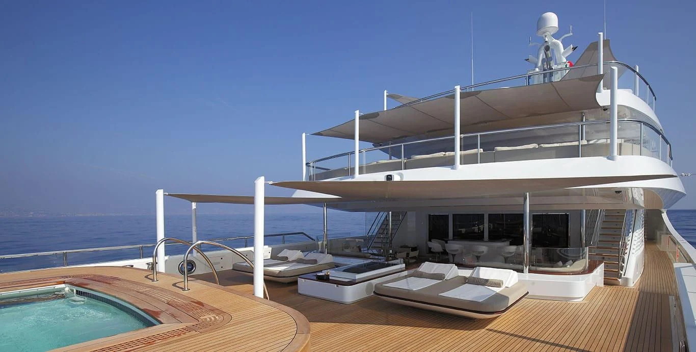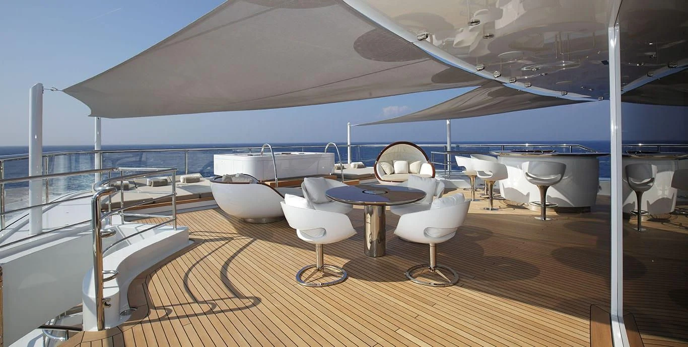 The exterior design of the NAUTILUS is nothing short of breathtaking; she possesses an imposing stature that commands attention wherever she sails, yet there's an undeniable elegance that softens her powerful presence. Her expansive sundeck offers ample space for sunbathing or simply enjoying the panoramic views that surround you on all sides during your voyage. Alfresco dining areas provide perfect settings for memorable meals under the stars while lounging areas invite guests to relax and unwind in style.