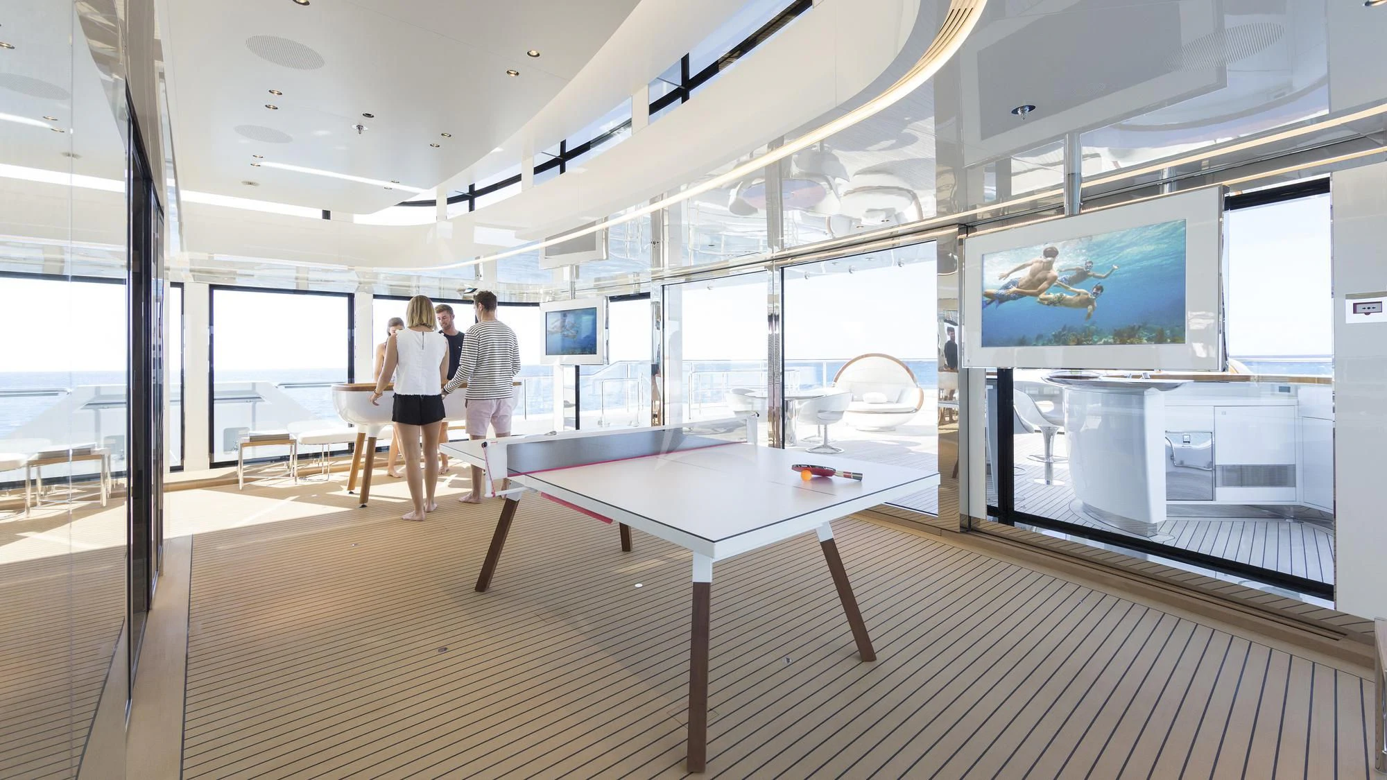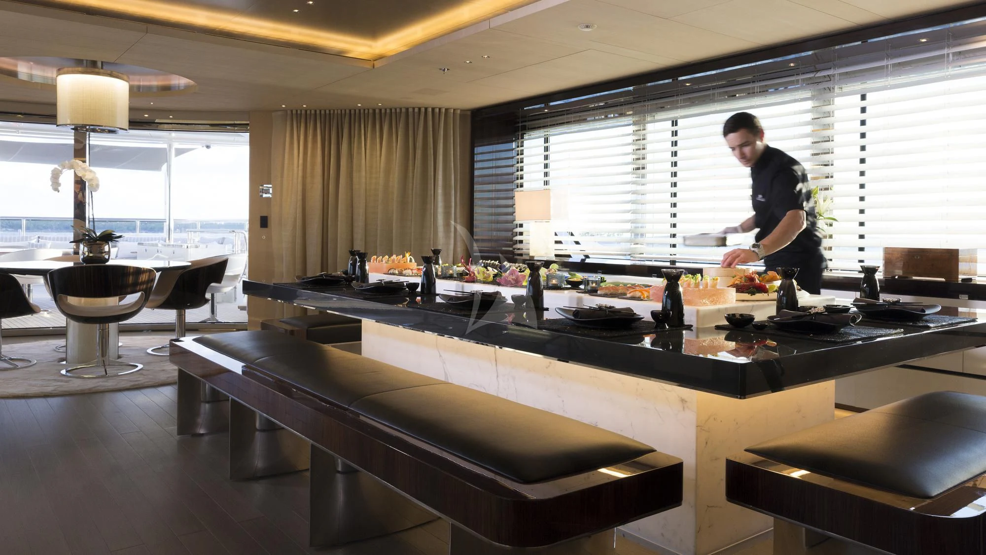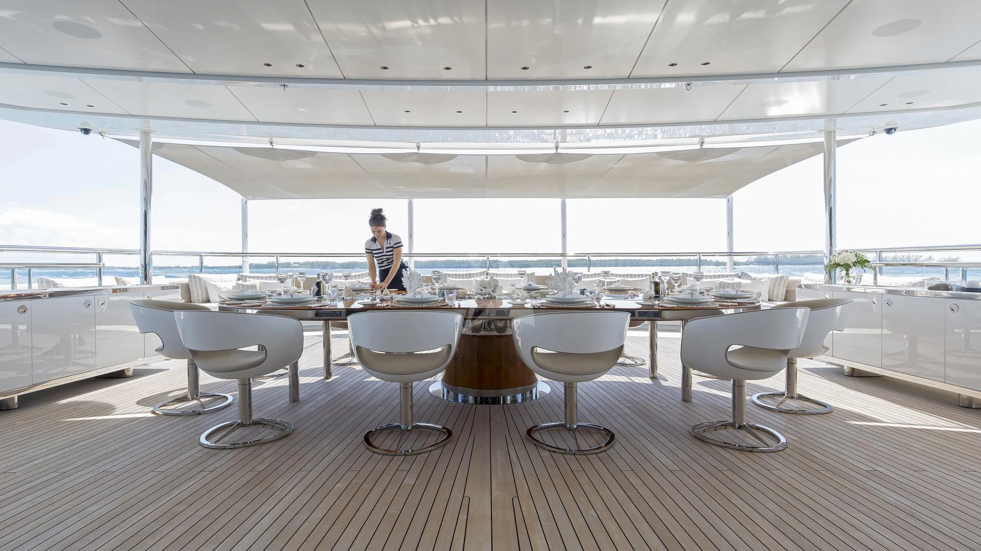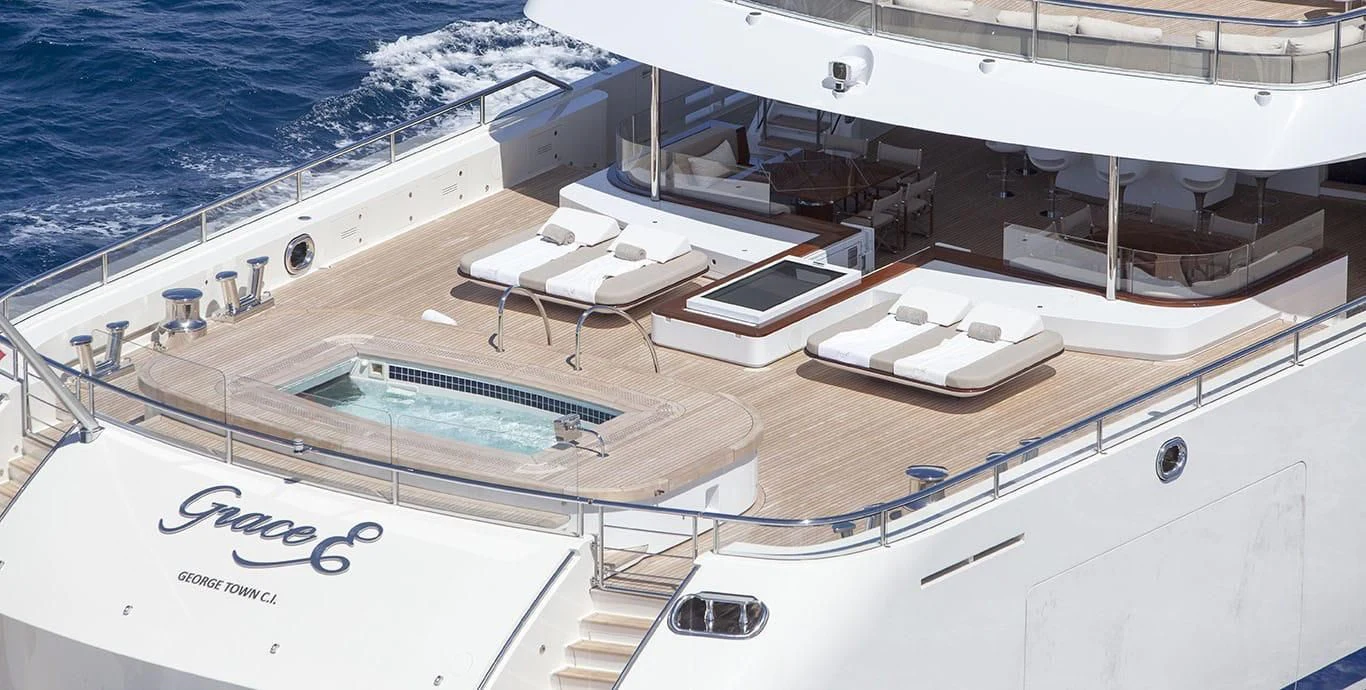 The exterior design of the NAUTILUS is nothing short of breathtaking; she possesses an imposing stature that commands attention wherever she sails, yet there's an undeniable elegance that softens her powerful presence. Her expansive sundeck offers ample space for sunbathing or simply enjoying the panoramic views that surround you on all sides during your voyage. Alfresco dining areas provide perfect settings for memorable meals under the stars while lounging areas invite guests to relax and unwind in style.