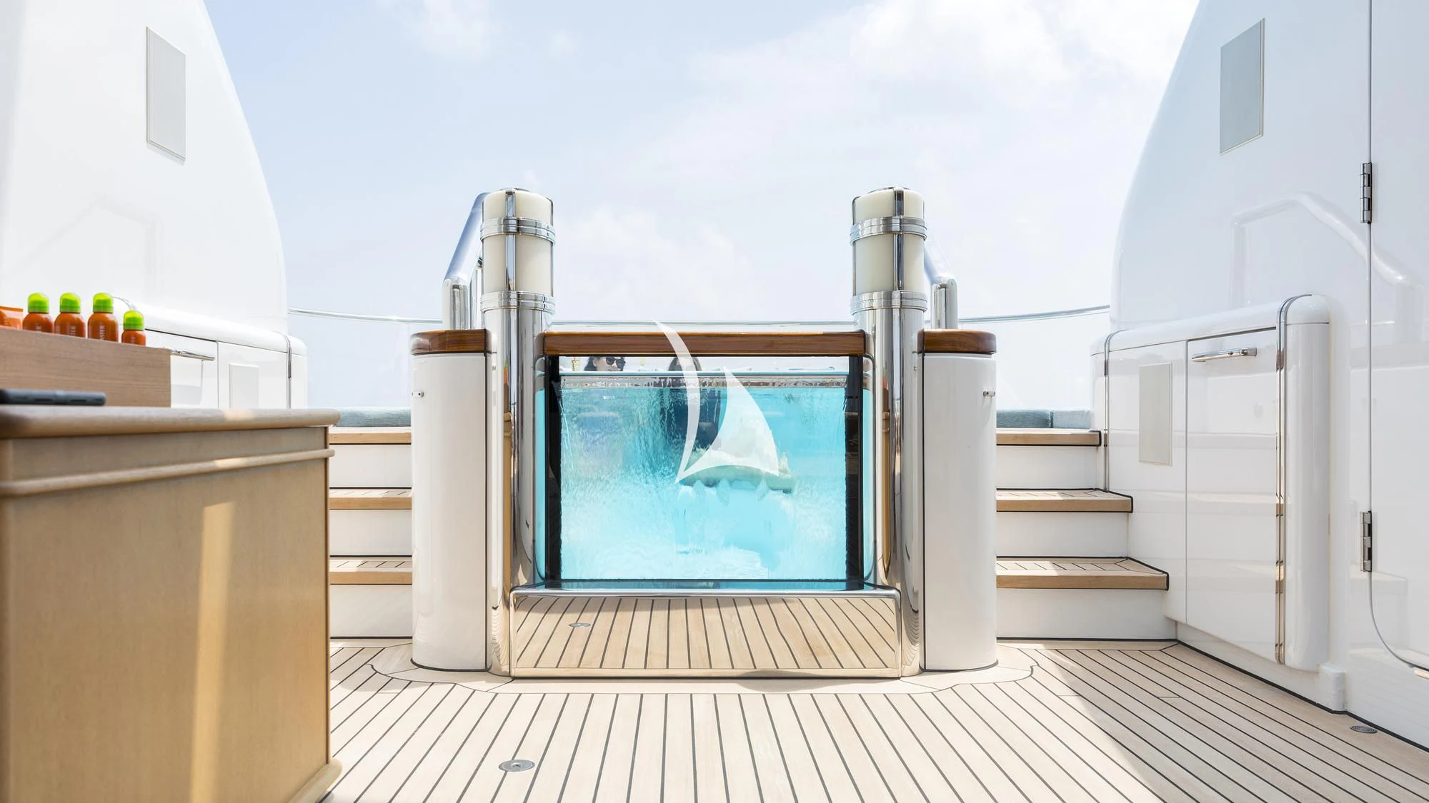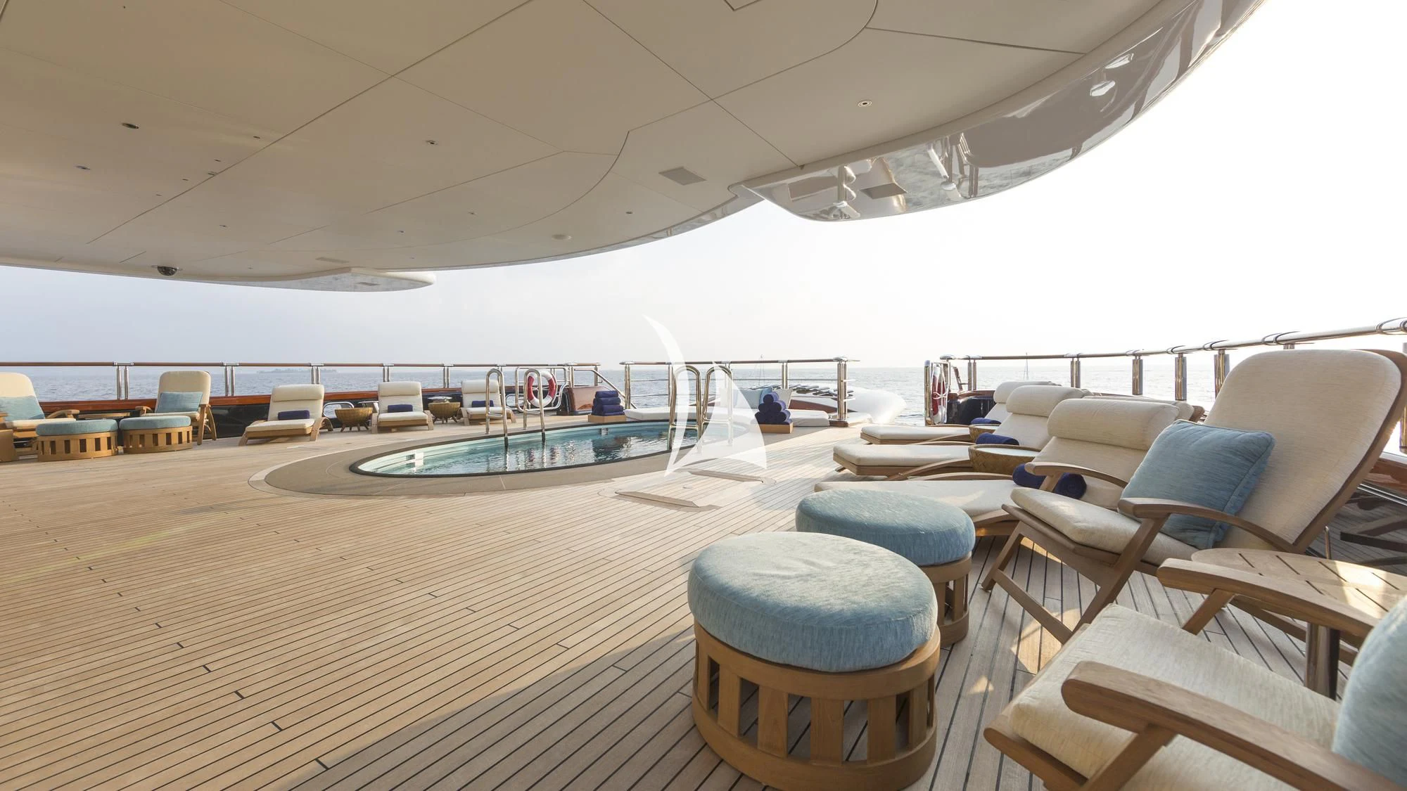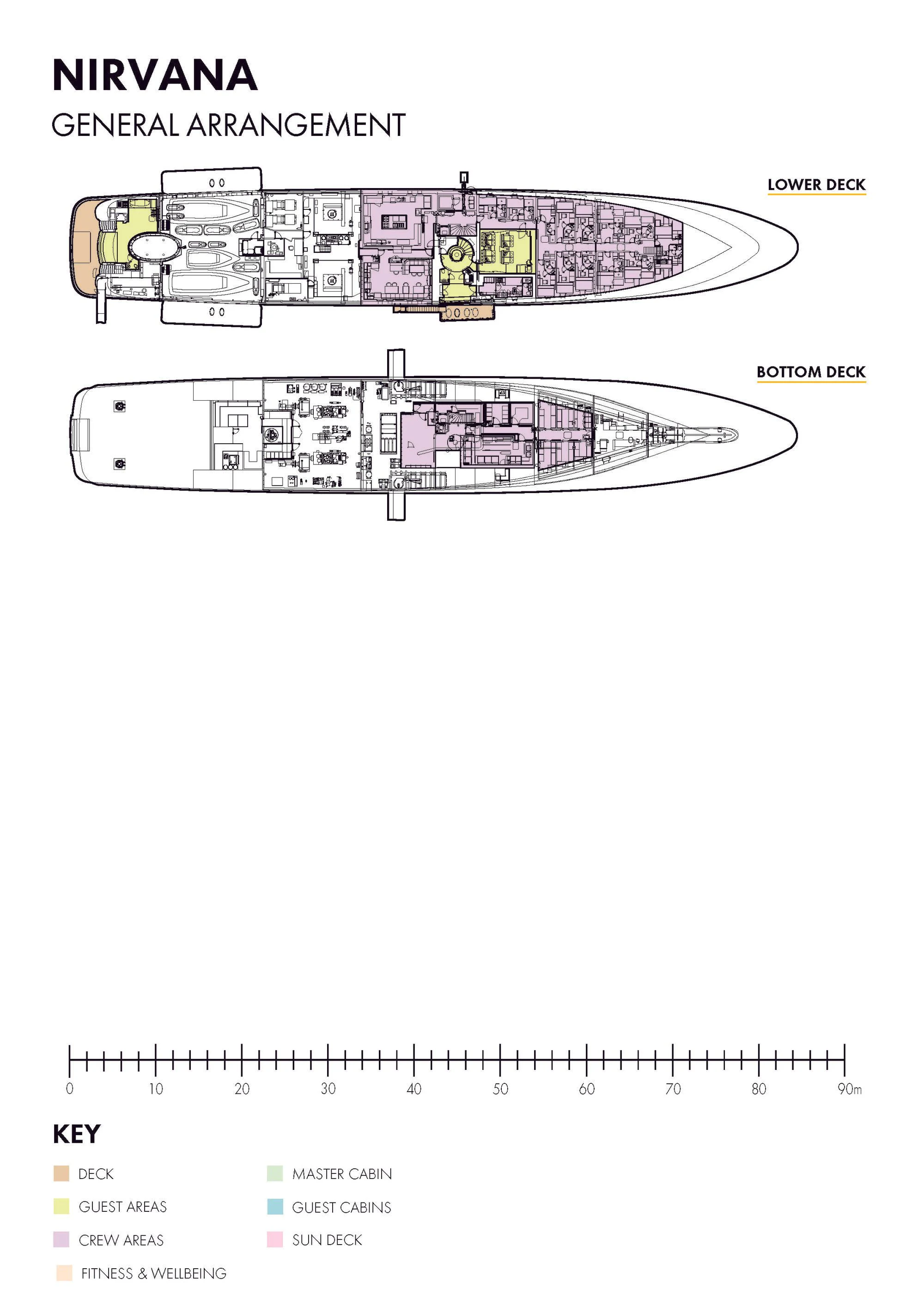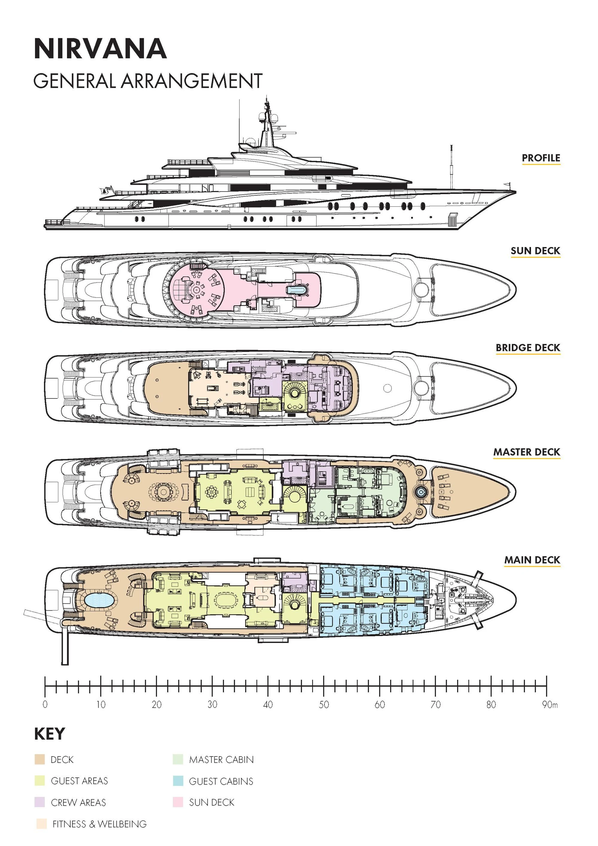 The exterior design of NIRVANA exudes sophistication and elegance. Her vast sundecks offer ample space for sunbathing or lounging while savoring panoramic oceanic views; alfresco dining areas provide the perfect setting for intimate meals under the stars; and a helipad ensures guests can arrive in style or embark on thrilling aerial adventures. Noteworthy exterior features also include an inviting swimming pool, a soothing Jacuzzi, and stabilizers for optimal comfort even when anchored.