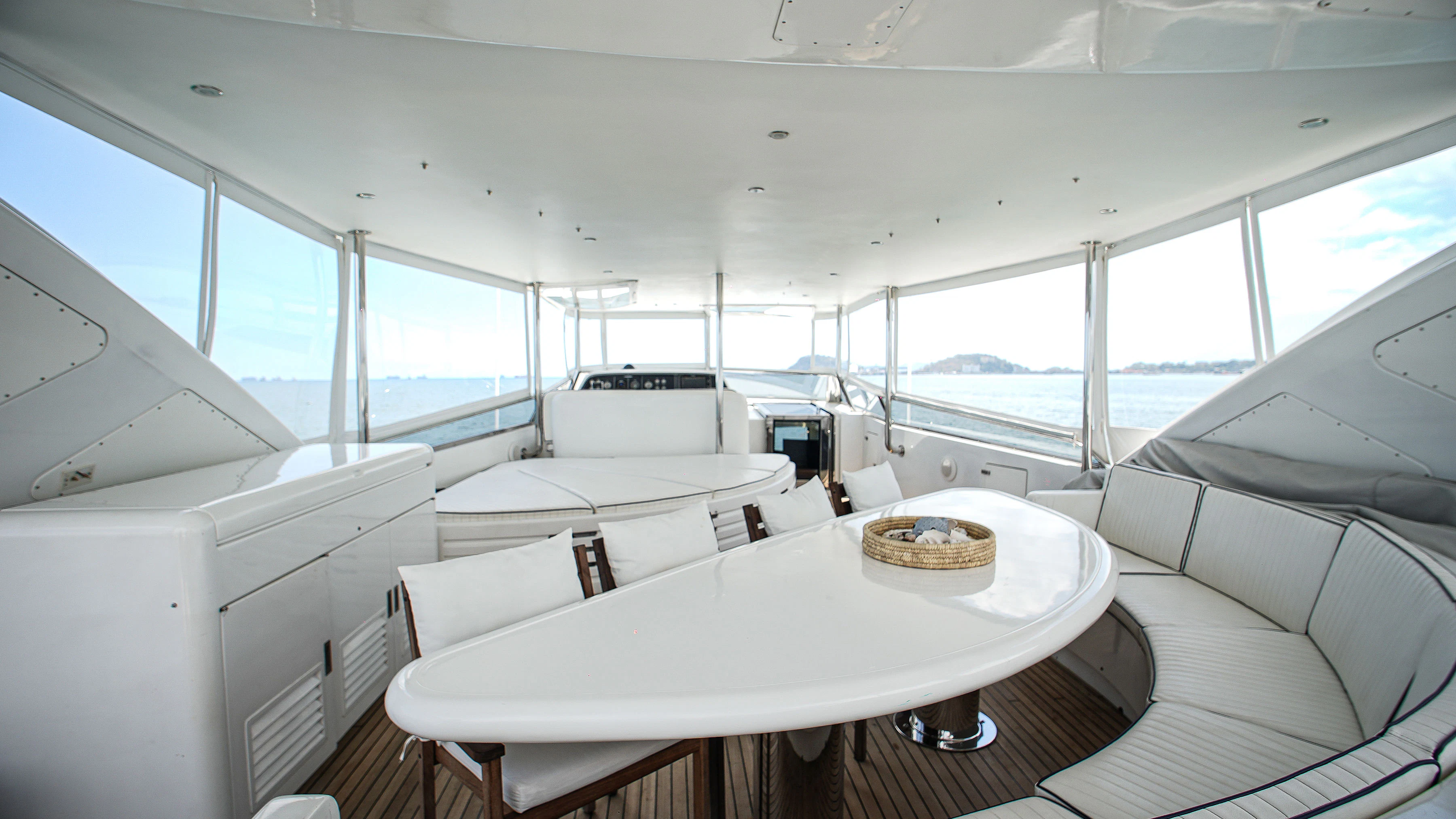 - Expansive flybridge with lounge seating, bar area, and strong charter entertaining appeal
