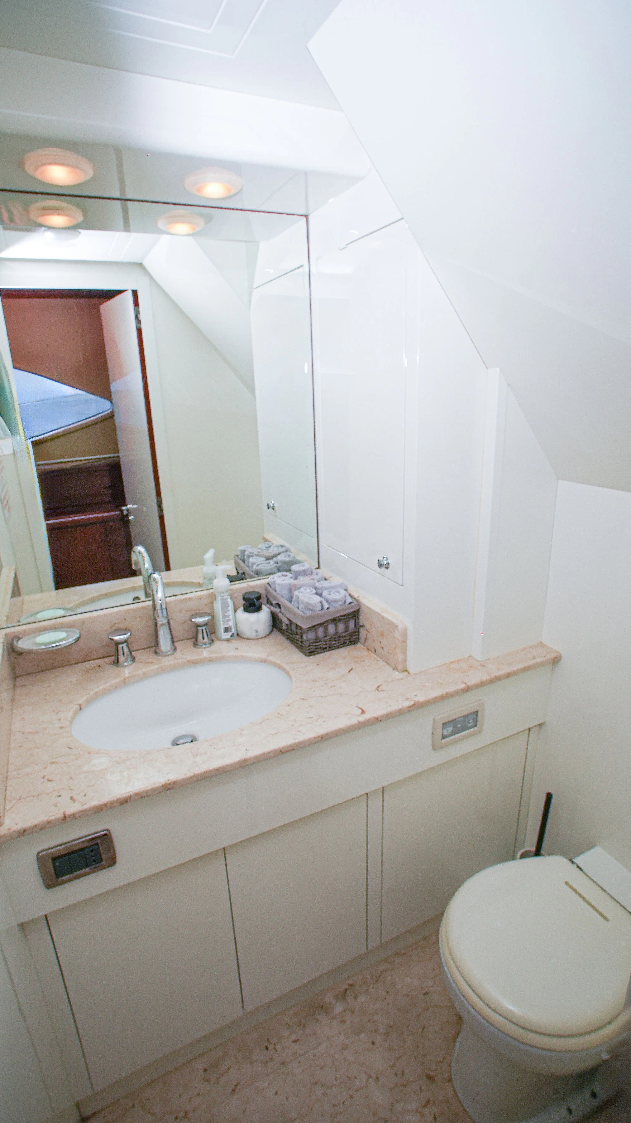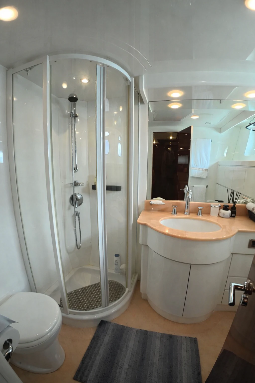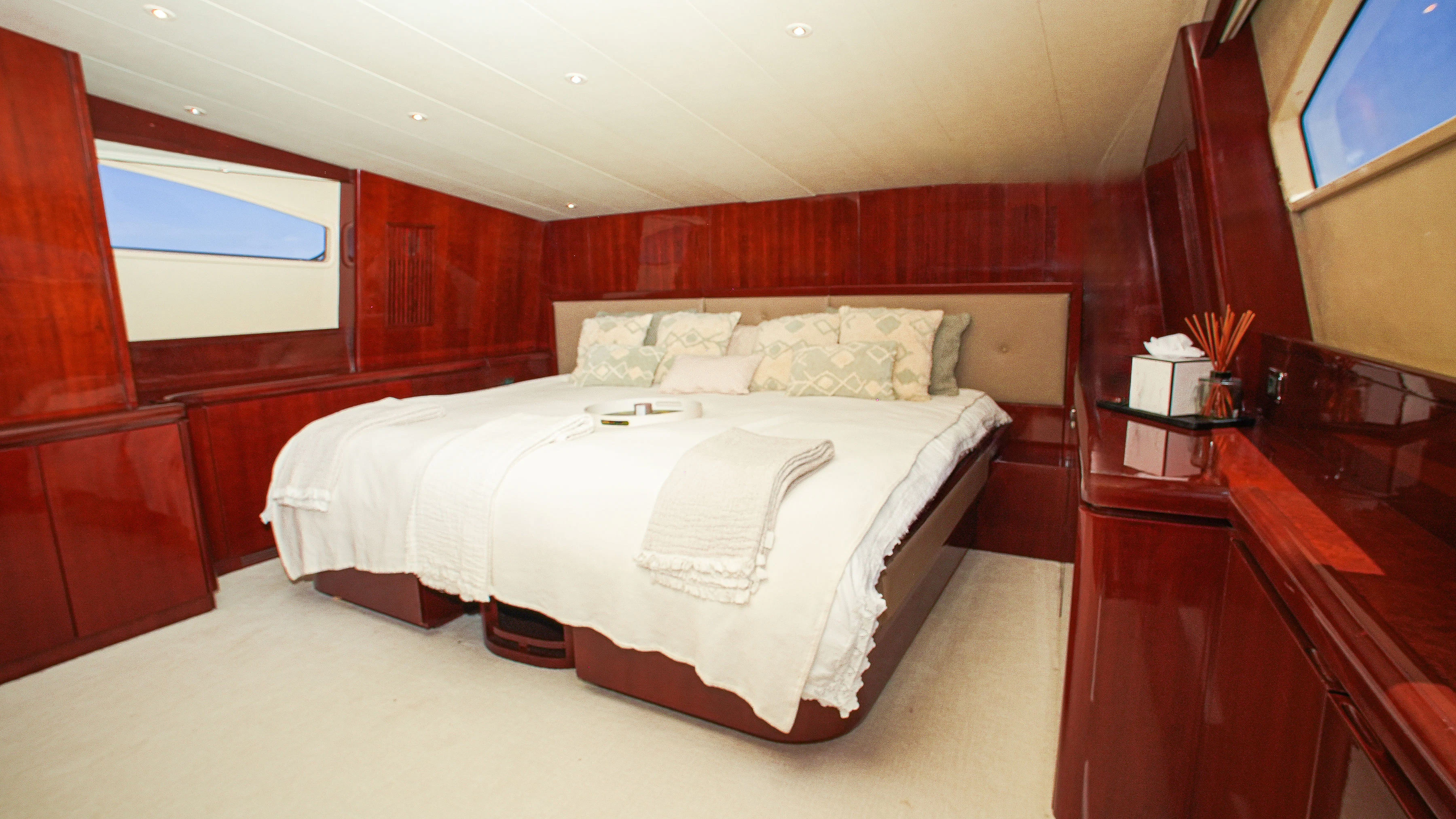 Guest accommodations include four staterooms for up to 9 guests, all located on the lower deck with dedicated en-suite bathrooms. The full-beam master stateroom aft offers generous volume, storage, and a private layout, while the guest configuration includes one VIP queen cabin and two twin cabins, one with Pullman berth, allowing flexible use for families or charter groups. Crew accommodations are arranged forward for 5-6 crew.