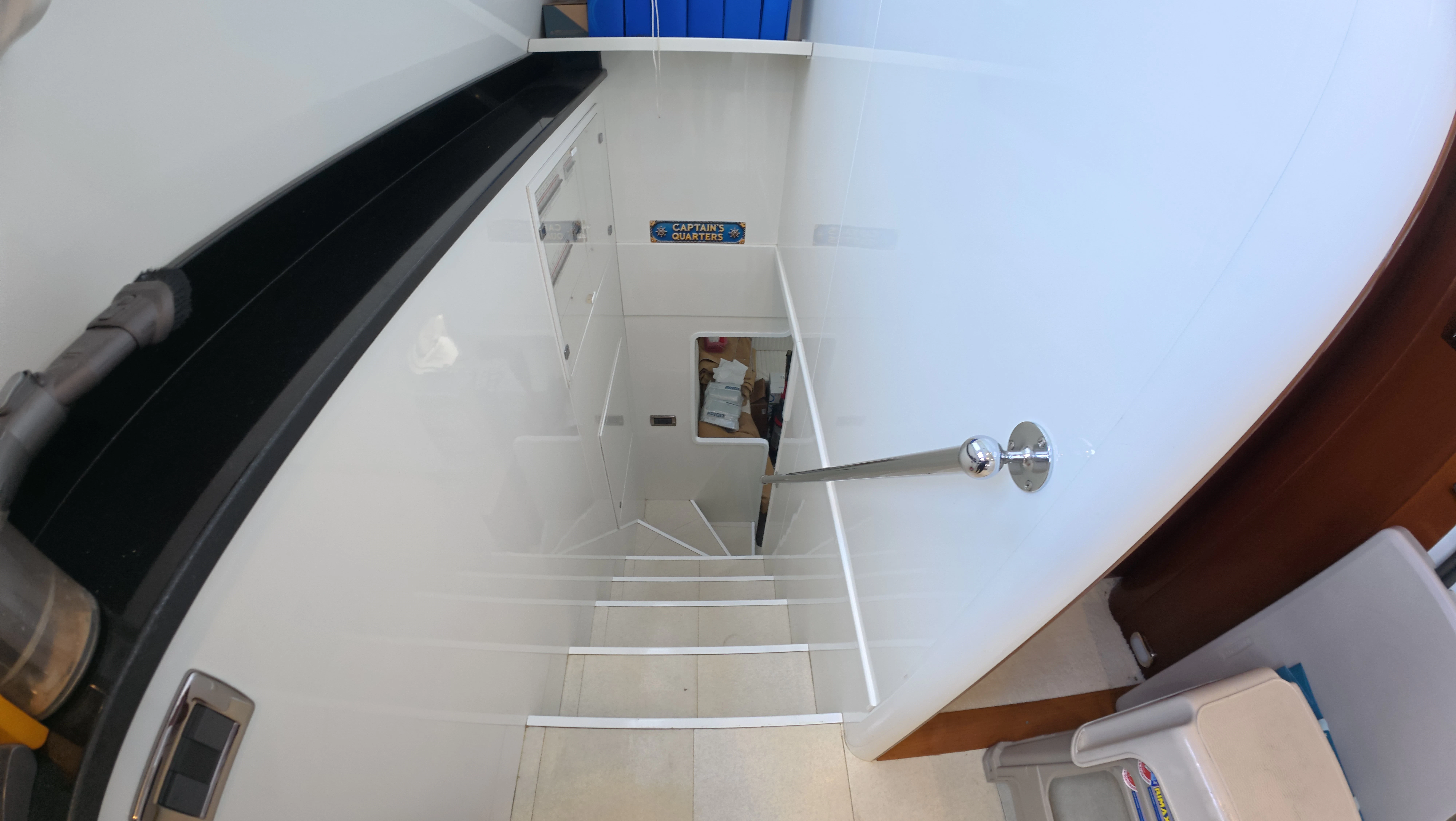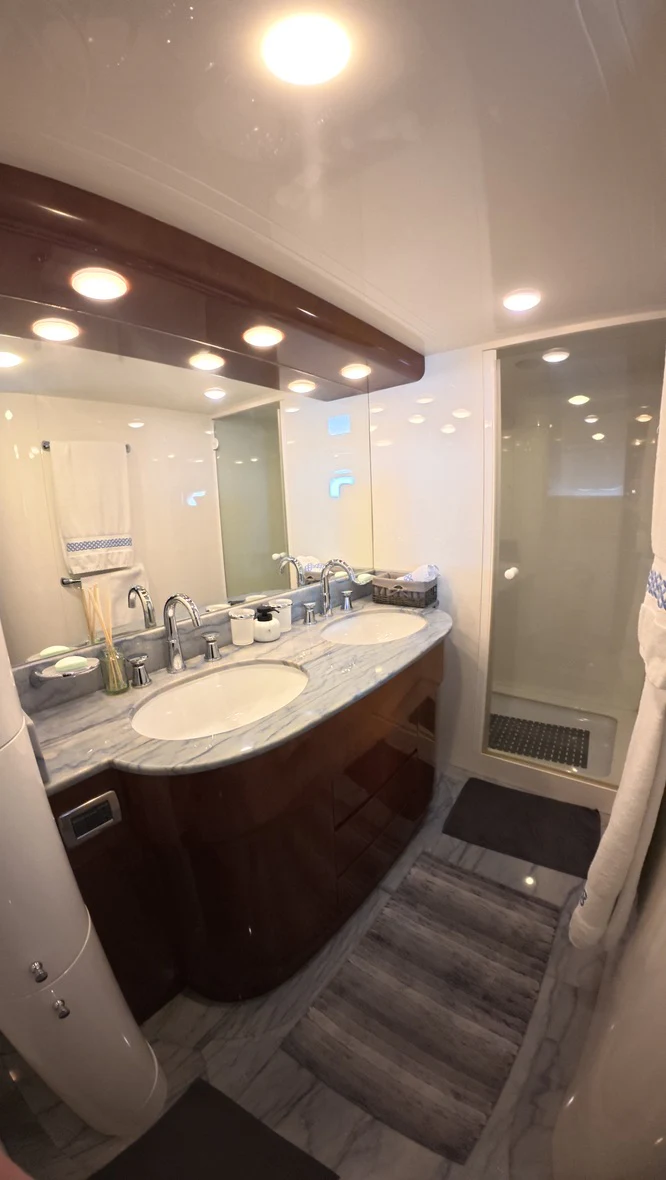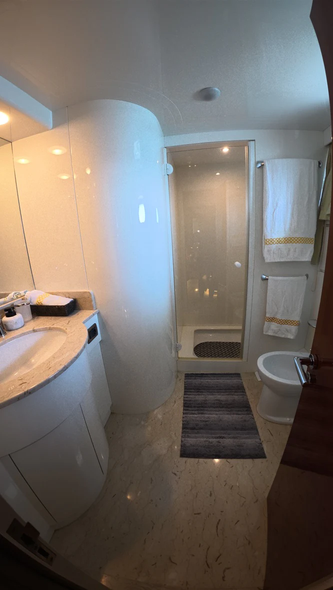 Guest accommodations include four staterooms for up to 9 guests, all located on the lower deck with dedicated en-suite bathrooms. The full-beam master stateroom aft offers generous volume, storage, and a private layout, while the guest configuration includes one VIP queen cabin and two twin cabins, one with Pullman berth, allowing flexible use for families or charter groups. Crew accommodations are arranged forward for 5-6 crew.