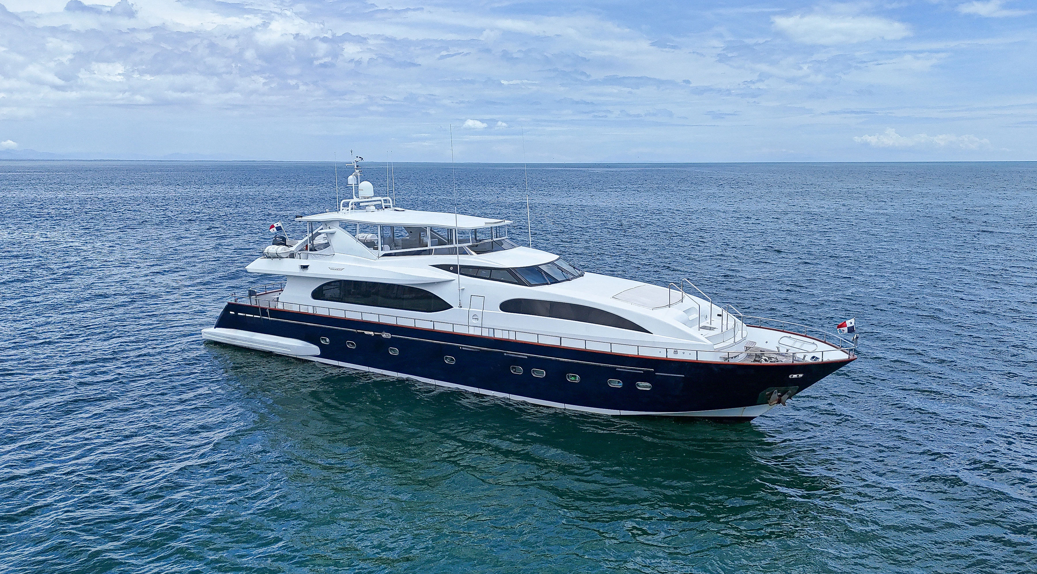 NORTHSTAR I is a 2005 102’ (31.50m) Cantieri Navali Falcon 102 Flybridge built in Italy, offering a performance-oriented raised pilothouse flybridge motor yacht platform with a versatile four-stateroom layout and recent mechanical upgrades. She is located in Panama and presents the opportunity for private ownership or charter use, supported by both port and starboard Kohler 28kW generators replaced in 2025, recent A/C chiller system repair with new compressor installation, and a preventative maintenance program completed in 2026.