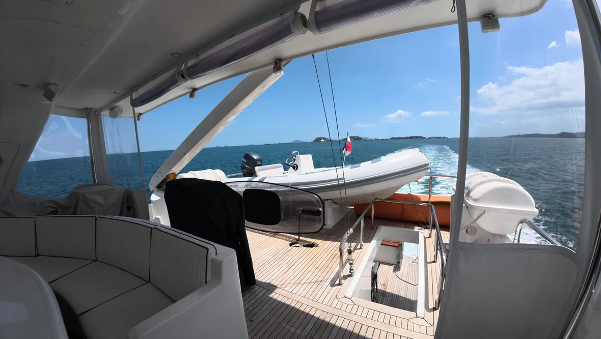 The yacht’s exterior spaces are anchored around a guest-friendly layout with strong circulation between decks. The aft deck provides a dedicated alfresco dining and gathering space with direct access to the salon and side decks. Her flybridge is the center of entertainment, with a helm station, lounge seating, a bar/entertaining area, and sun lounging space. Forward, the foredeck offers sunpad lounging and open views, while the swim platform supports water access, tender operations, and watersports use. Equipment includes inflatable tender, paddleboards, floating island, beach chairs, and more.