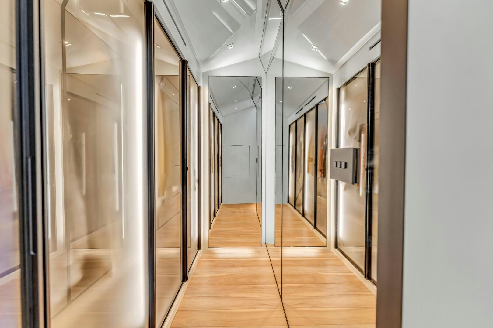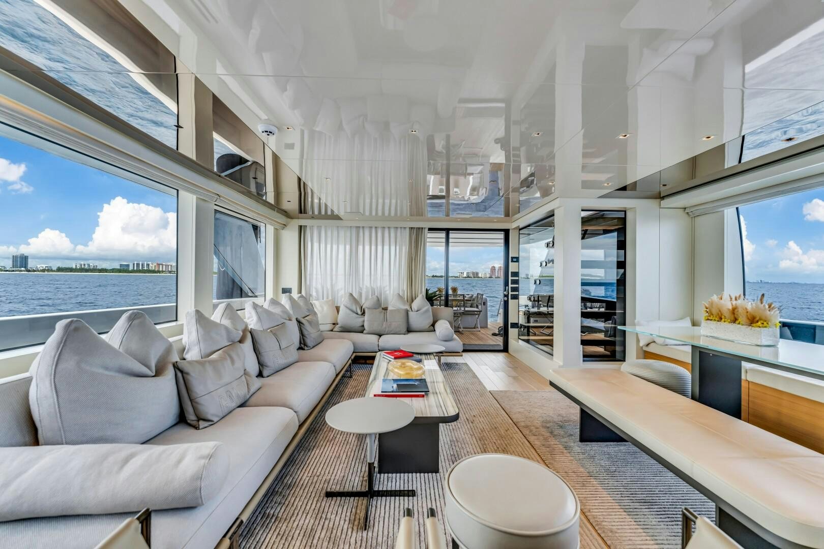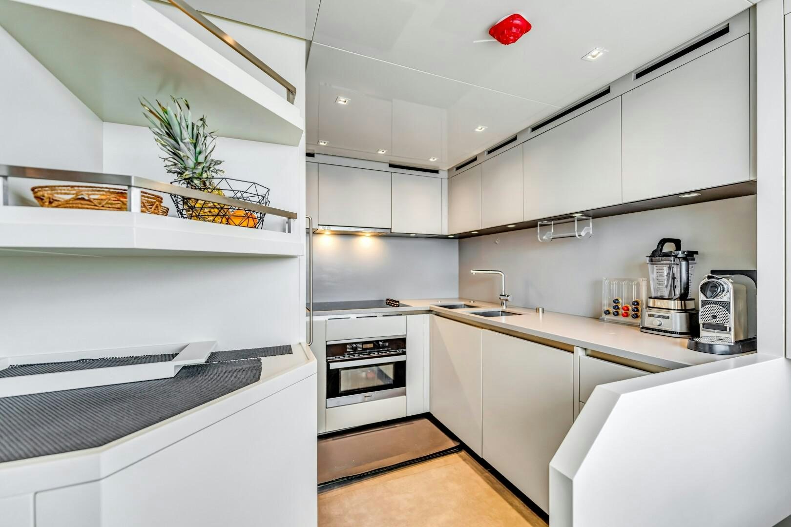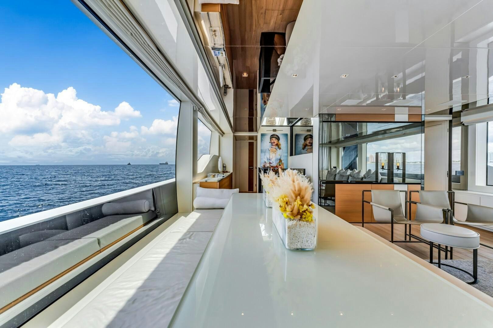 Inside, Marty Lowe’s interior design brings a cool, modern edge with a focus on clean lines and natural light. The main salon is open and inviting, featuring floor-to-ceiling windows and a drop-down bulwark on the port side, creating an uninterrupted connection to the sea. High-end furnishings from Poltrona Frau, Minotti, and Bonaldo give the space a refined yet relaxed feel. A formal dining table for eight sits at the heart of the salon, while parquet flooring and a sleek, fully equipped bar add to the yacht’s effortless luxury. Forward, a day head adds extra convenience. The galley is finished with Silestone Kensho suede countertops and backsplash, offering a minimal, polished aesthetic.