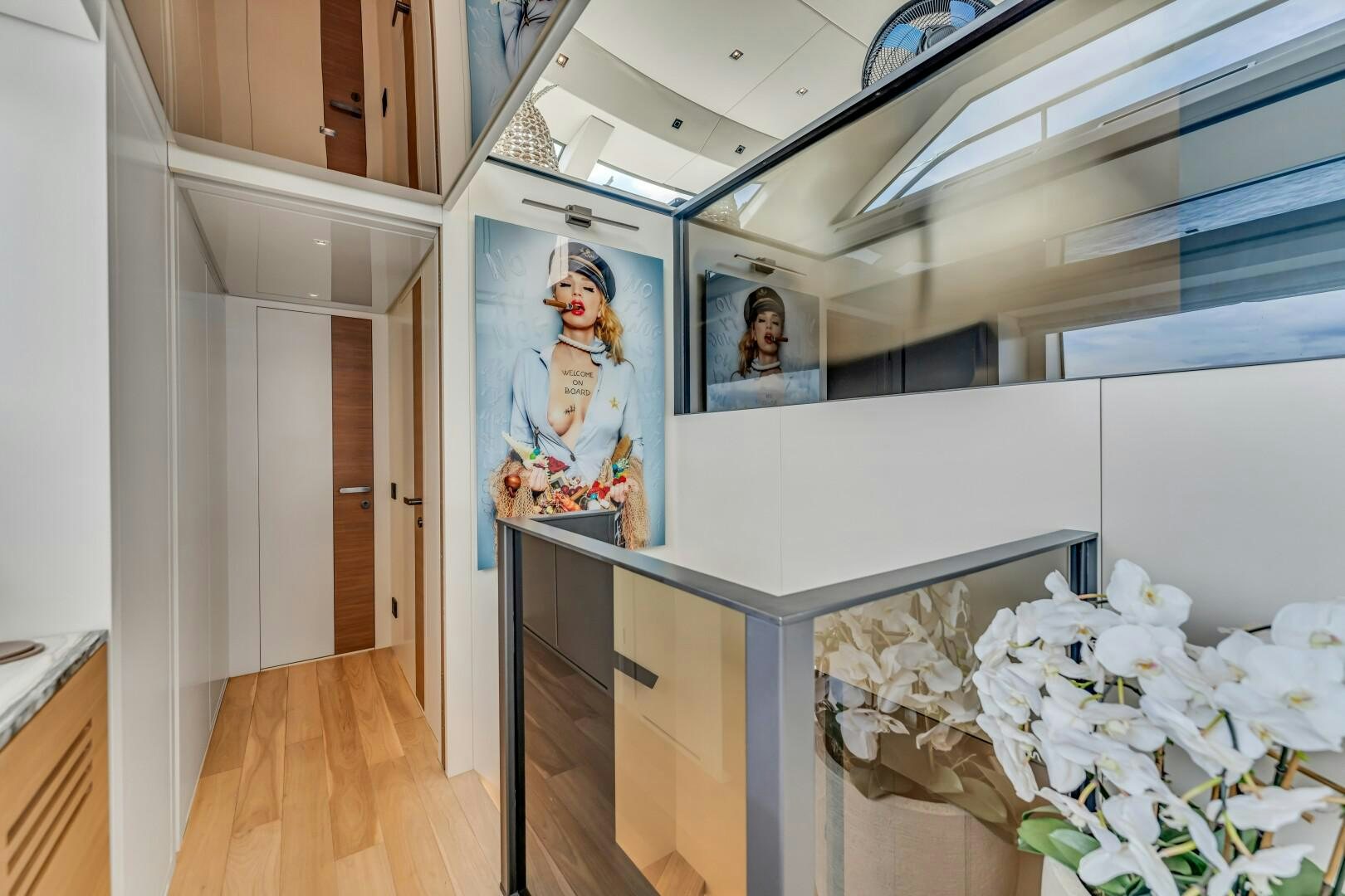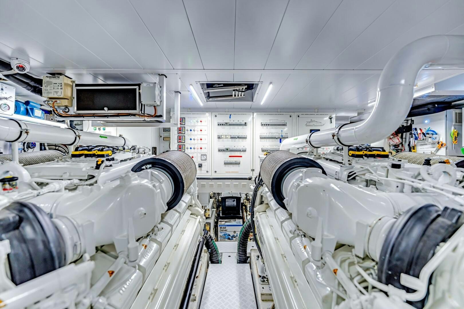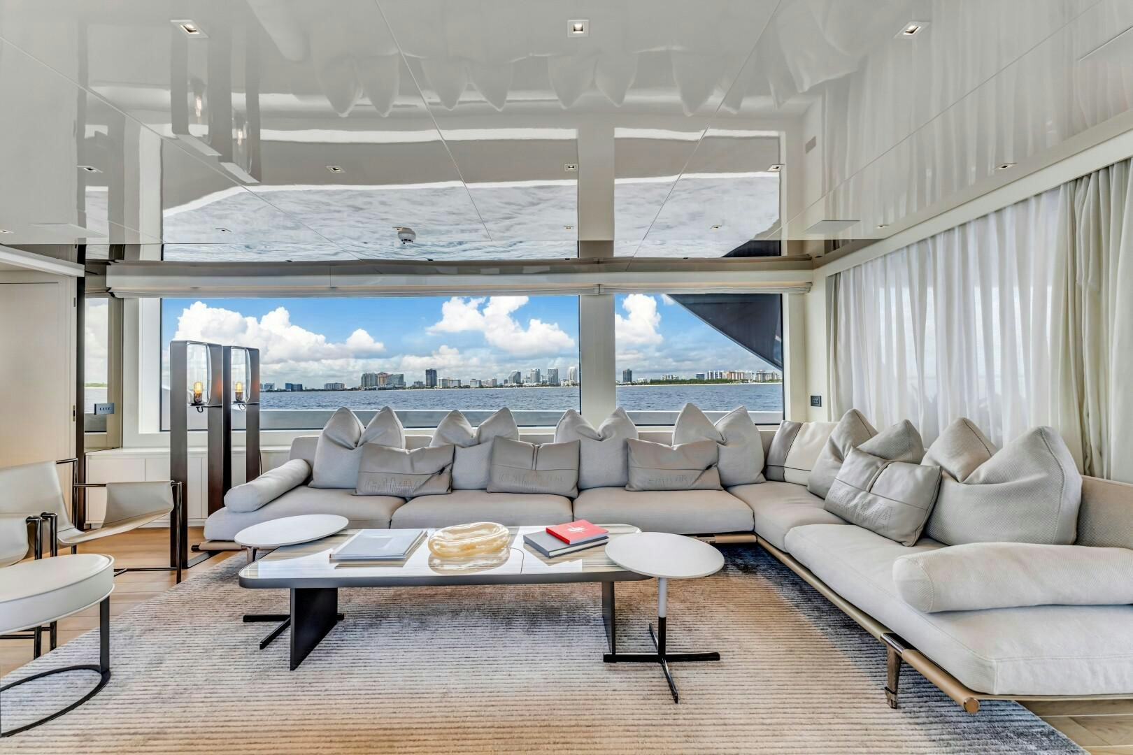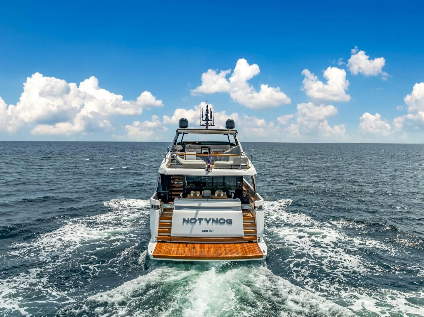 For water access and storage, NOTYNOG is fully equipped. A tender garage keeps toys neatly stowed, while the hydraulic swim platform provides effortless access to the sea. Bow and stern thrusters make docking easy, and the state-of-the-art AV package keeps entertainment seamless. With low engine hours, upgraded systems, and a turnkey, well-maintained condition, NOTYNOG is an ideal yacht for an owner who wants modern, fast, and effortlessly cool.
