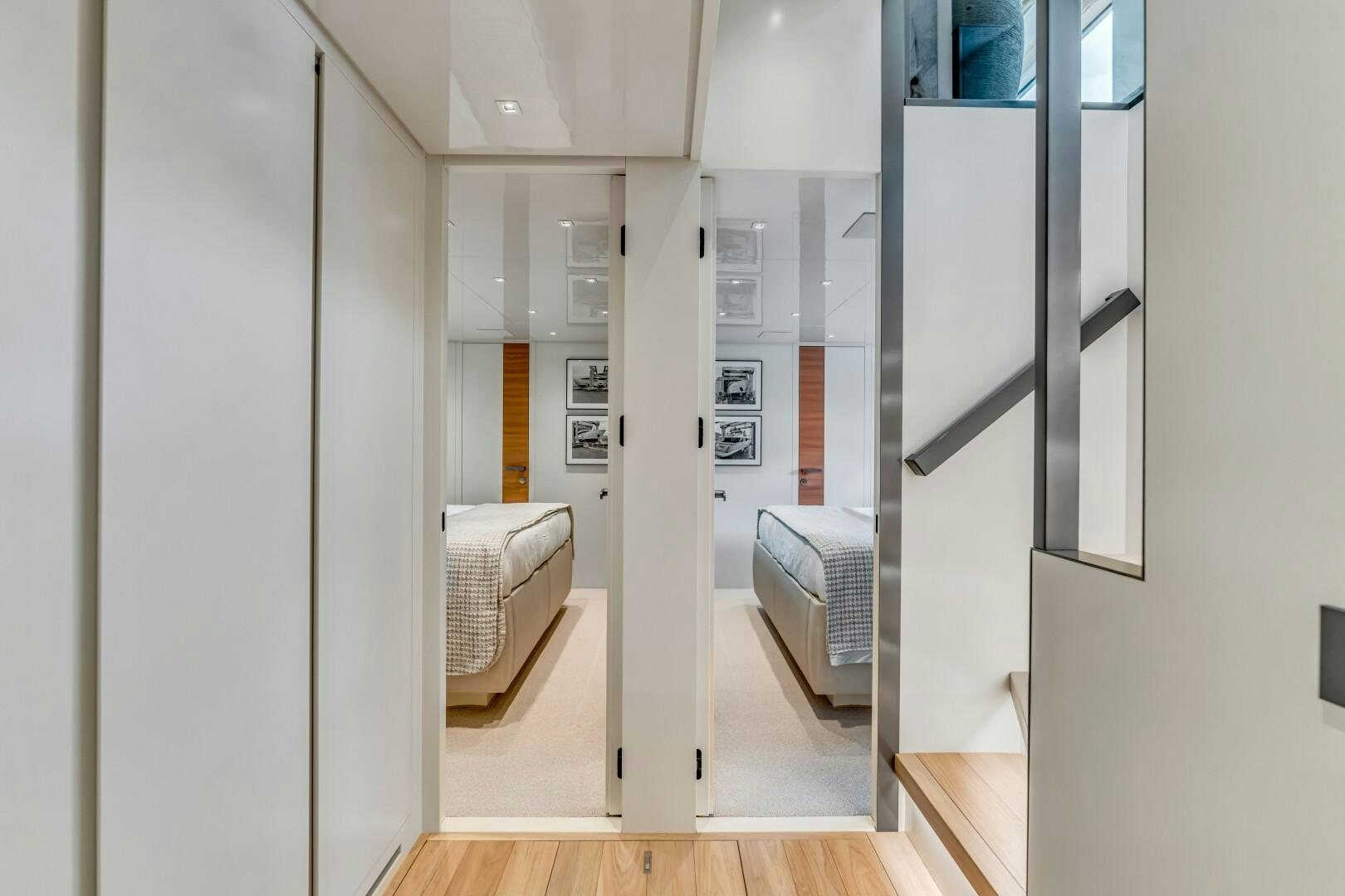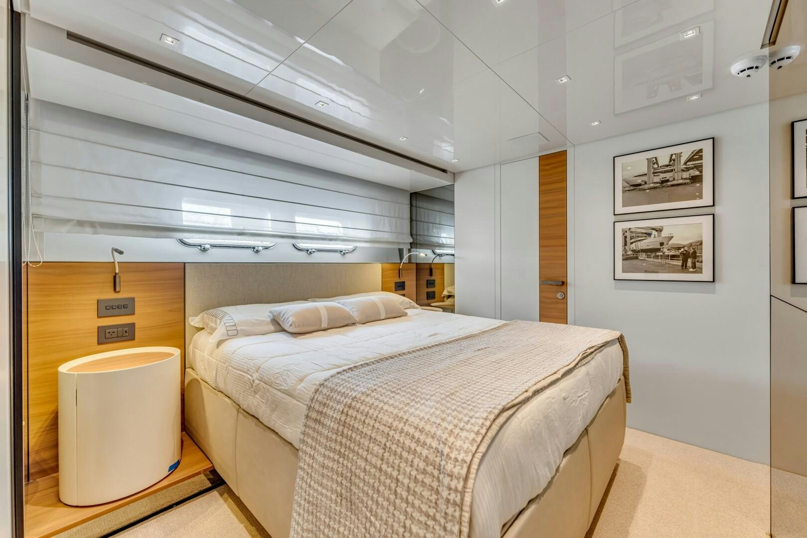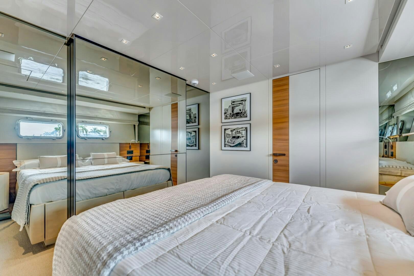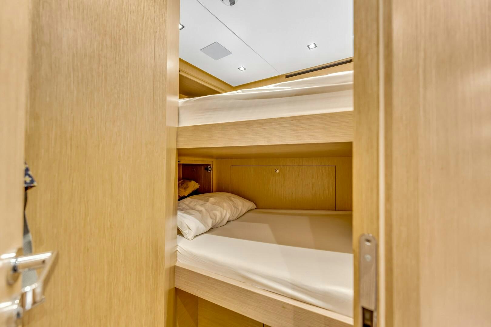 NOTYNOG accommodates eight guests across four well-appointed staterooms. The main deck master suite is private and spacious, featuring a king-size bed, walk-in closet, electric skylight, blackout shades, and custom Italian linens. The ensuite bathroom is sleek and functional. Below deck, the VIP suite features a queen bed with an ensuite, while two double guest cabins provide comfortable accommodations. The crew quarters include two bunk cabins for a total of four crew members, plus a dedicated crew mess to optimize workflow.