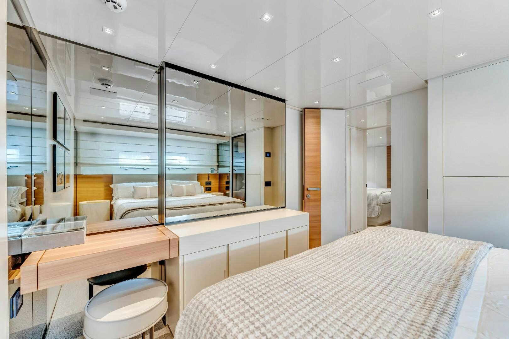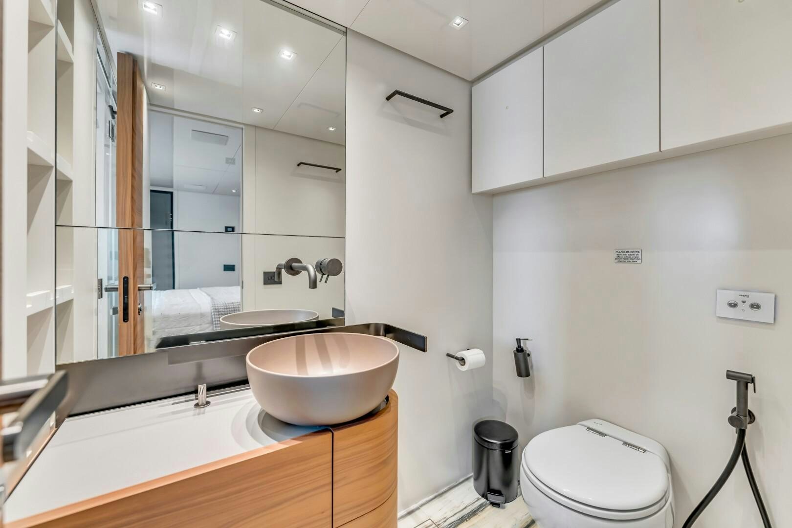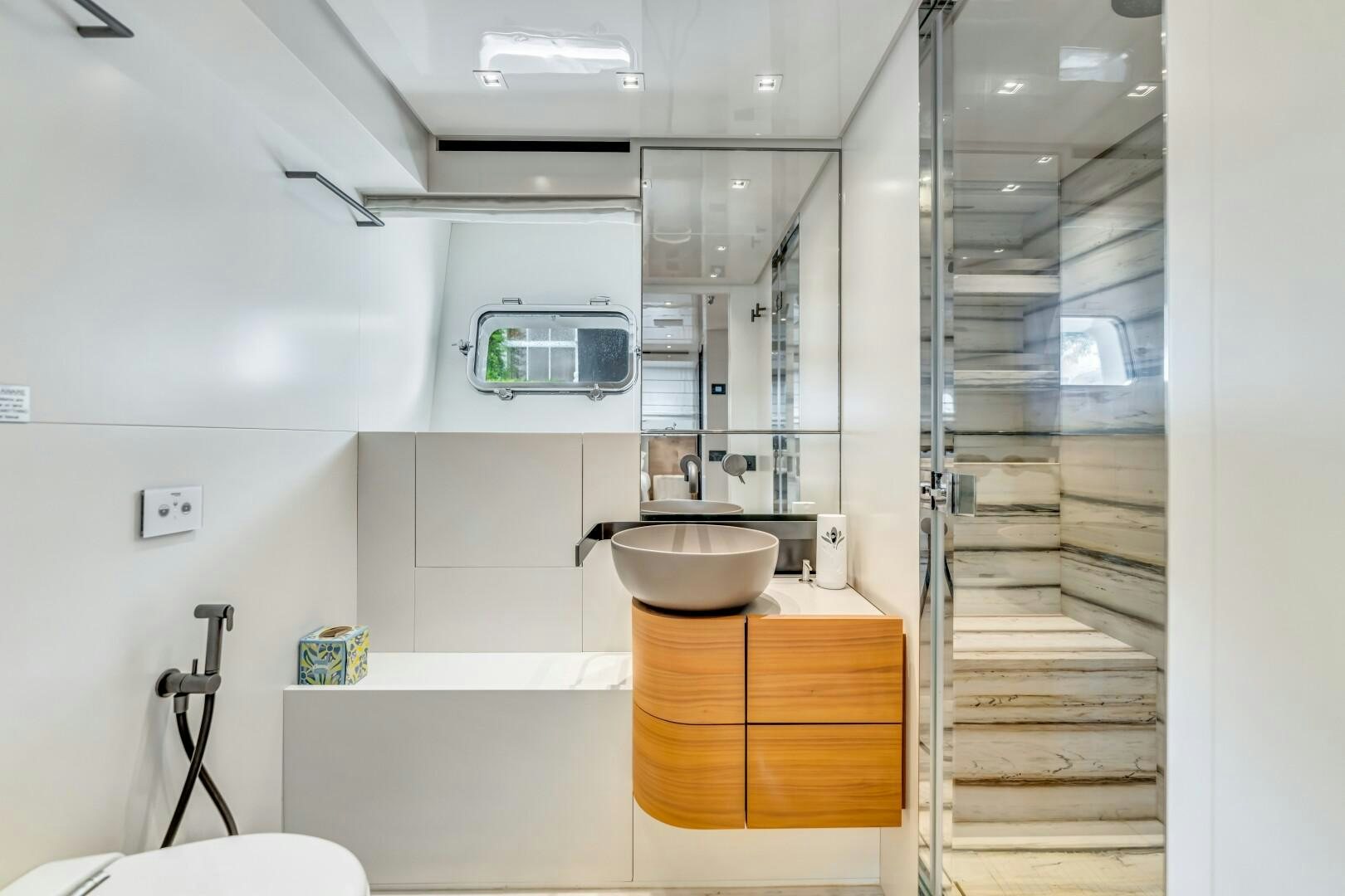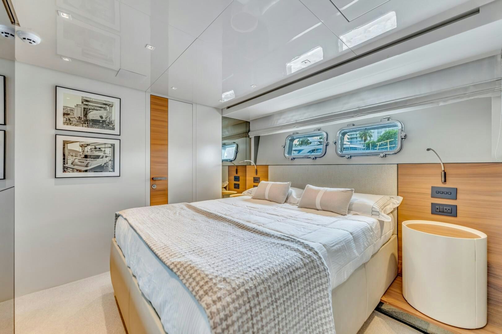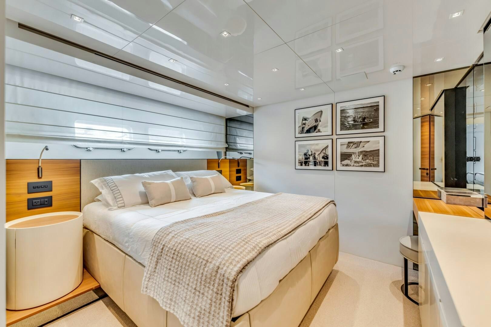 NOTYNOG accommodates eight guests across four well-appointed staterooms. The main deck master suite is private and spacious, featuring a king-size bed, walk-in closet, electric skylight, blackout shades, and custom Italian linens. The ensuite bathroom is sleek and functional. Below deck, the VIP suite features a queen bed with an ensuite, while two double guest cabins provide comfortable accommodations. The crew quarters include two bunk cabins for a total of four crew members, plus a dedicated crew mess to optimize workflow.