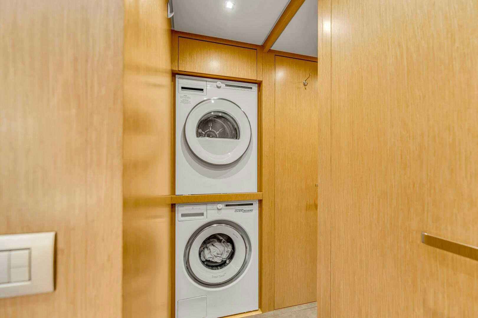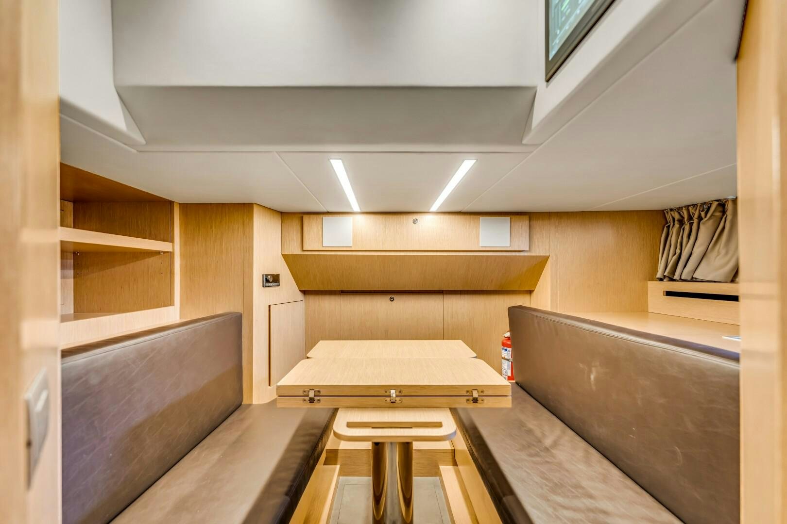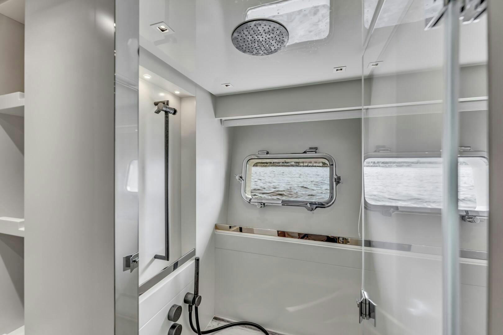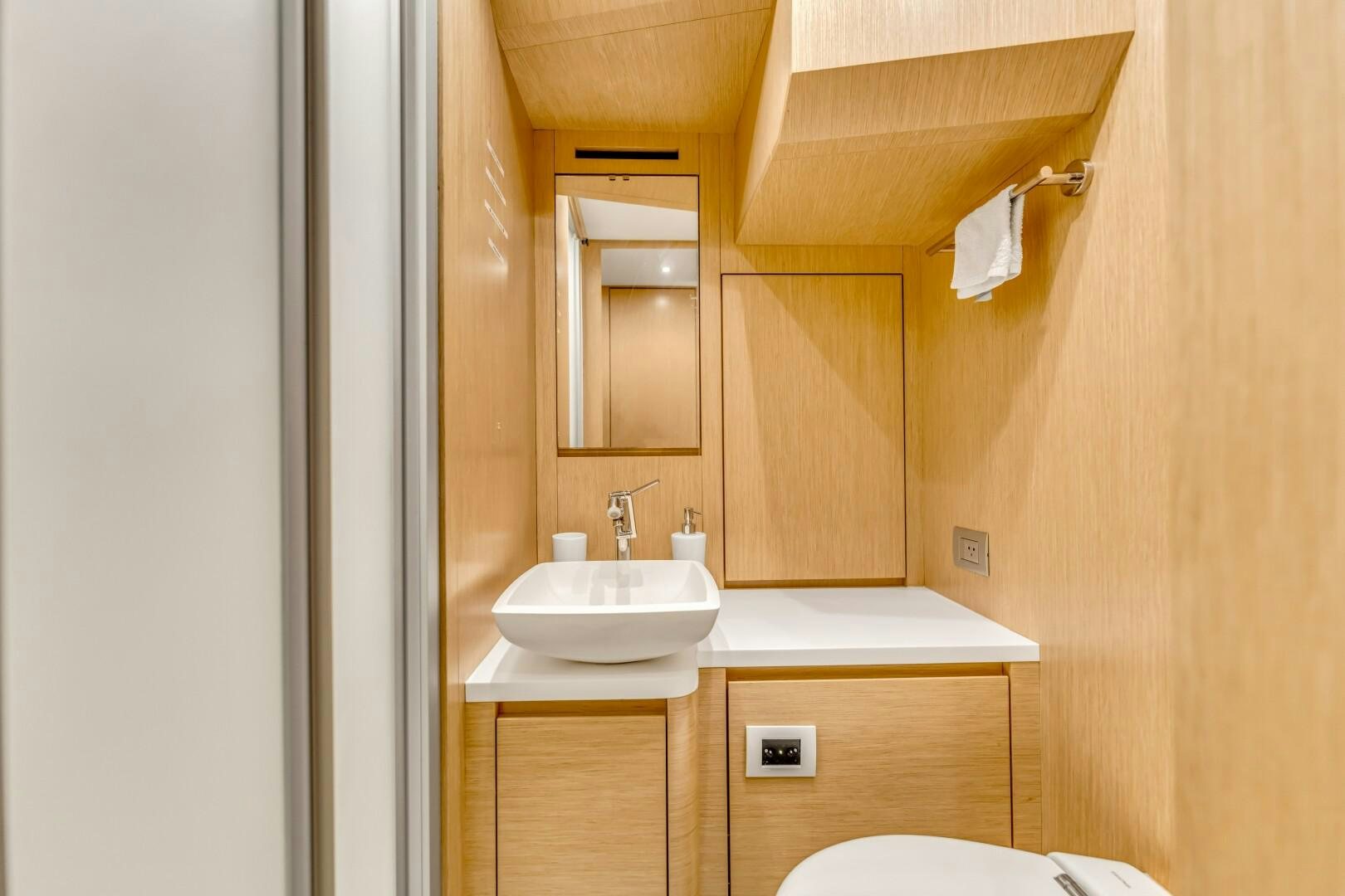 NOTYNOG accommodates eight guests across four well-appointed staterooms. The main deck master suite is private and spacious, featuring a king-size bed, walk-in closet, electric skylight, blackout shades, and custom Italian linens. The ensuite bathroom is sleek and functional. Below deck, the VIP suite features a queen bed with an ensuite, while two double guest cabins provide comfortable accommodations. The crew quarters include two bunk cabins for a total of four crew members, plus a dedicated crew mess to optimize workflow.