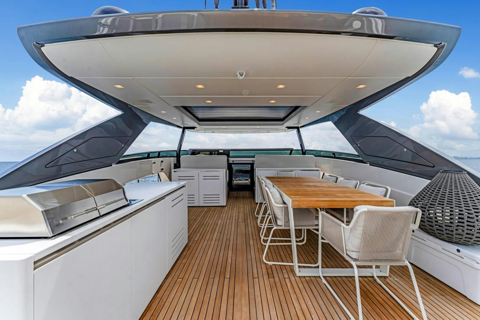 On deck, NOTYNOG is built for entertainment. Zuccon International Project designed her exterior to balance relaxation and sportiness. The flybridge is a standout space, featuring upgraded Roda, Paola Lenti, and Tribu furnishings, a dining table for eight, a lounge area, sunbeds, and a built-in bar with a fridge, ice maker, and sink. A hardtop with an electric louvered roof offers flexible shade. Accessible via both internal and external staircases, the flybridge helm station keeps the captain in the heart of the action. The foredeck is designed for unwinding, with sunpads and a lounge-style seating area with a table.