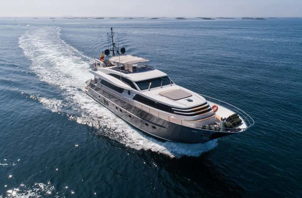 The exterior design of O NOSO UNO is nothing short of awe-inspiring, boasting sleek lines and modern aesthetics that are sure to turn heads wherever she sails. Her high-speed capabilities are equally impressive; powered by three Volvo Penta engines each delivering an astounding power output of 900 hp / 671 kW, she can reach cruising speeds up to a brisk pace of 13 knots and boasts a maximum speed that tops off at an exhilarating rate of 25 knots.